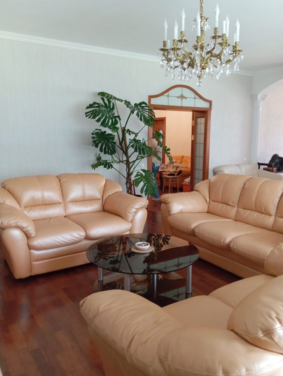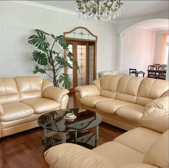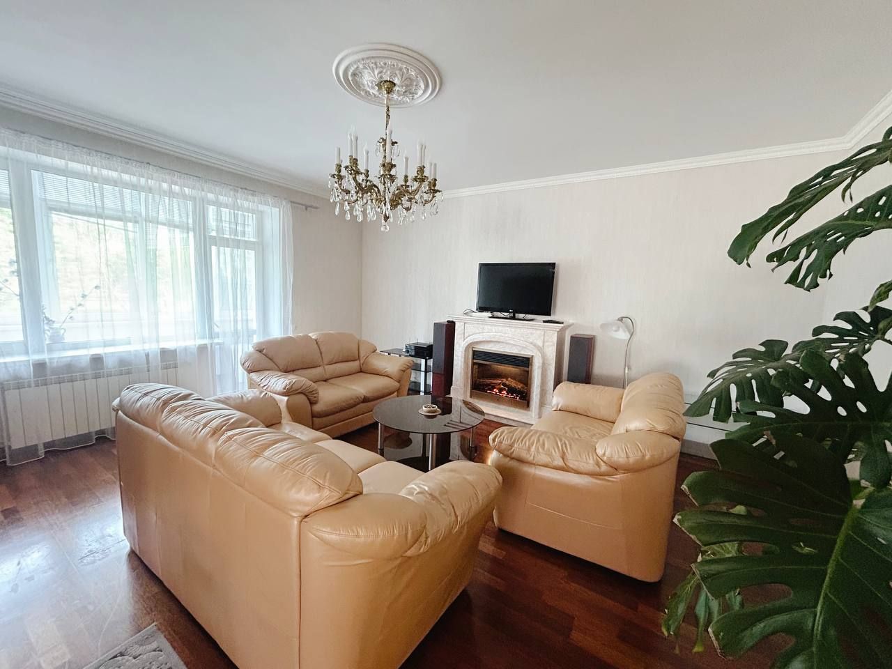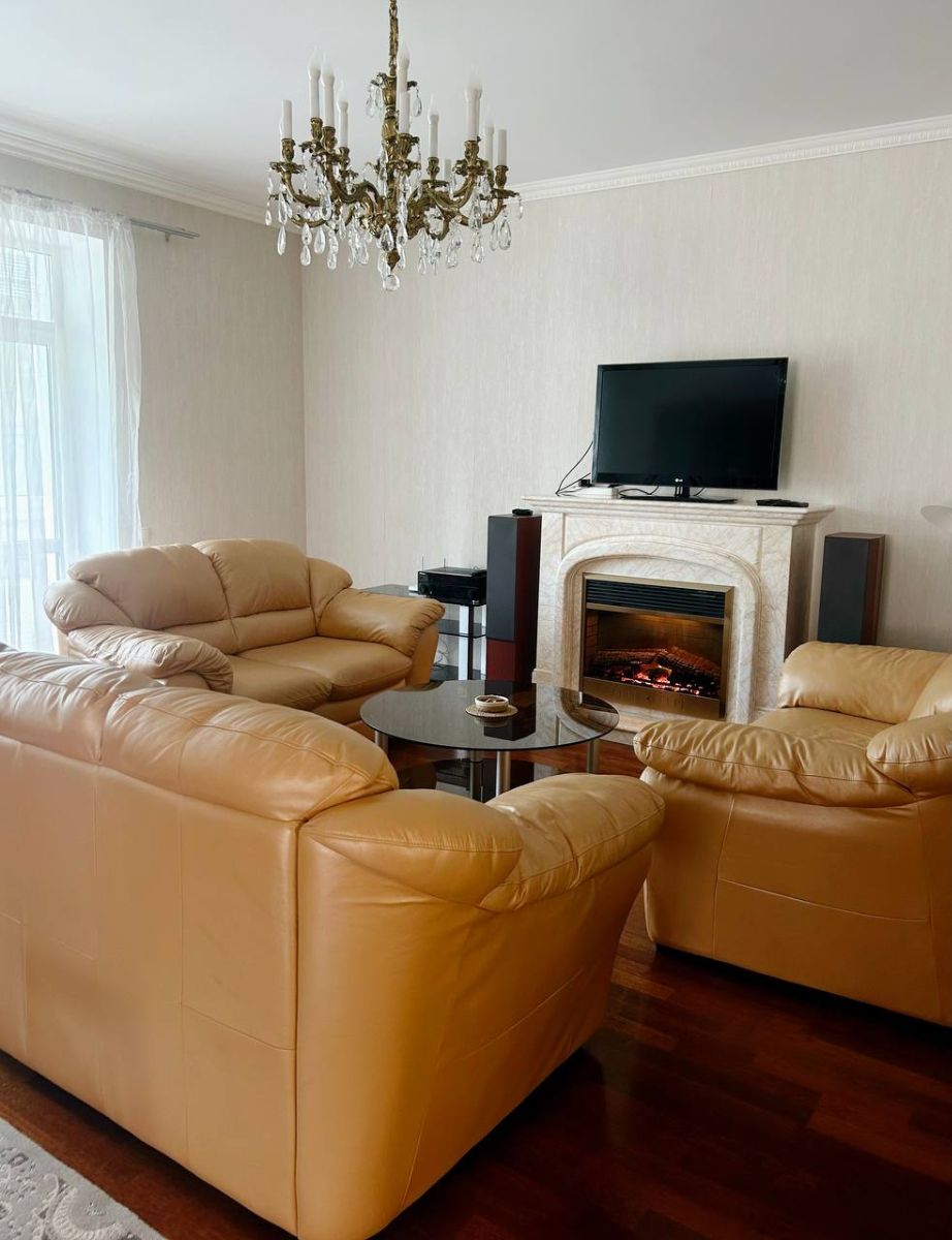 Большая гостиная с шикарными кожаными диванами, телевизором и электрокамином, который создает уютную атмосферу зимними вечерами. Здесь Вы можете провести время с семьей или насладиться бокалом вина. Интерьер украшен люстрами, арками и колоннами в классическом стиле.