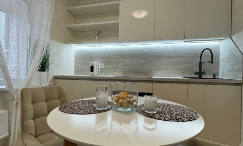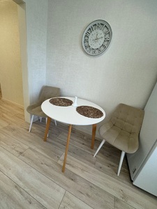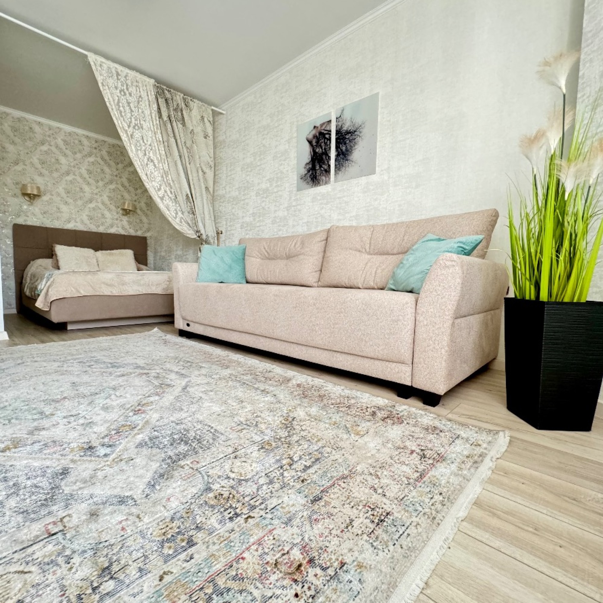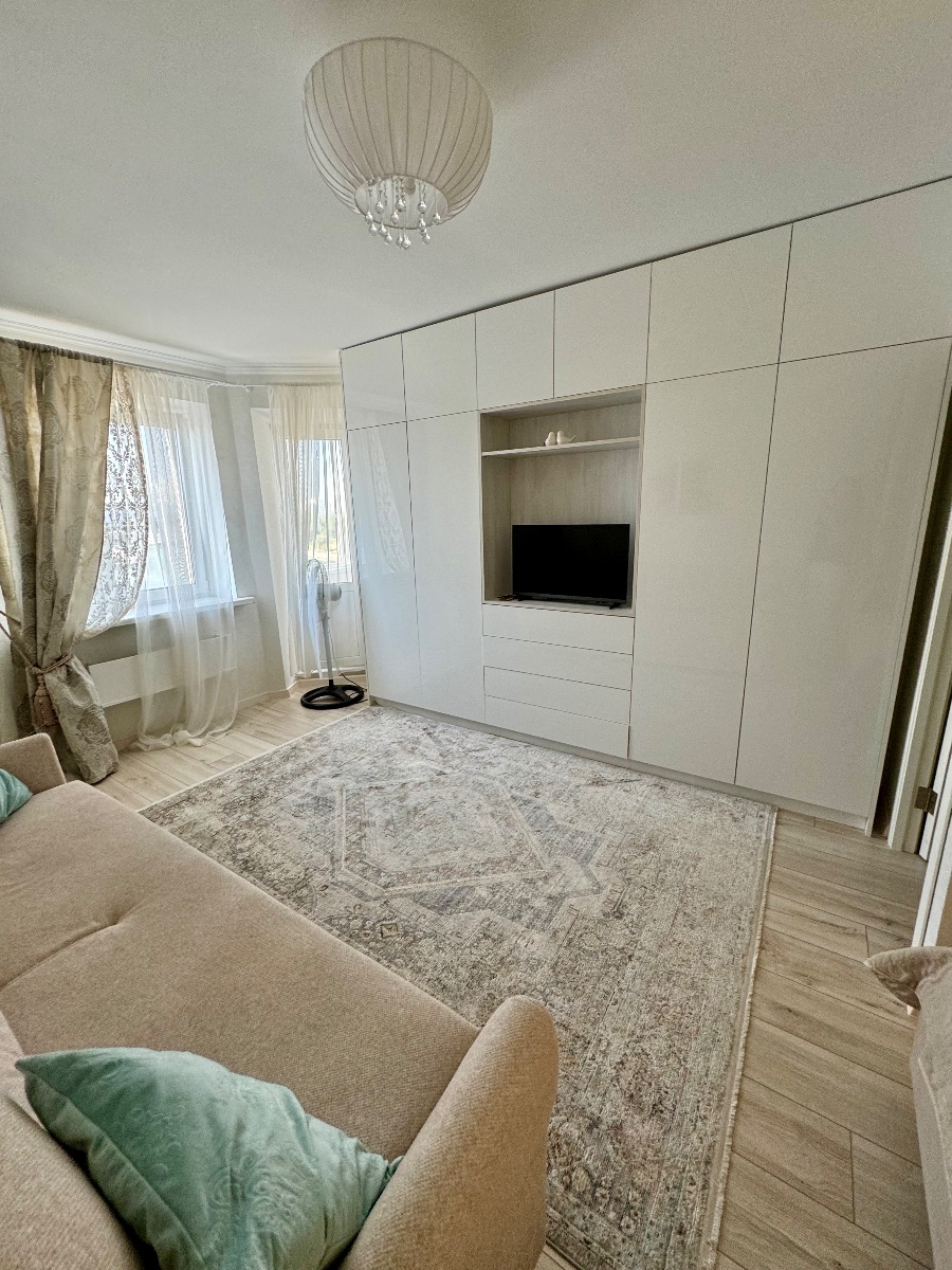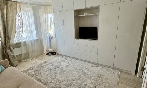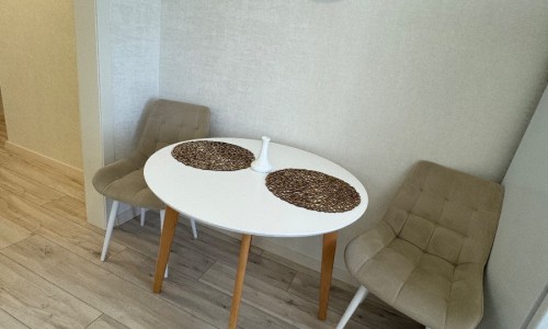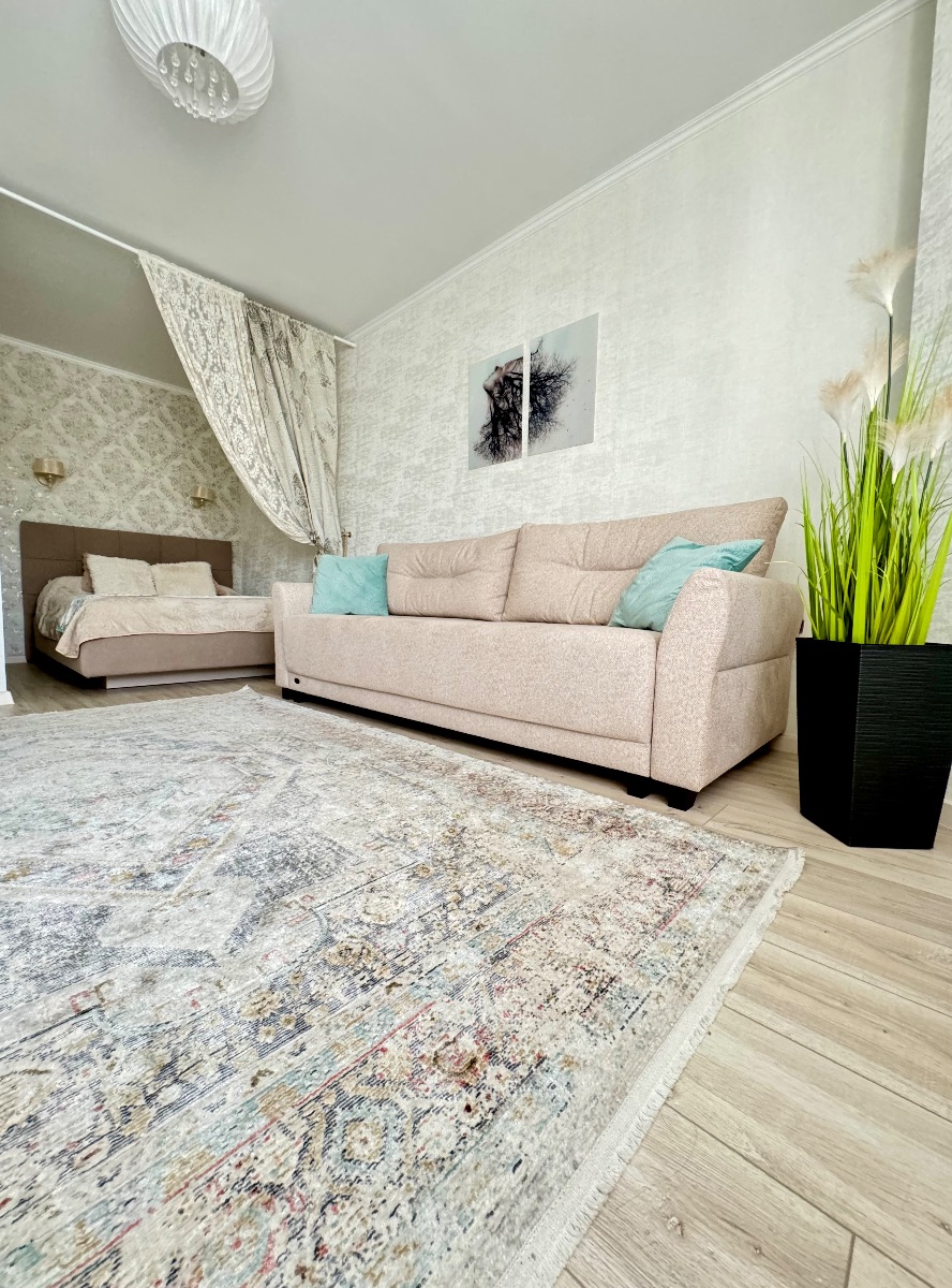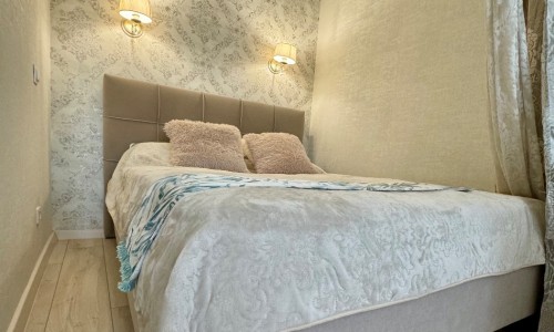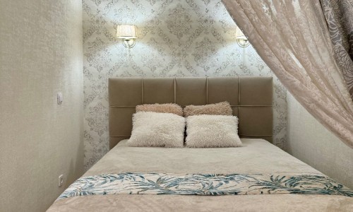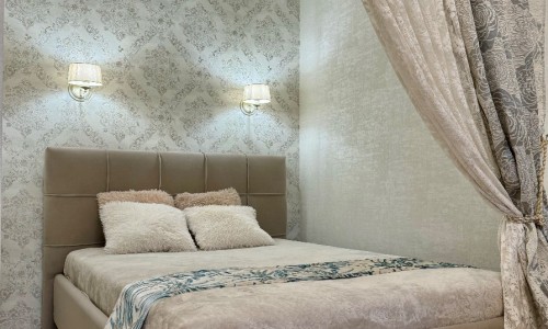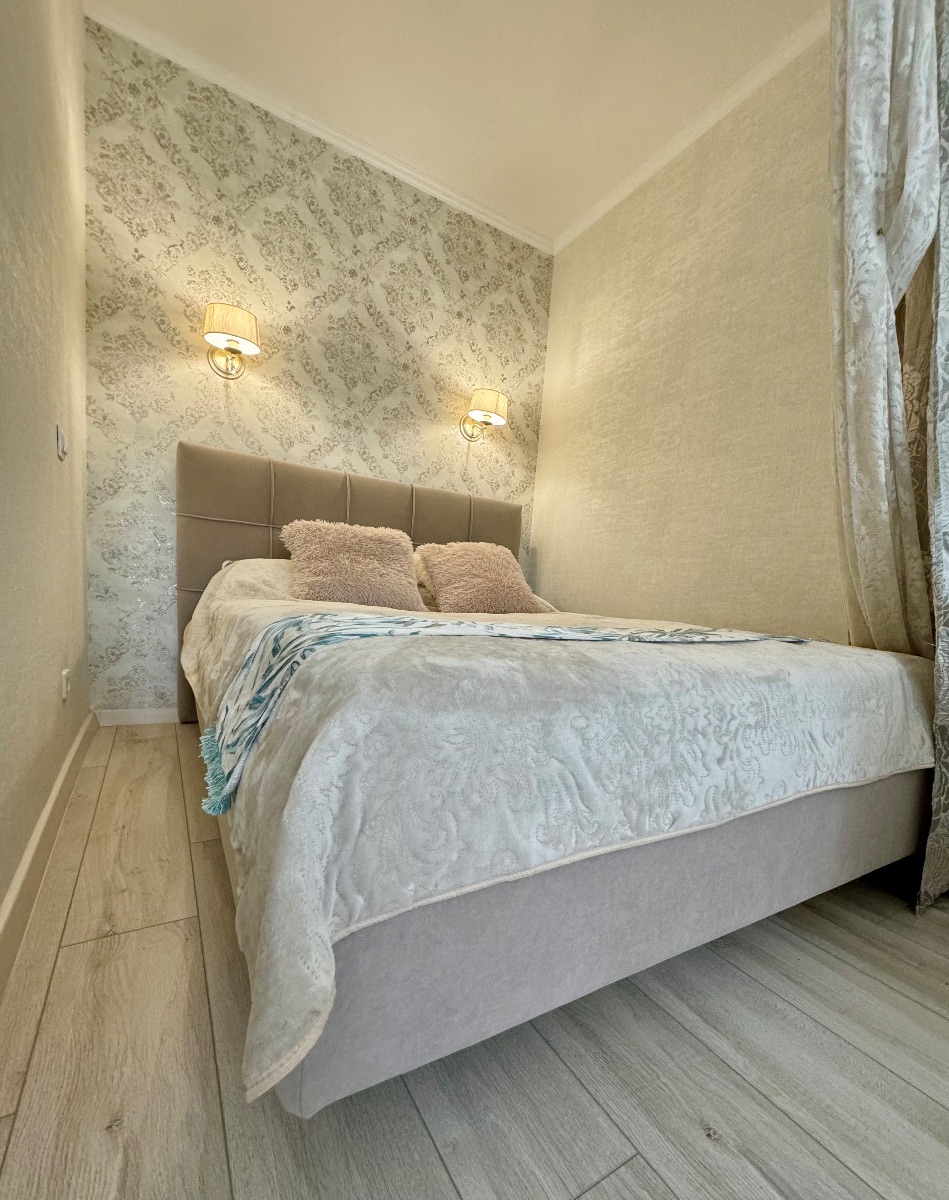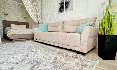 Стильный интерьер выполнен в спокойных тонах. Двуспальная кровать с ортопедическим основанием и большой раскладной диван для удобства гостей представлены в гостиной.