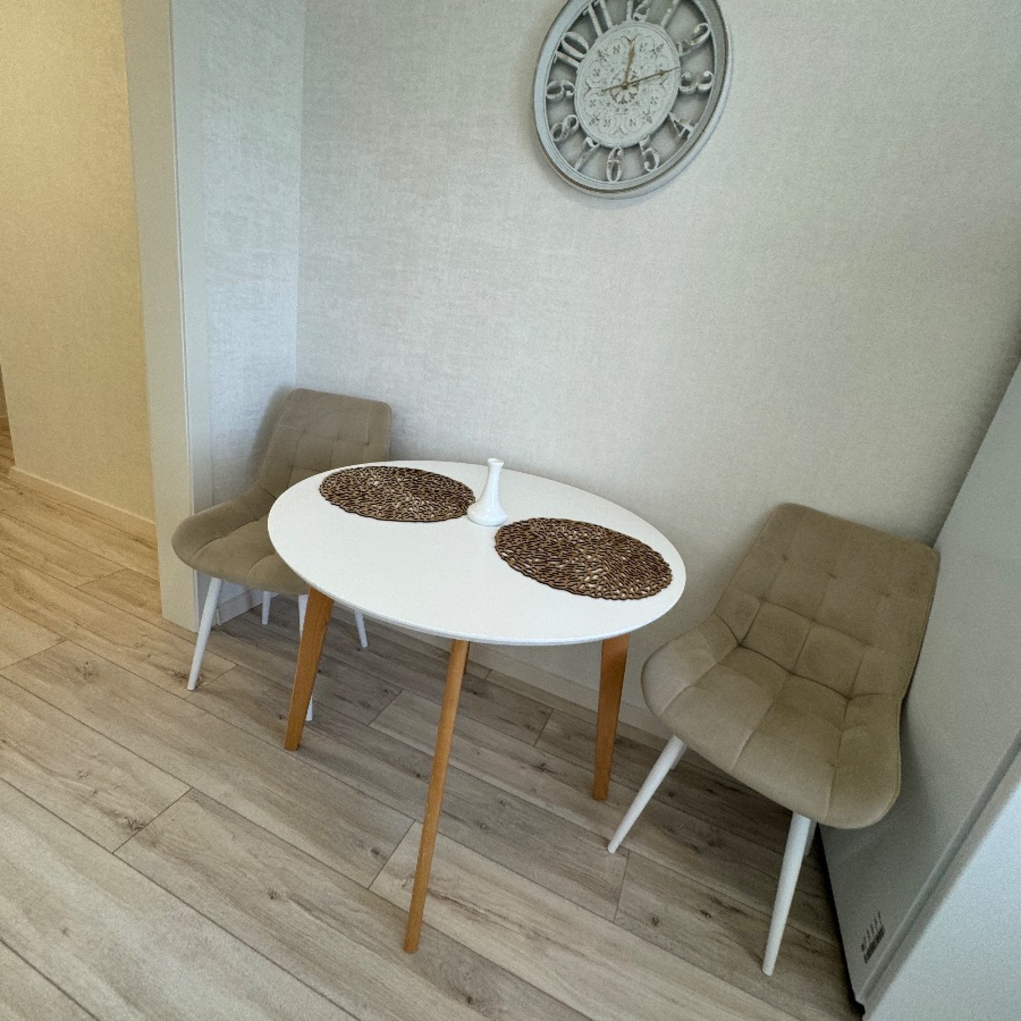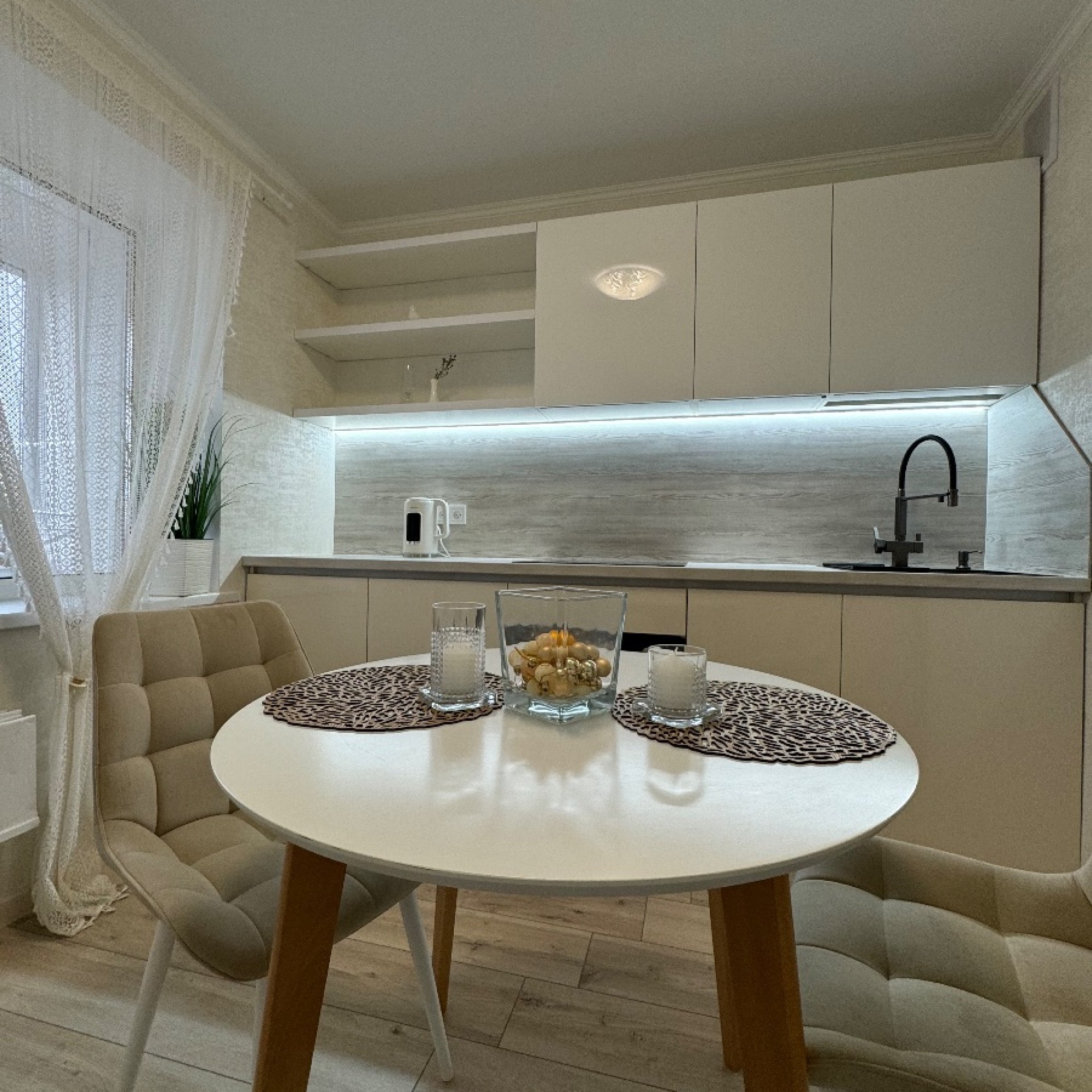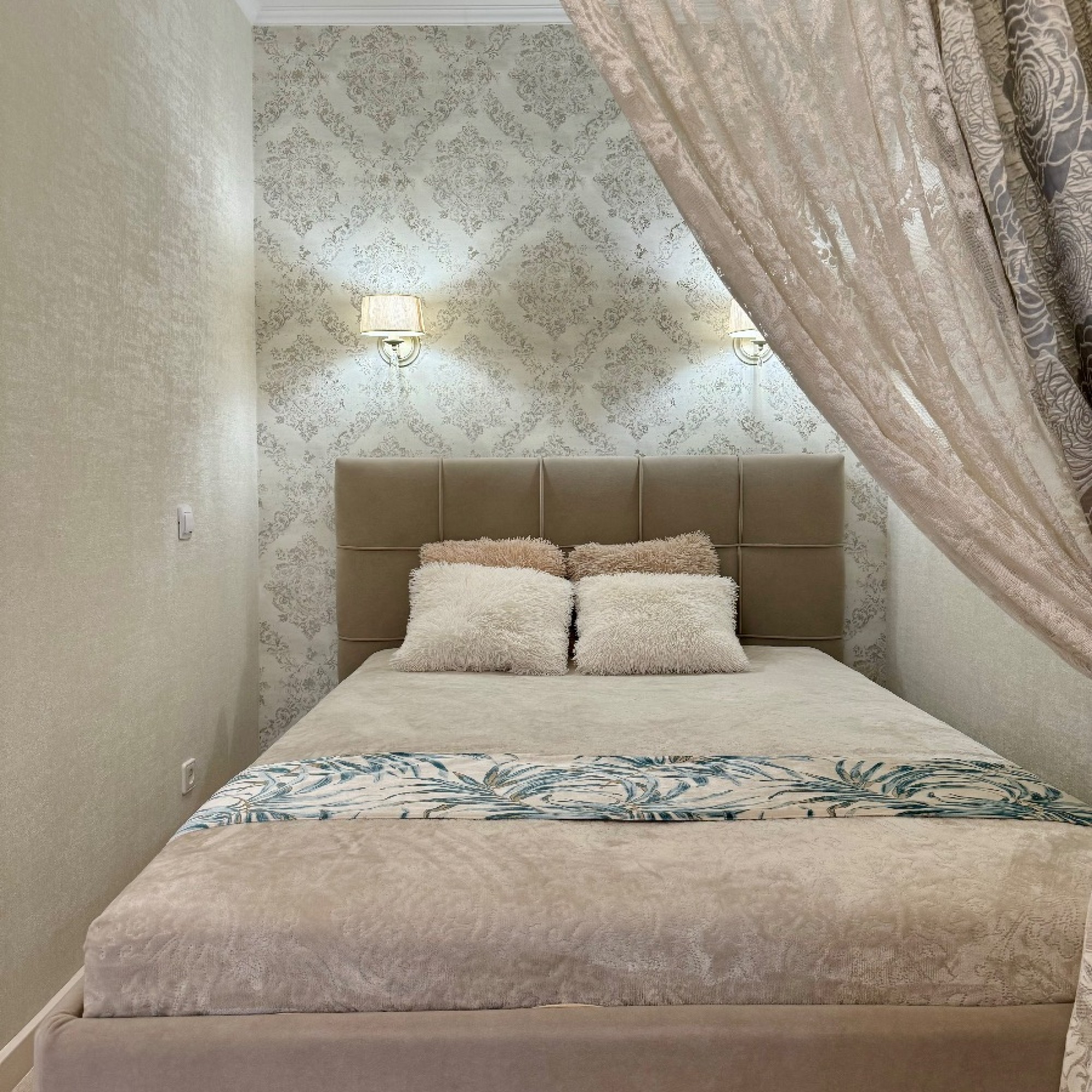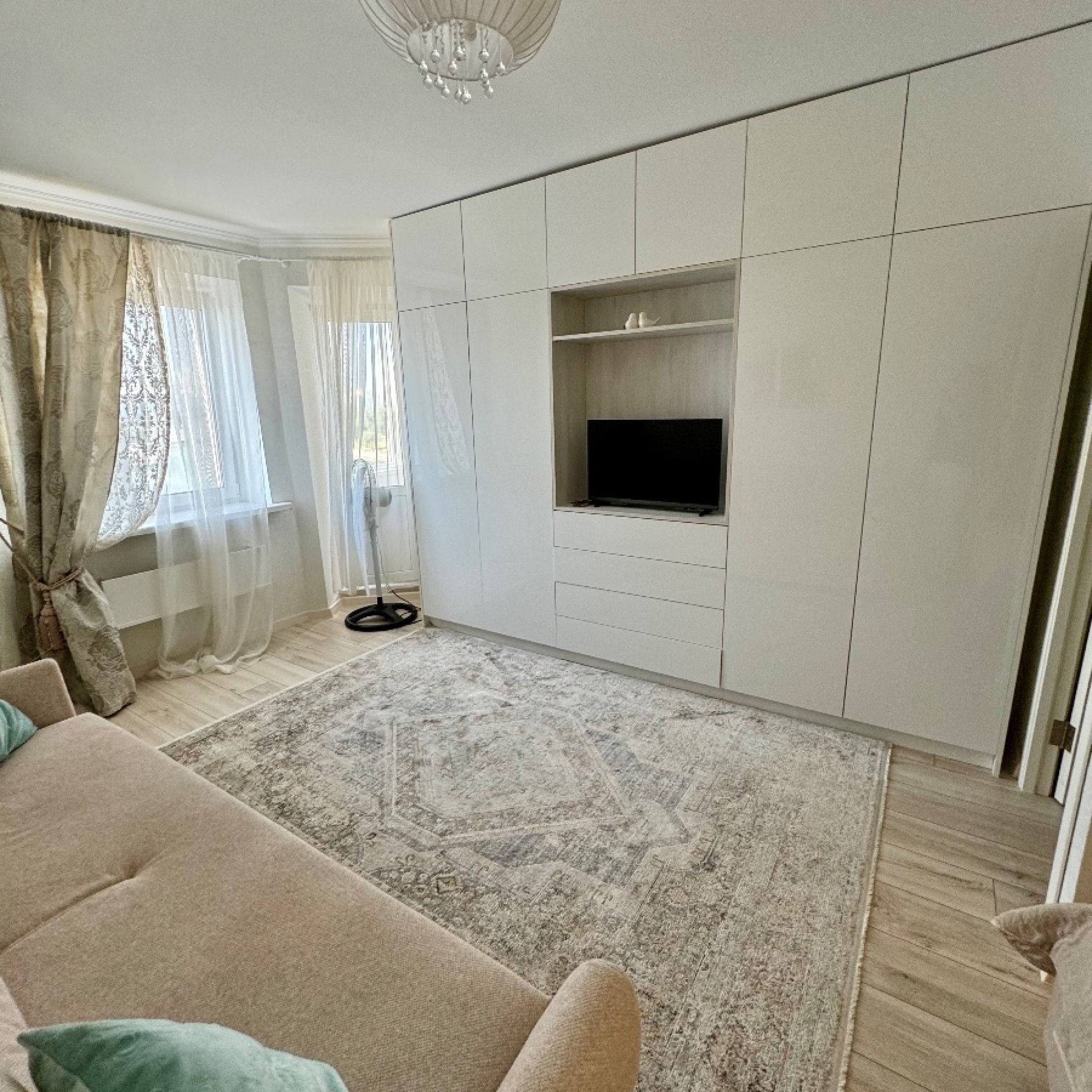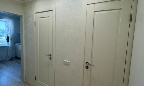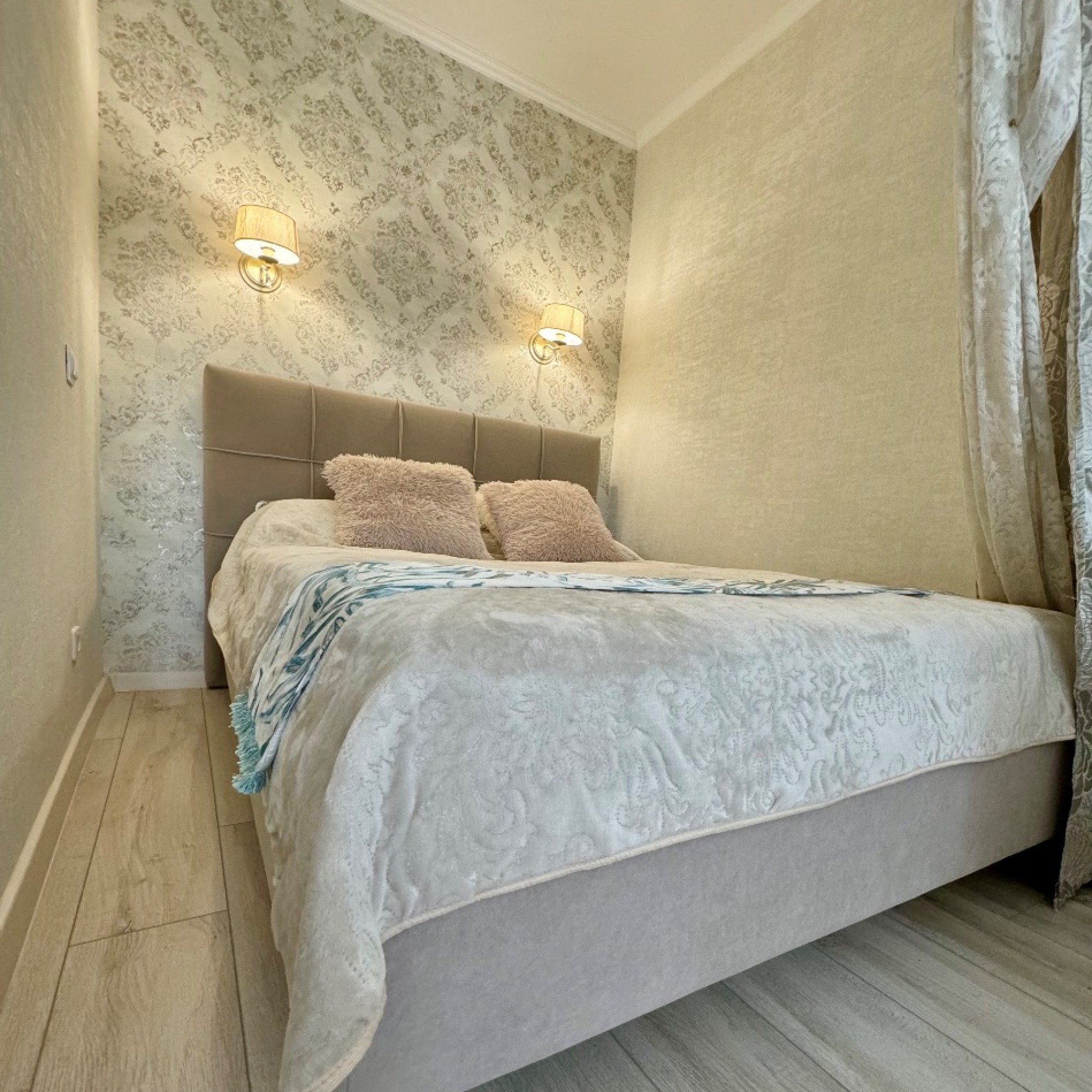 Стильный интерьер выполнен в спокойных тонах. Двуспальная кровать с ортопедическим основанием и большой раскладной диван для удобства гостей представлены в гостиной.