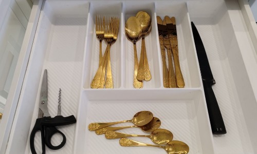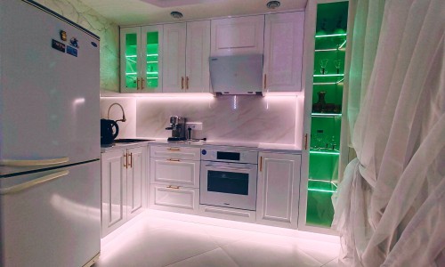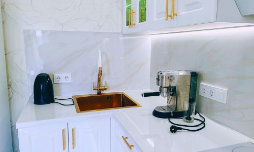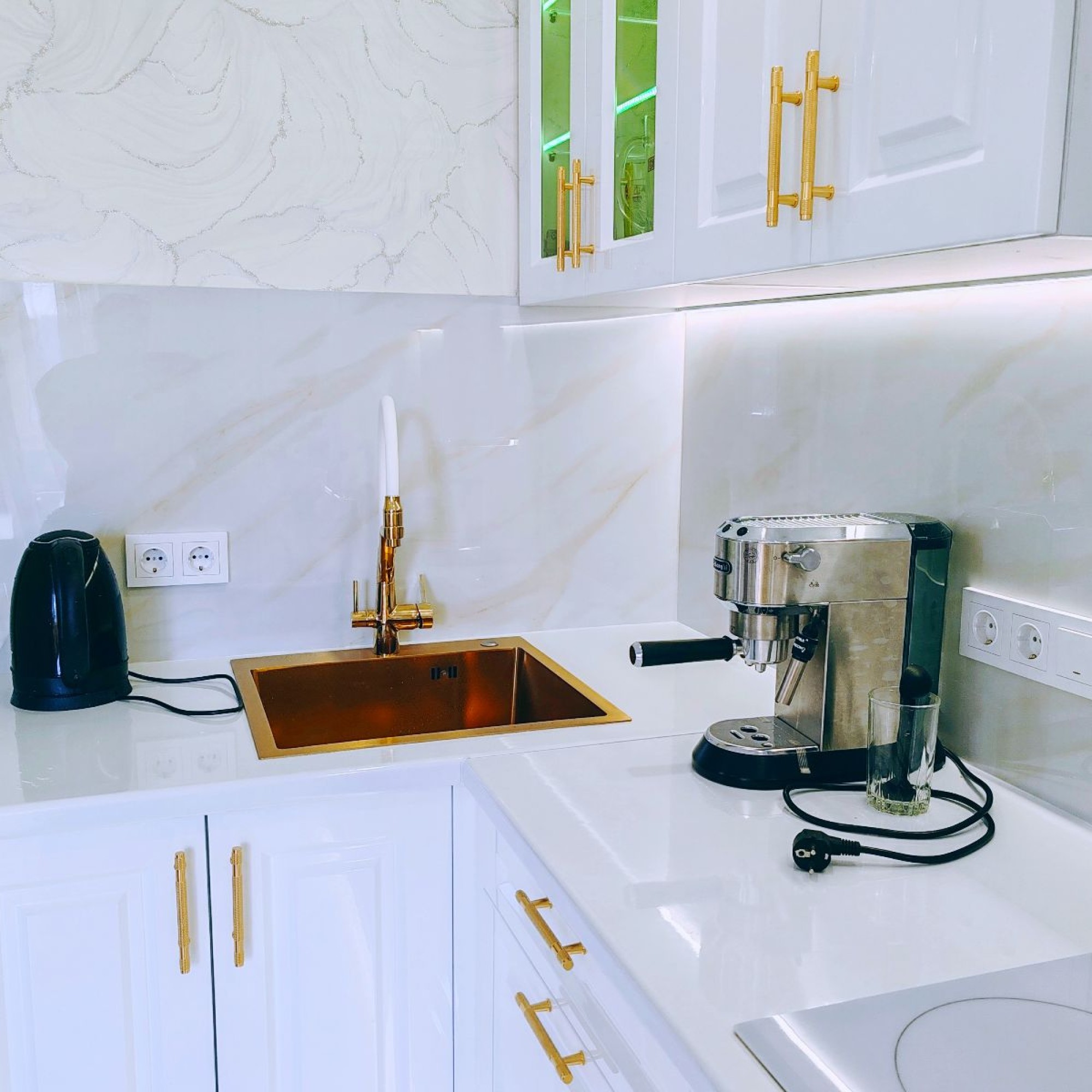 Современная белоснежная кухня с кофеваркой DeLonghi (несколько видов кофе и чая, сахар), тарелки и чашки из фарфора! Индукционная варочная панель с 4 конфорками и все необходимое, в том числе для длительного проживания.