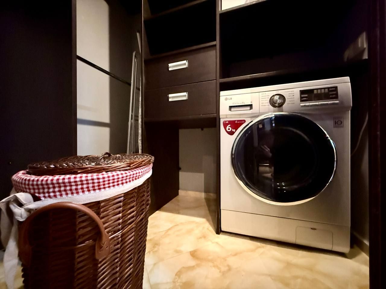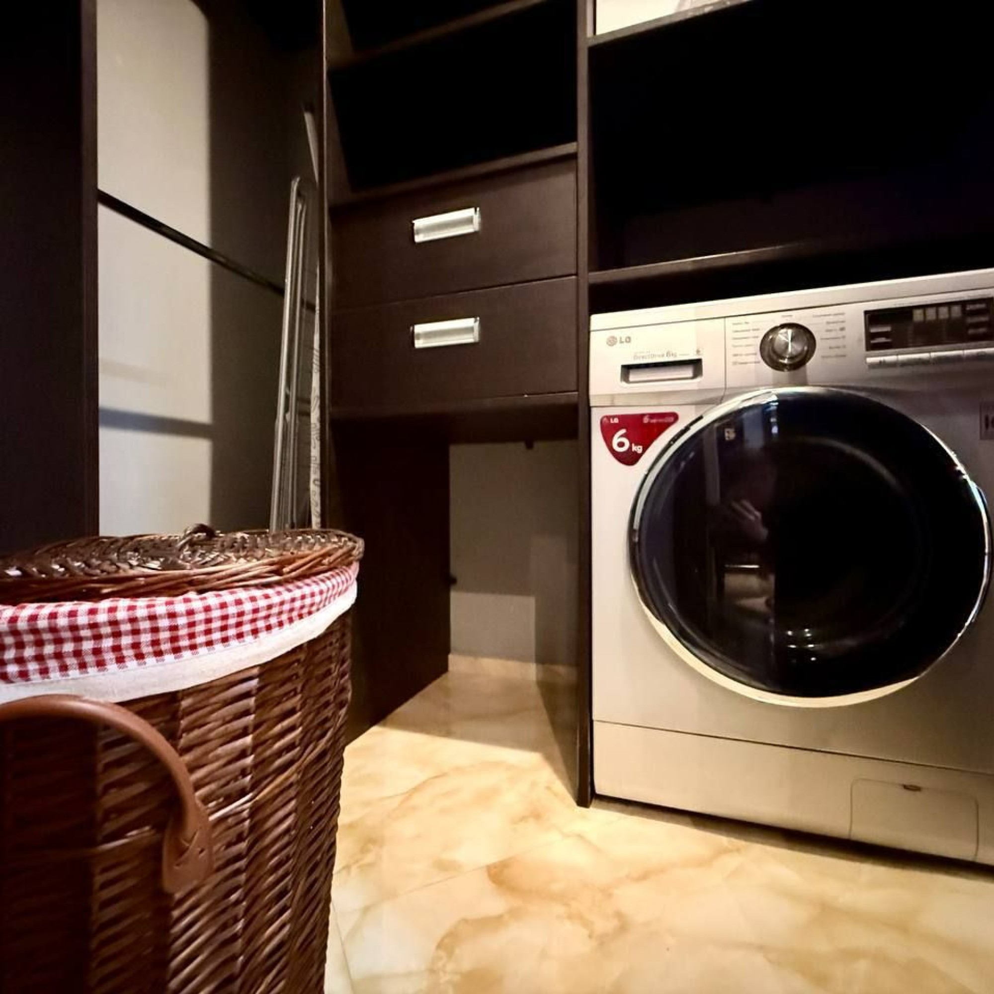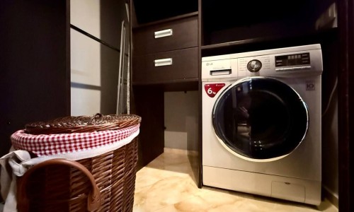 -Стиральная машина, утюг, гладильная доска, сушилка.