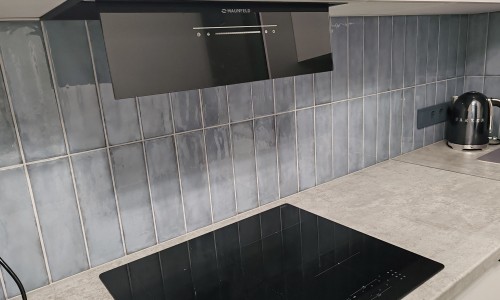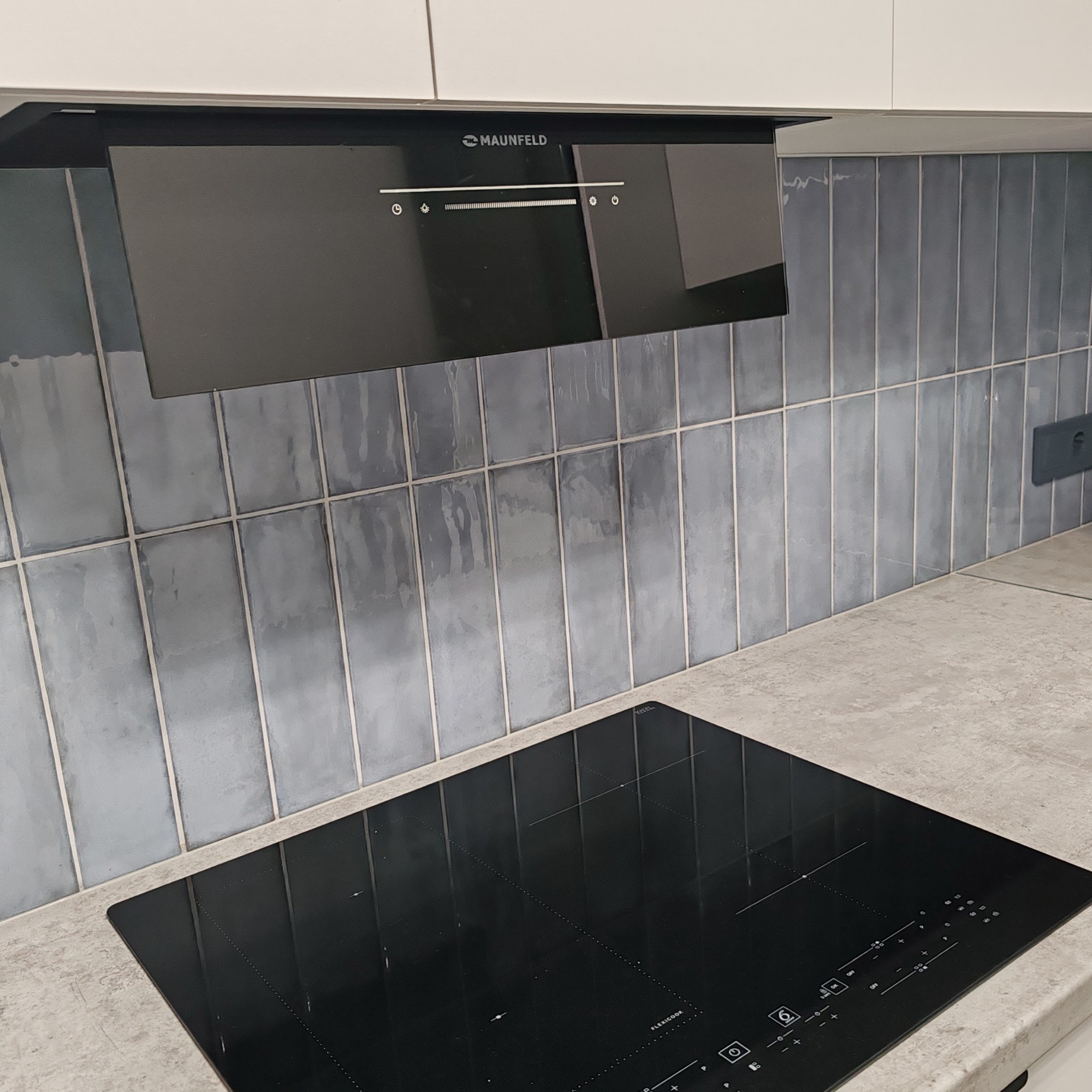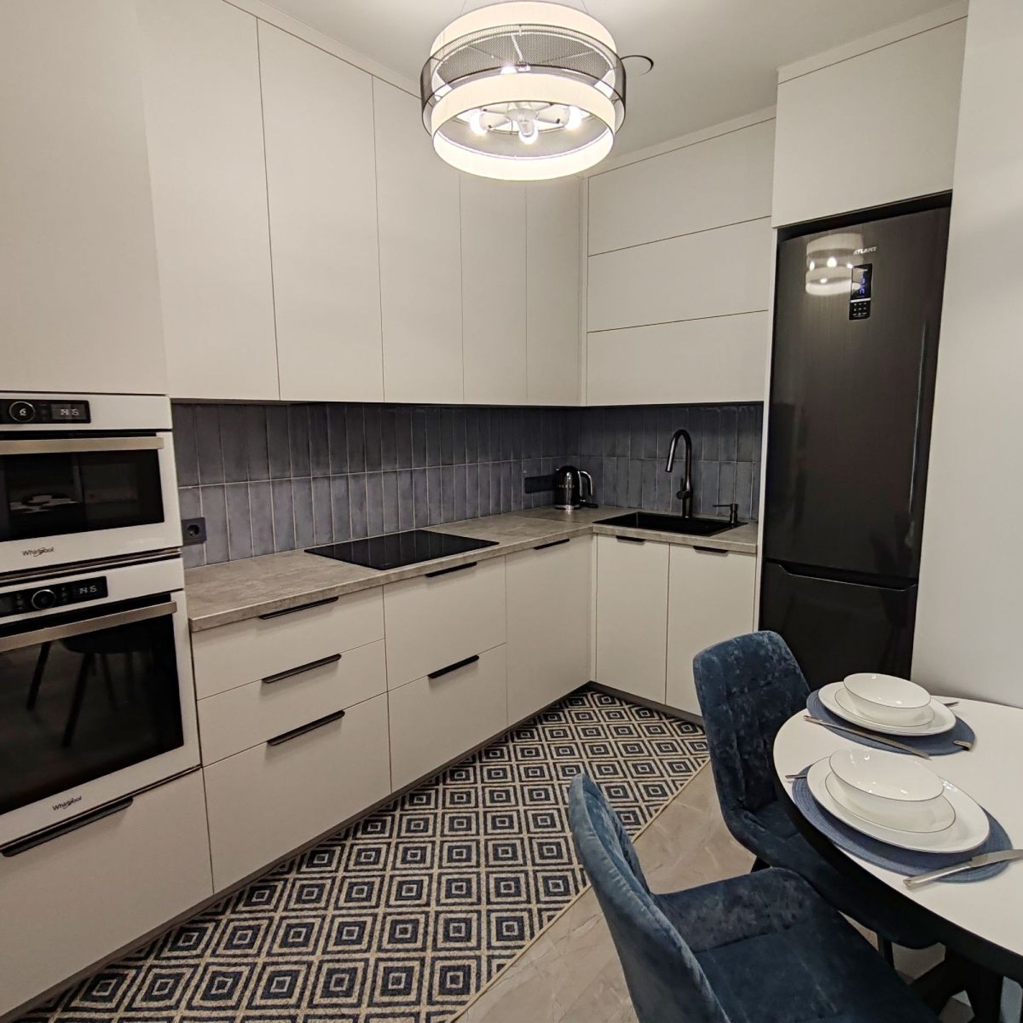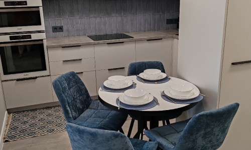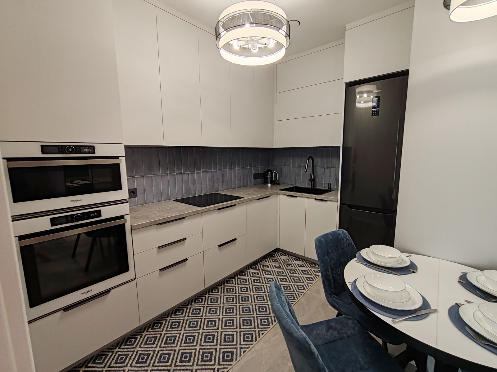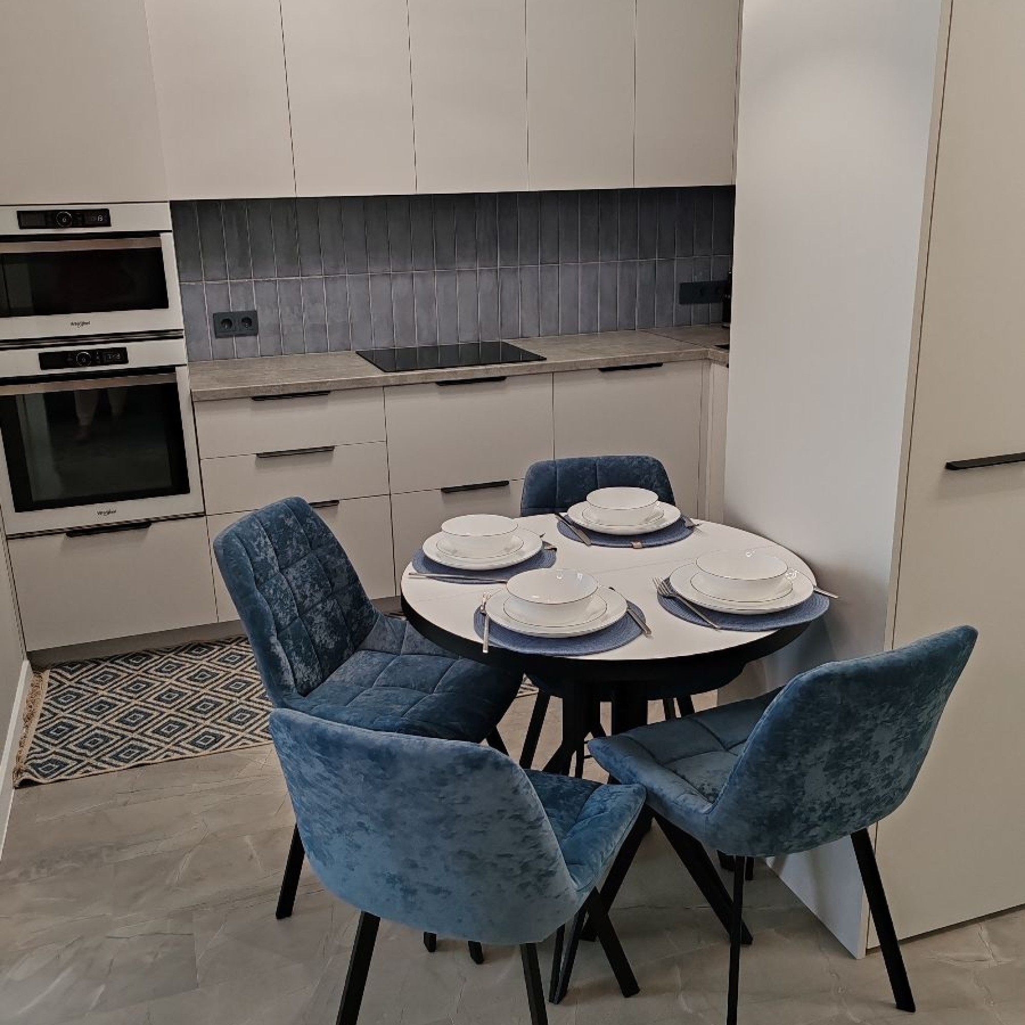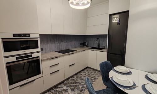 Кухня с встроенной мебелью и бытовой техникой: кофемашина, холодильник, посудомоечная машина, электрочайник, микроволновая печь, духовой шкаф, индукционная плита, кухонная вытяжка с сенсорной панелью. Имеется вся необходимая посуда и столовые приборы.