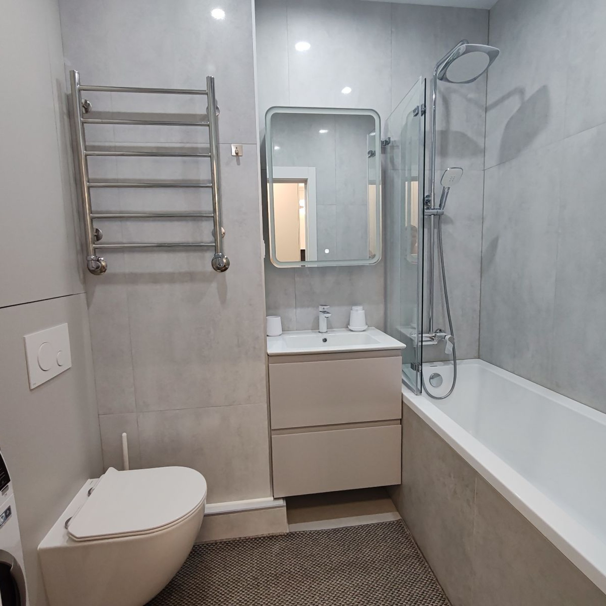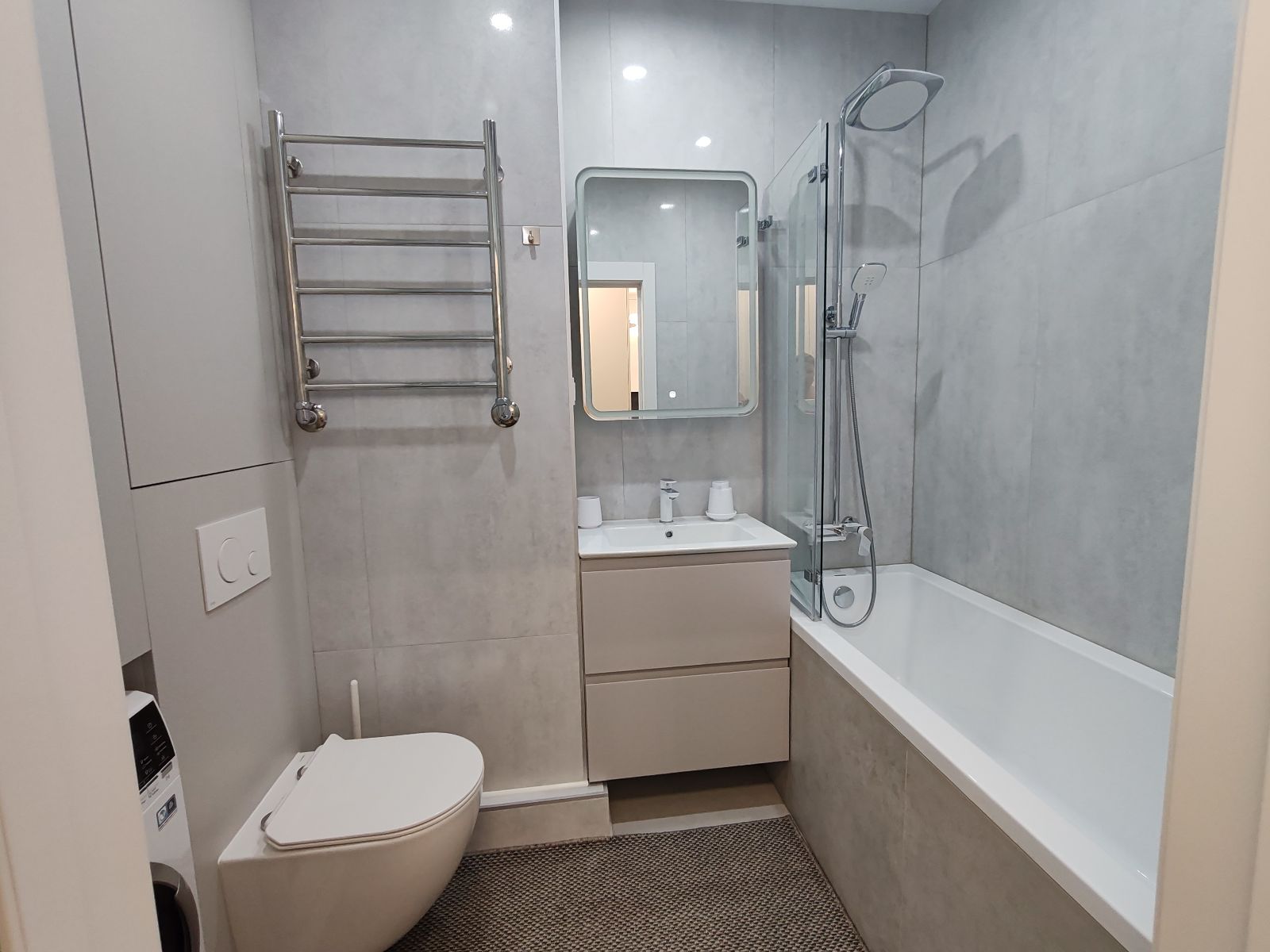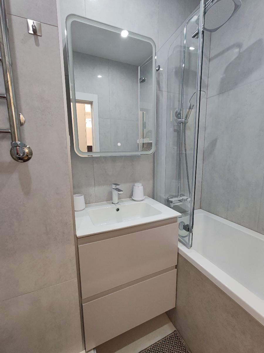 В ванной : фен, средства гигиены, зеркало-шкаф с подсветкой, стиральная машина.