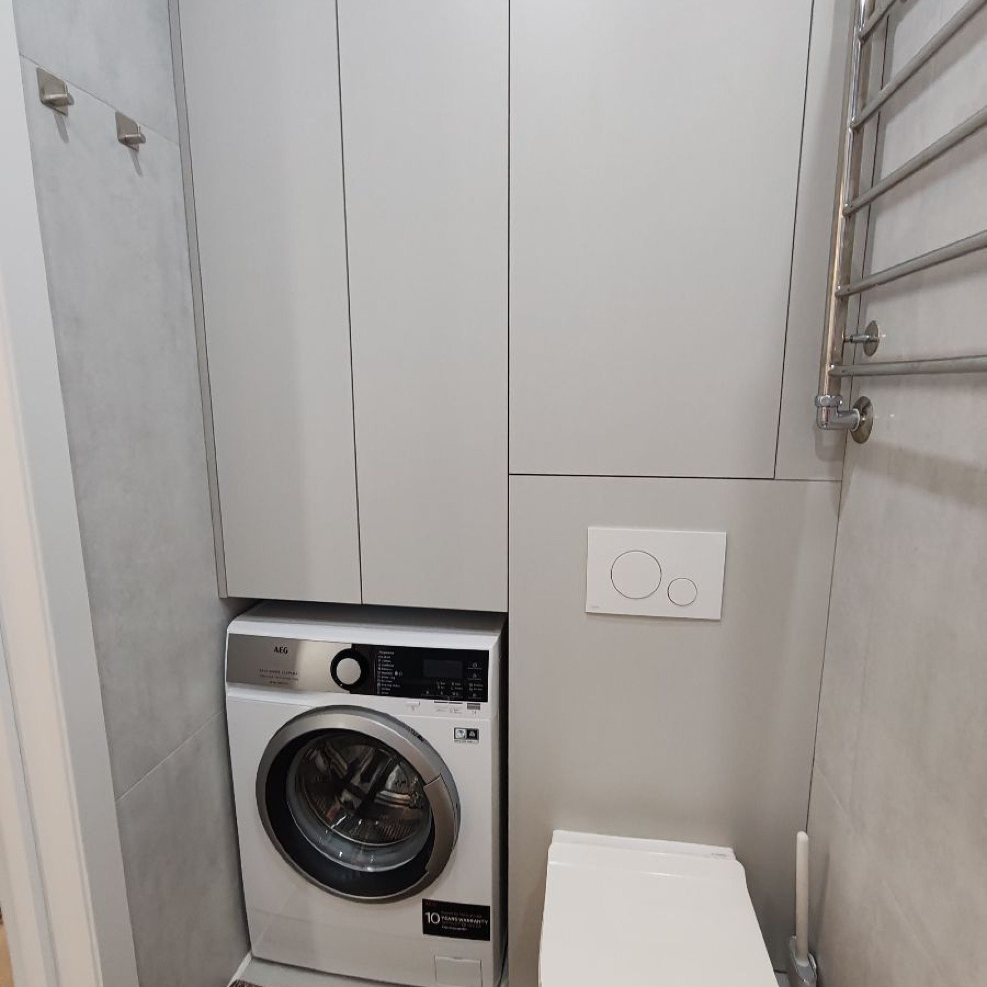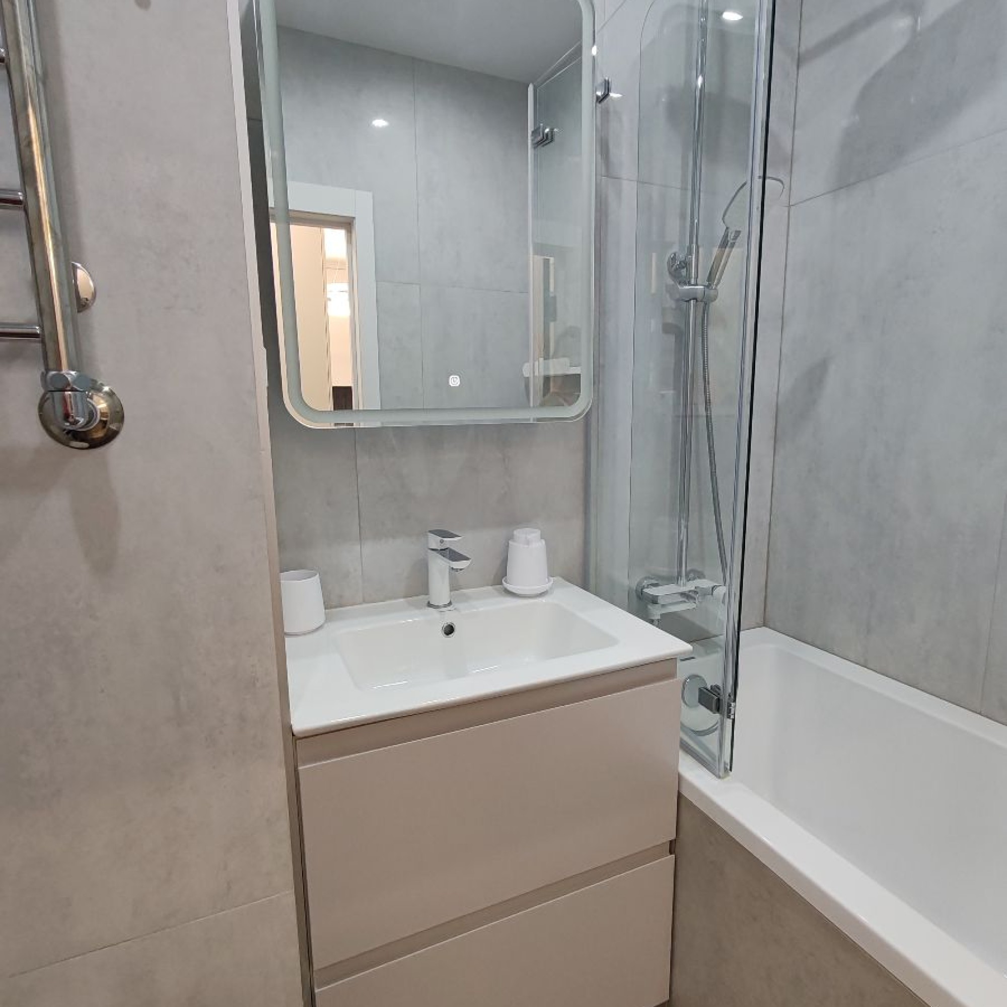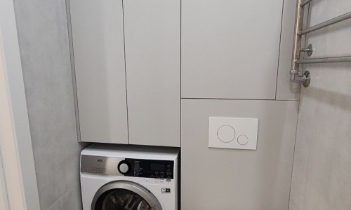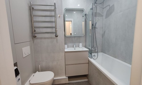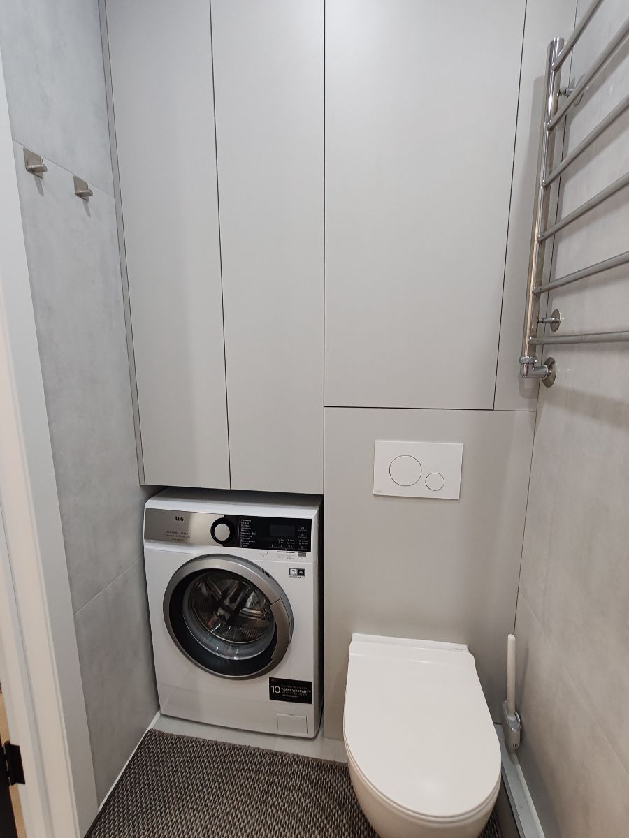 В ванной : фен, средства гигиены, зеркало-шкаф с подсветкой, стиральная машина.