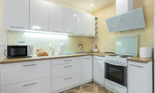 Кухонная зона оборудована электро-плитой, свч печь, холодильник, электро-чайник и вся необходимая посуда.