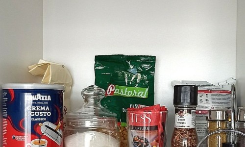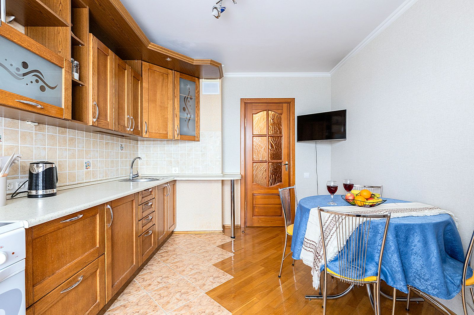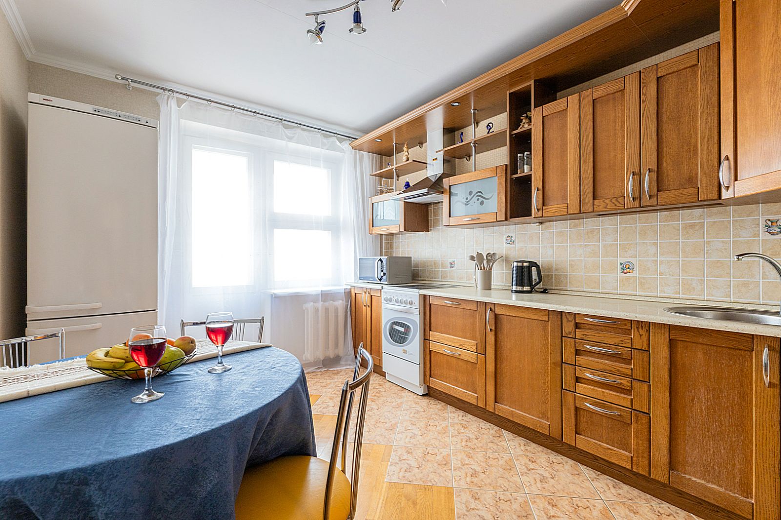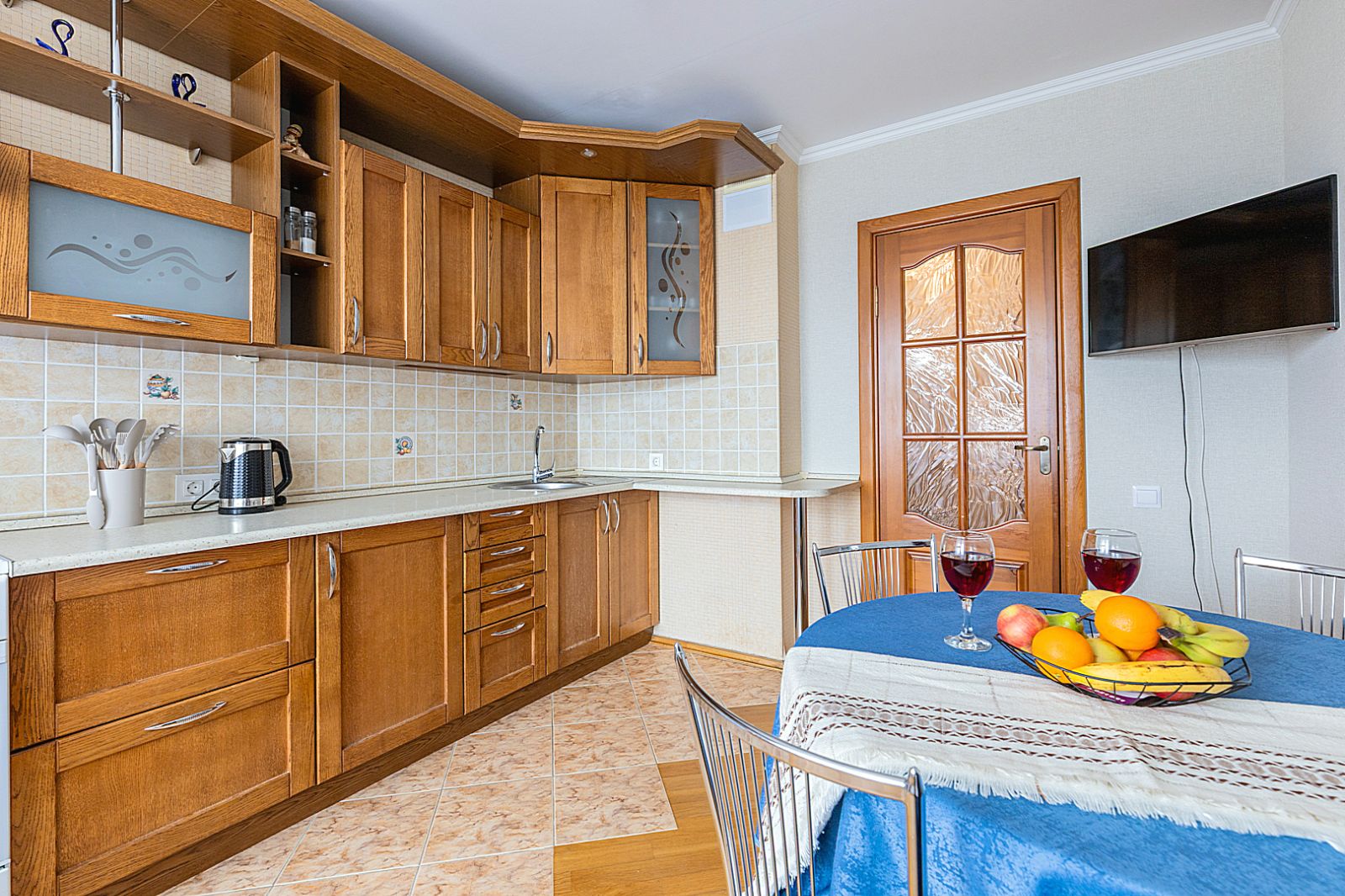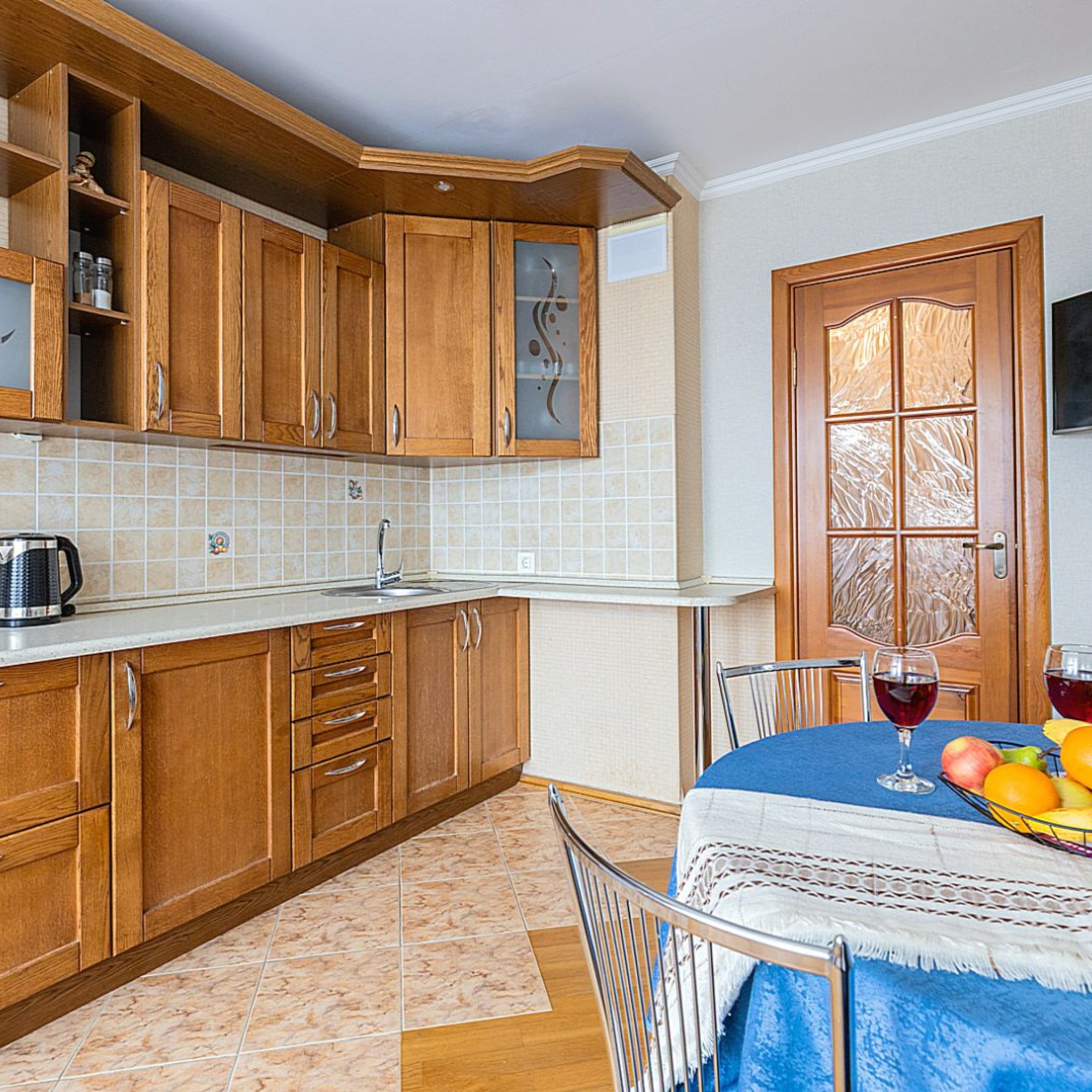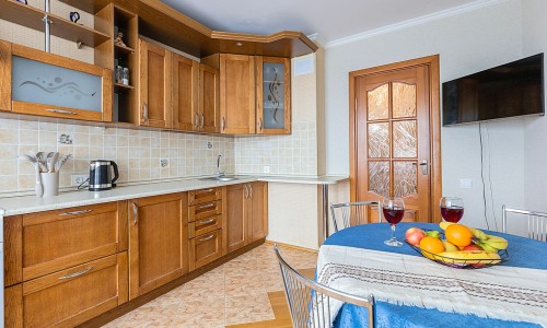 Кухонная зоной оборудована плитой, свч печью, холодильником и вся необходимая посуда (столовые приборы, сковороды, кастрюли, стаканы, бокалы, рюмки) .
