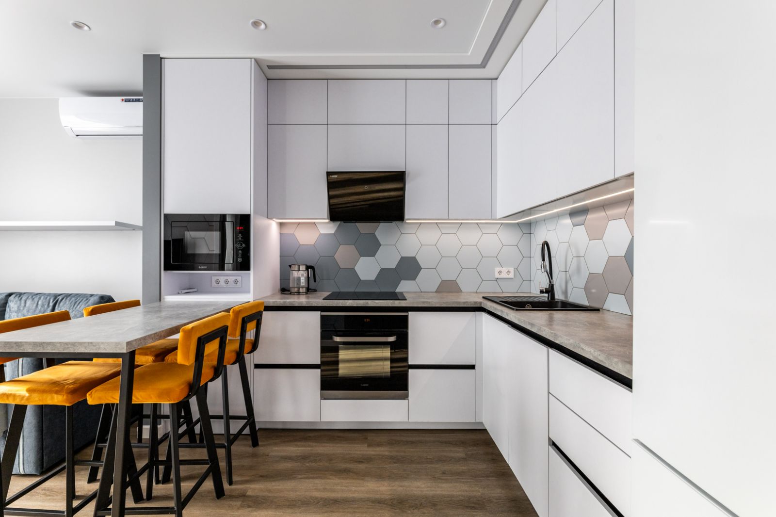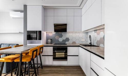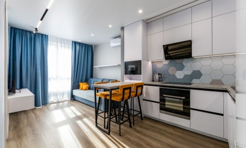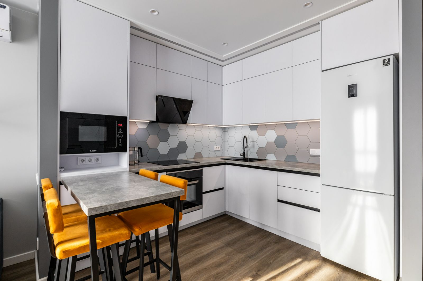 Кухонная зоной оборудована варочной панелью,посудомоечной машиной ,свч печь, духовой шкаф, встроенный холодильник и вся необходимая посуда.