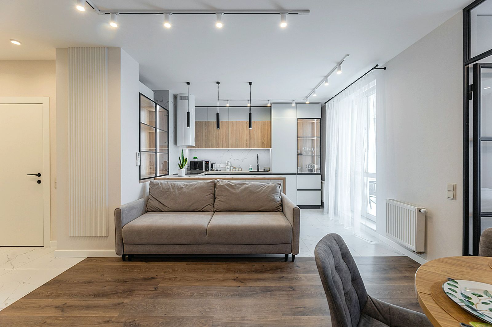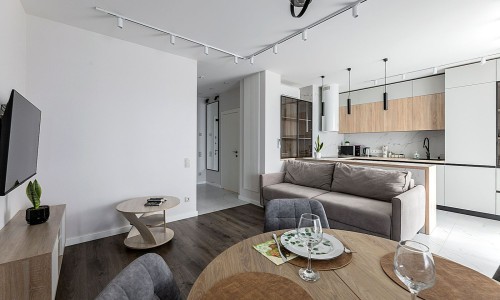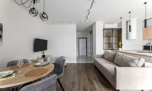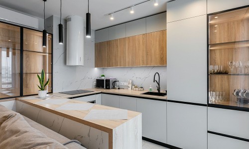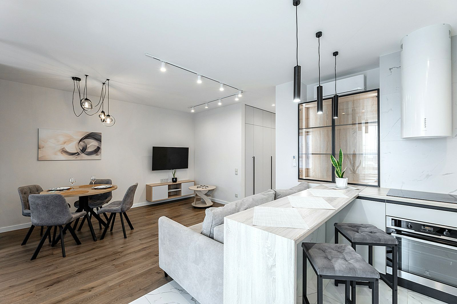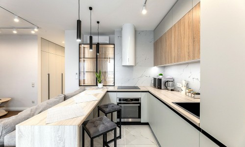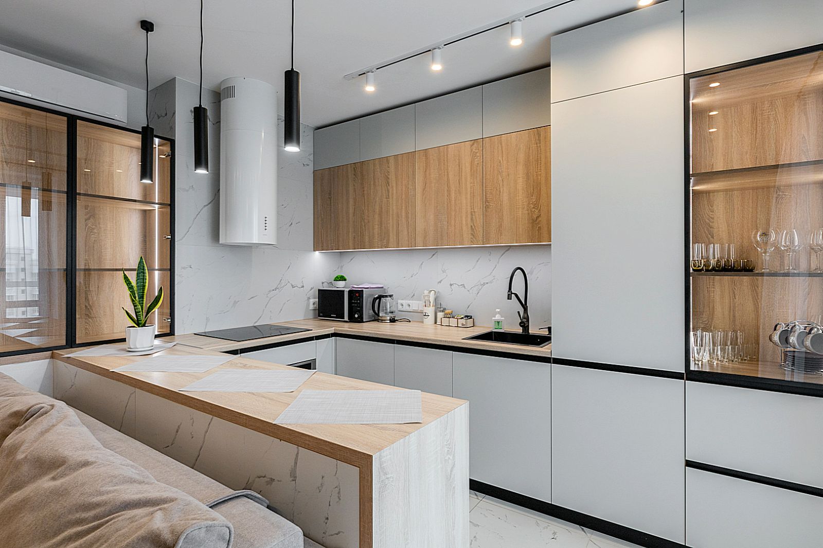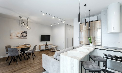 Кухонная зона оборудована варочной панелью, свч печью, духовым шкафом, посудомоечной машиной, кондиционером, холодильником, чайником и всей необходимой посудой.