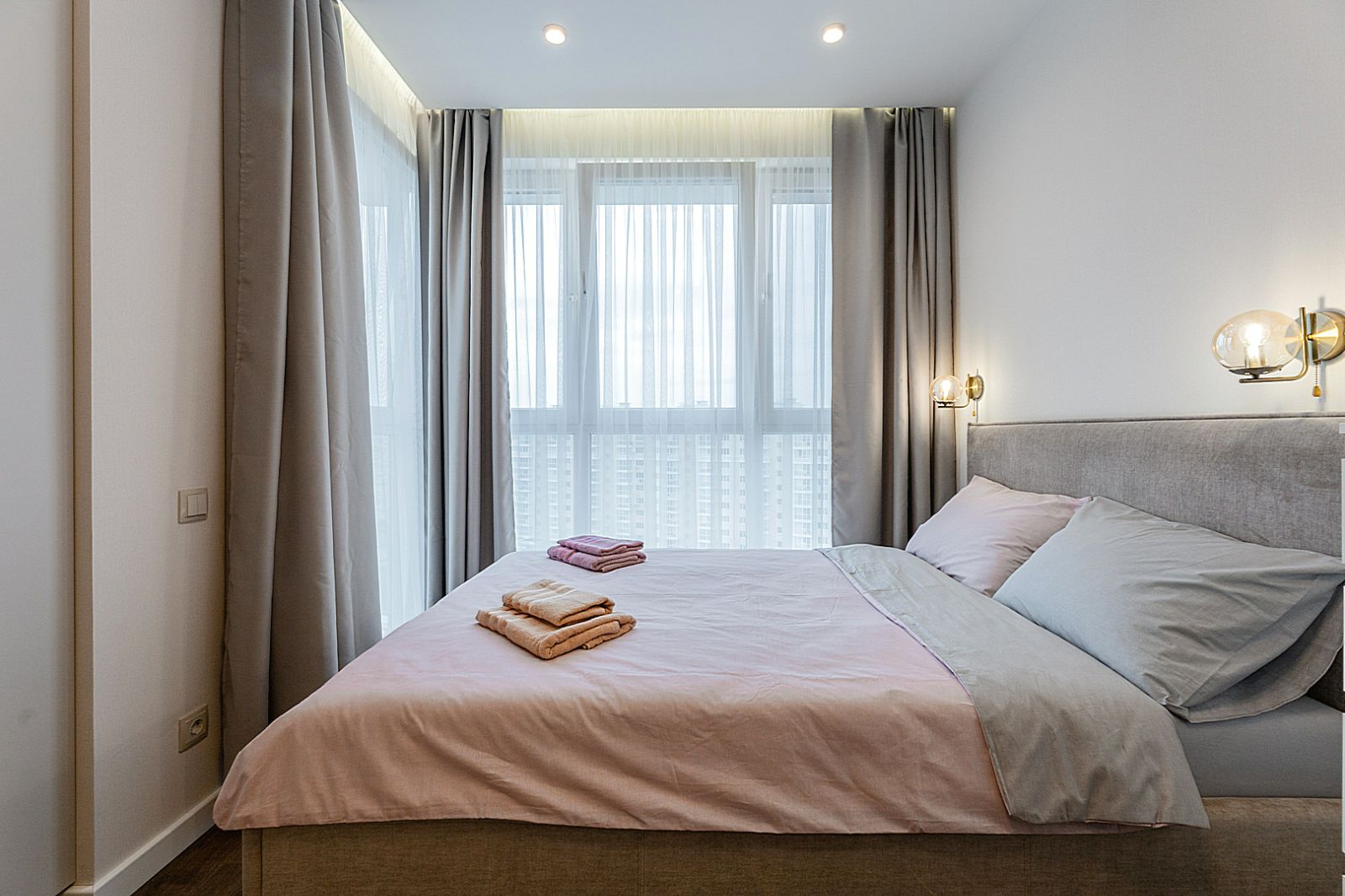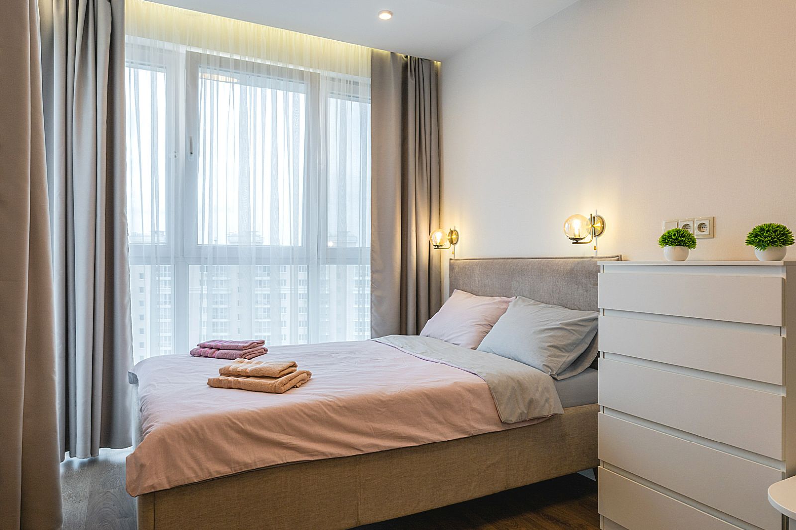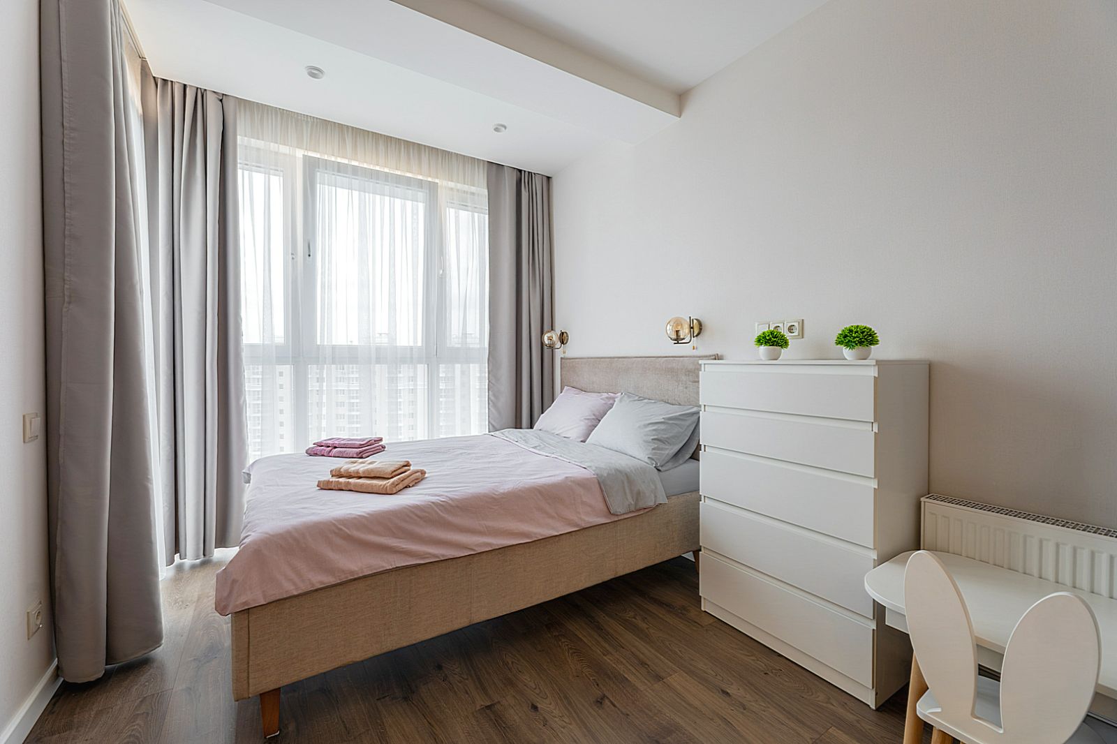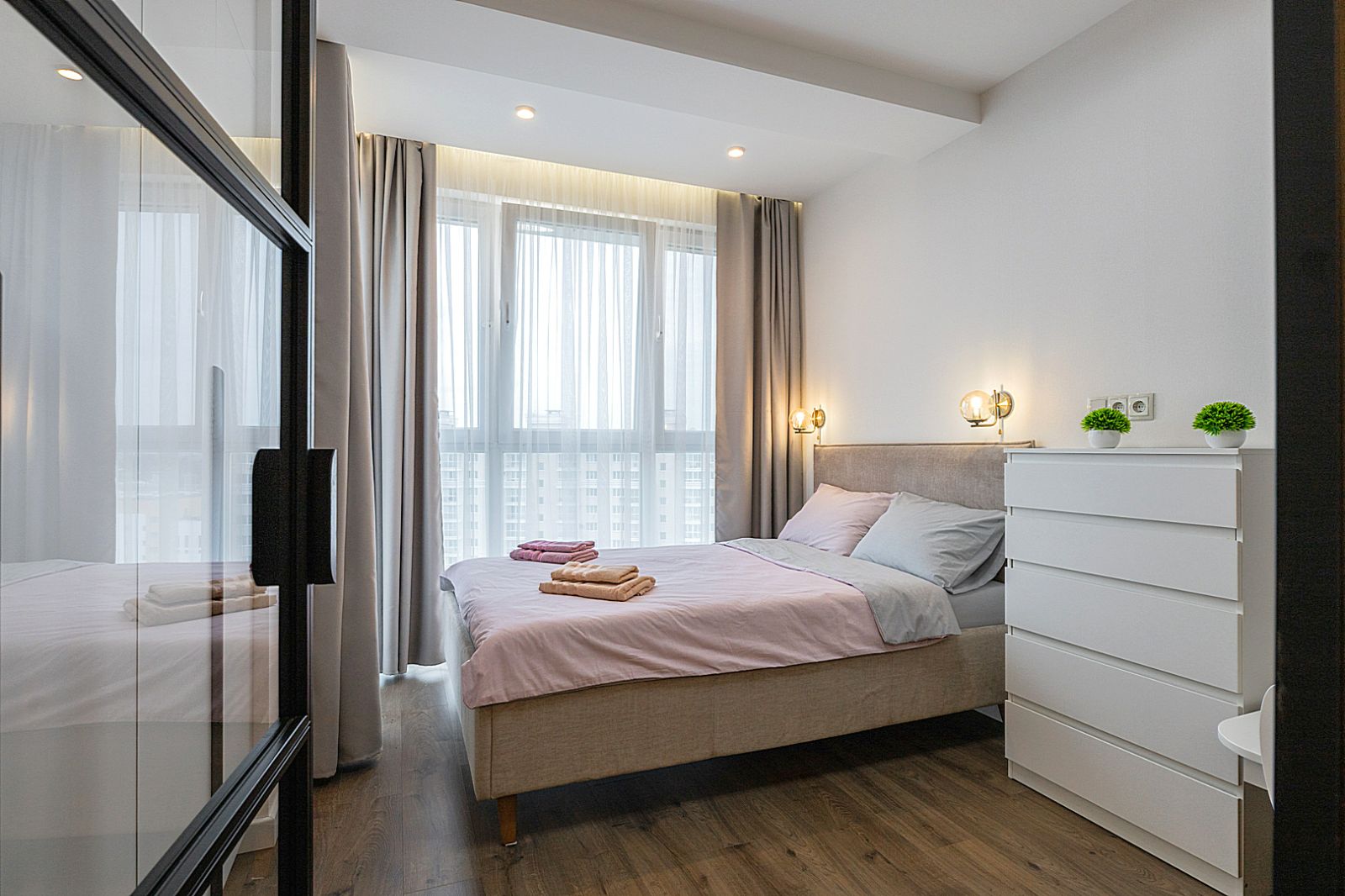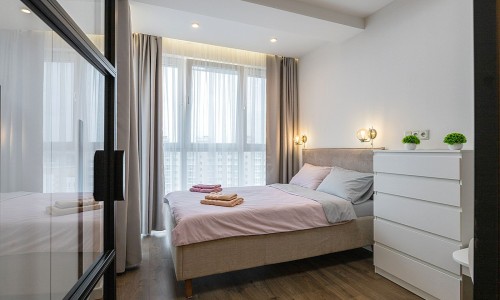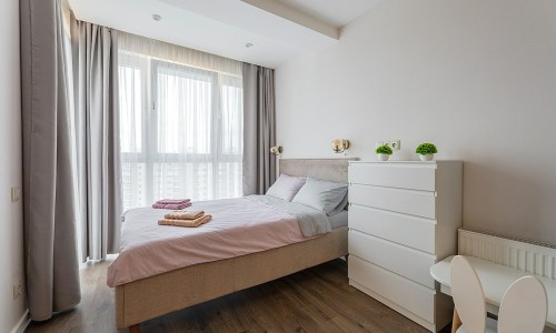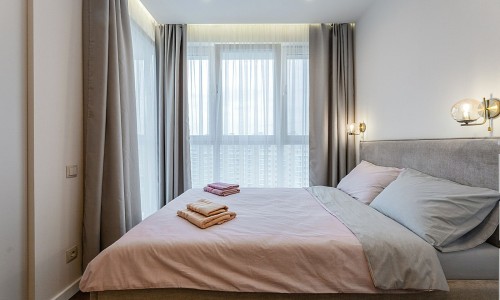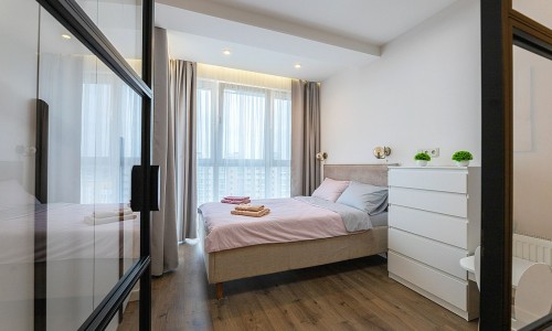 В спальной зоне имеется двуспальная кровать, для чудесного отдыха. Шкафы и шикарный вид из углового окна в пол.