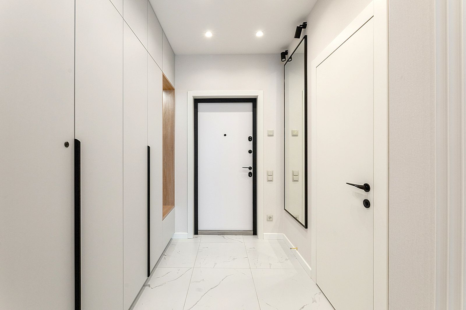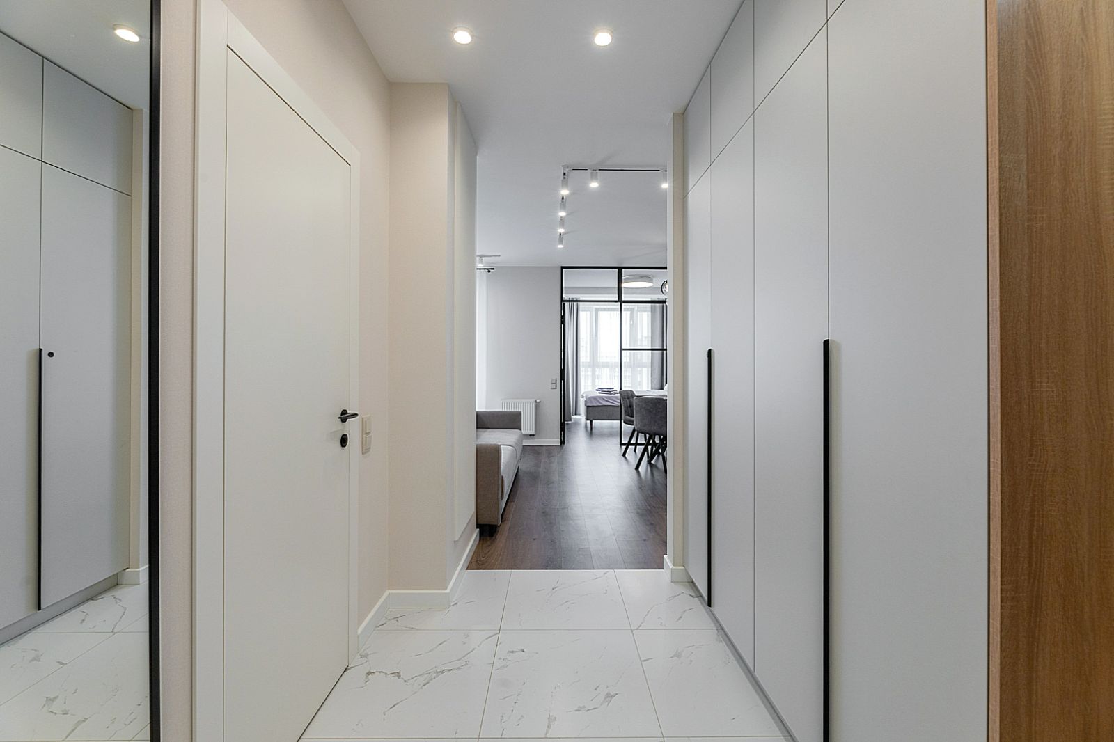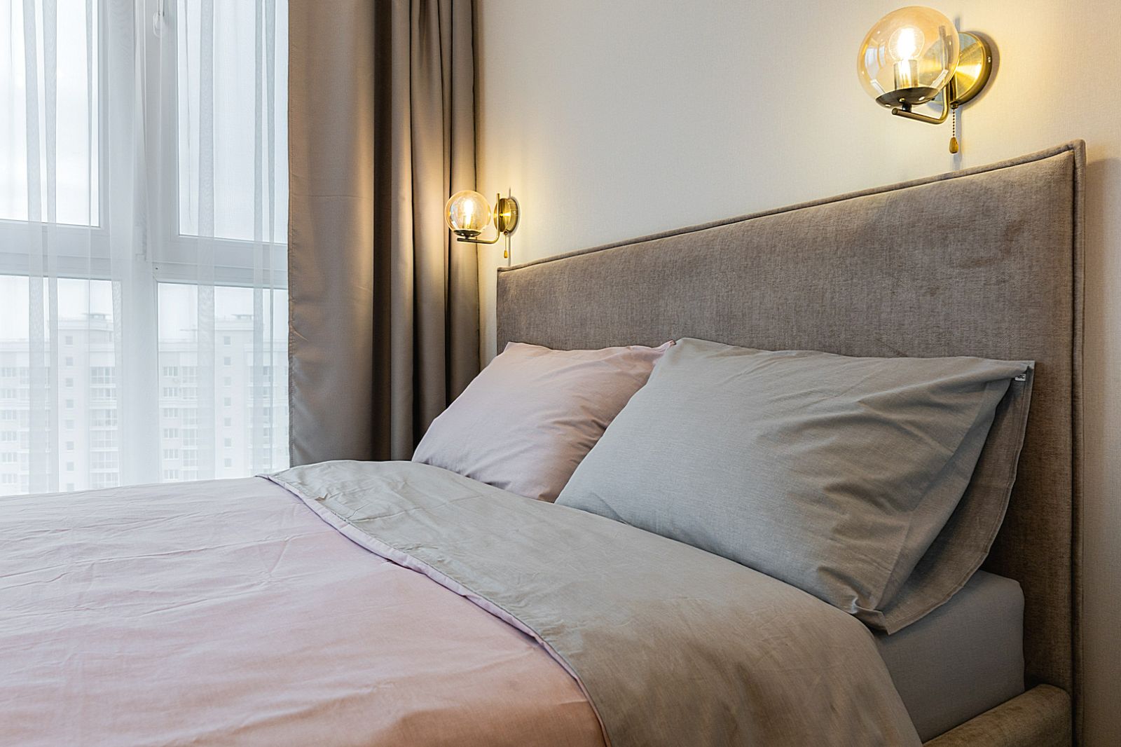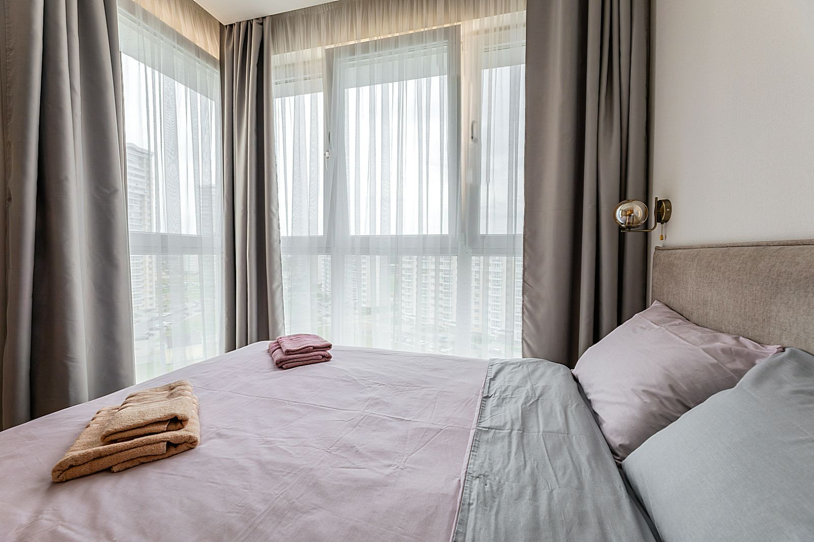 В спальной зоне имеется двуспальная кровать, для чудесного отдыха. Шкафы и шикарный вид из углового окна в пол.