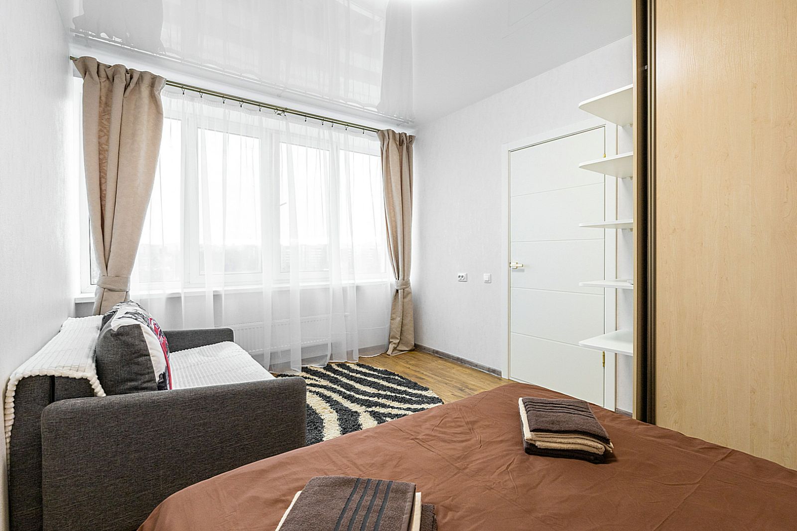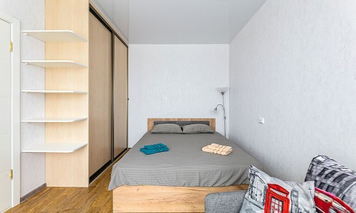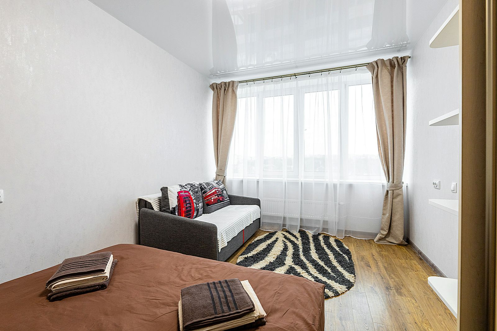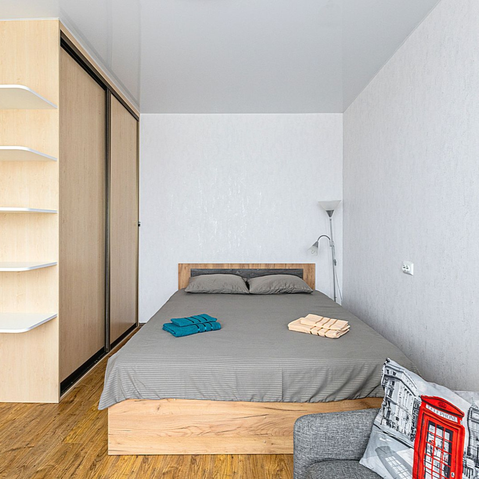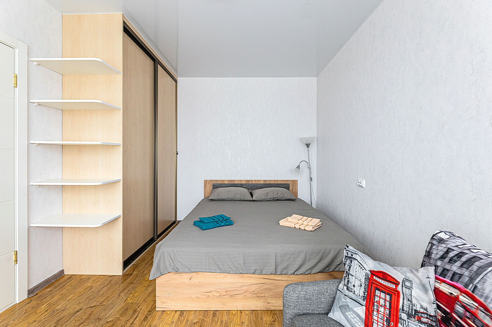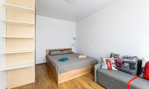 В комнате располагается двуспальная кровать, для чудесного отдыха. И маленький диван.