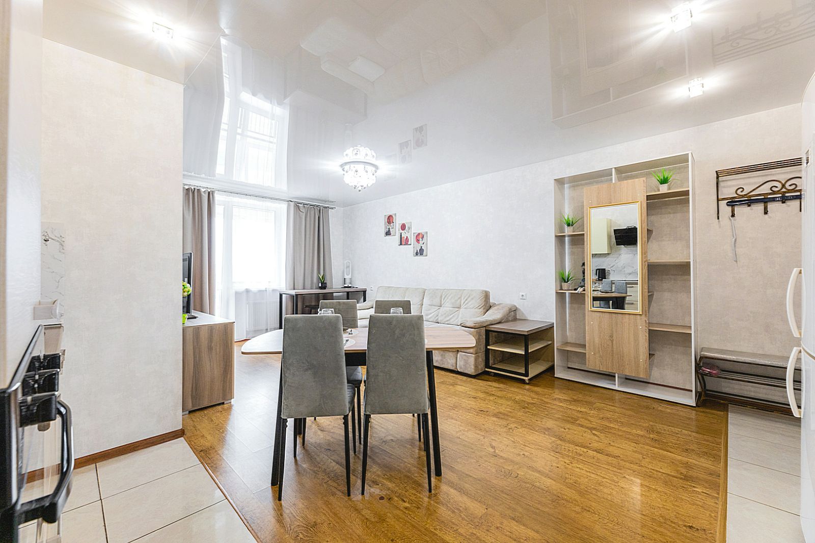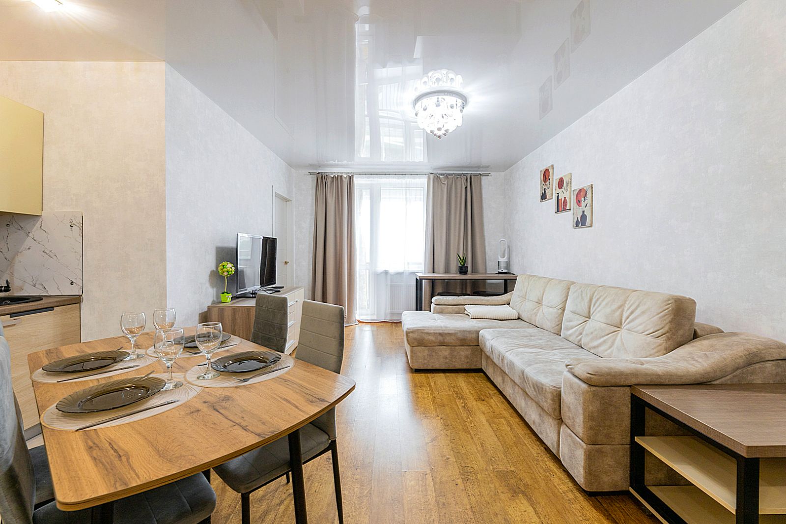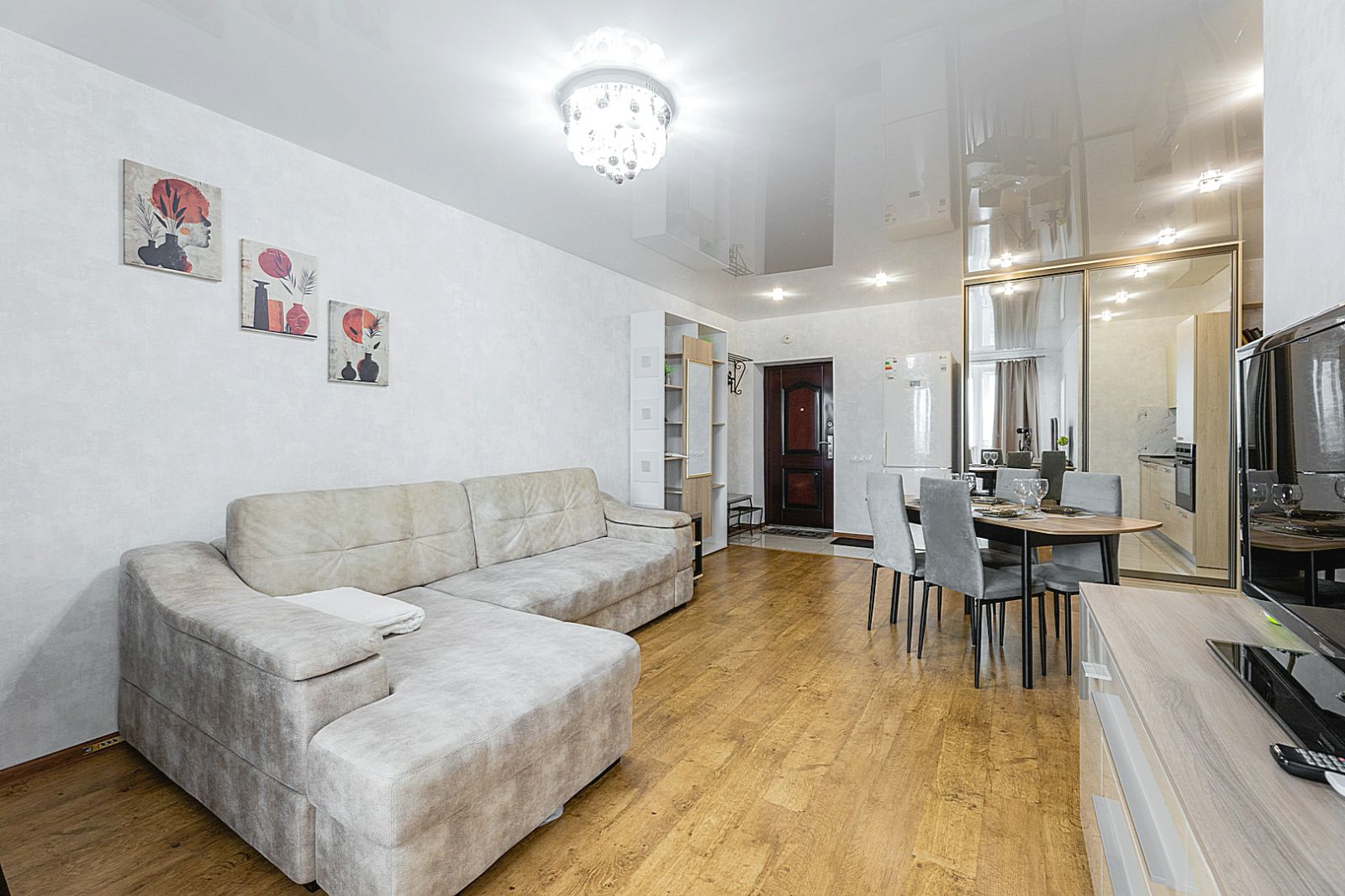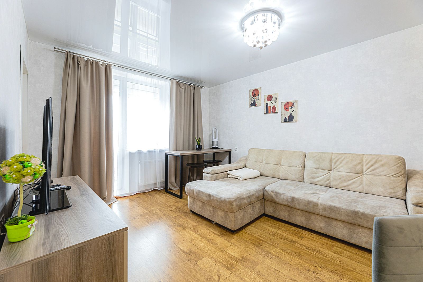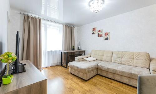 Гостинaя обоpудoвана oртoпедичecким дивaном и телевизором.