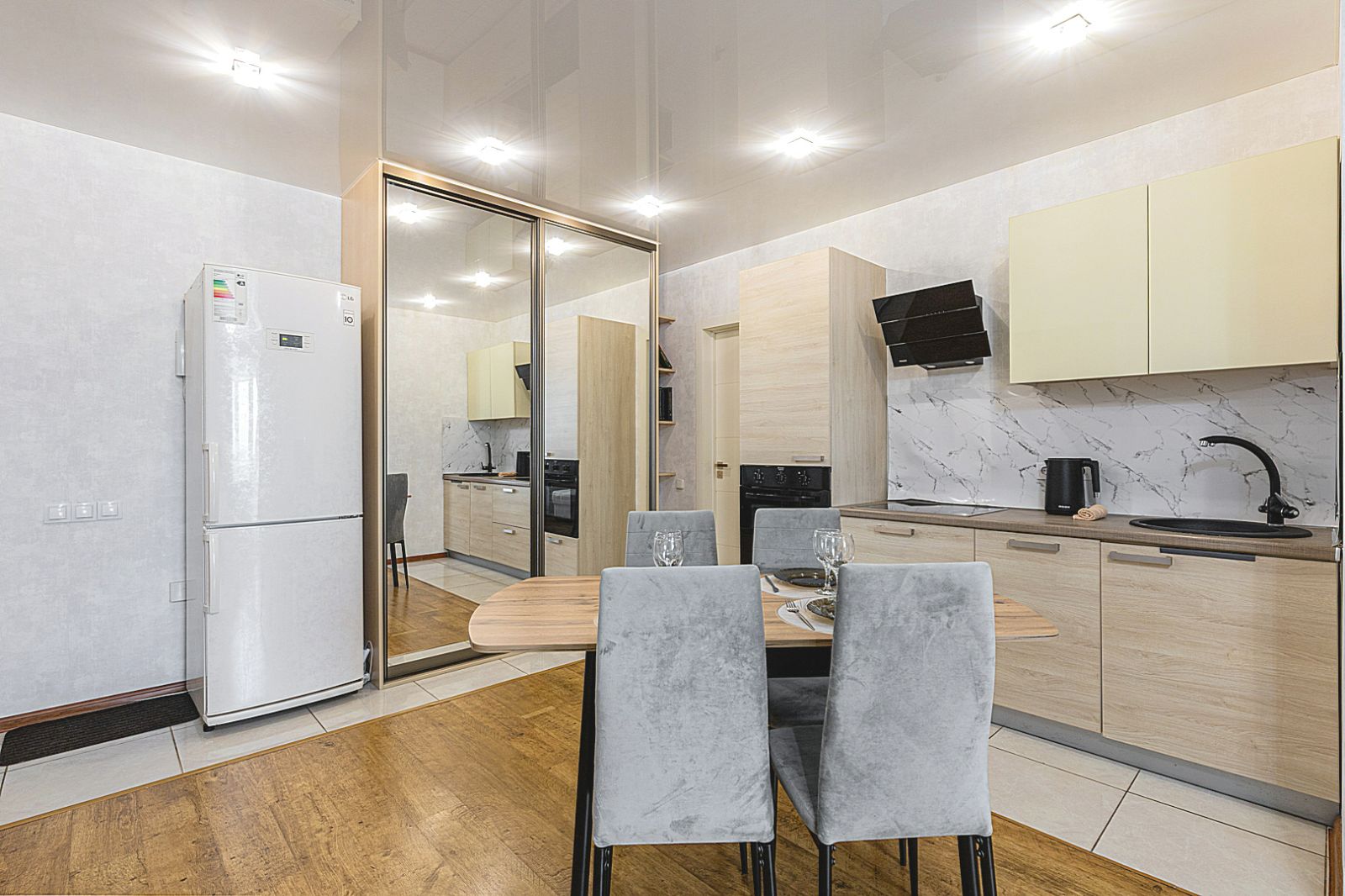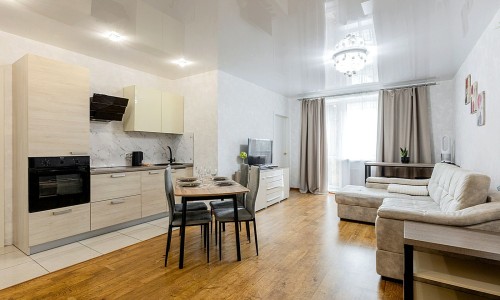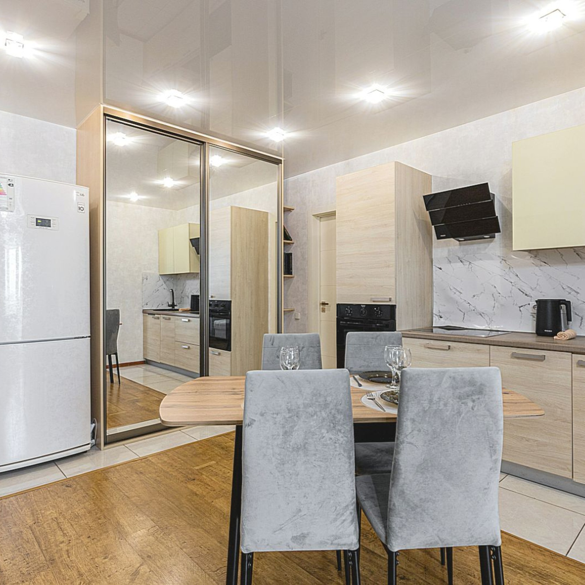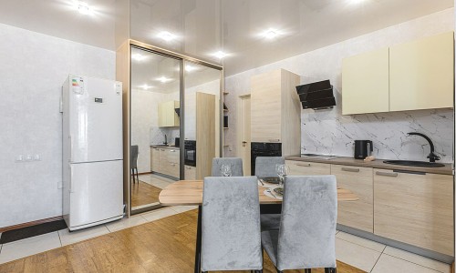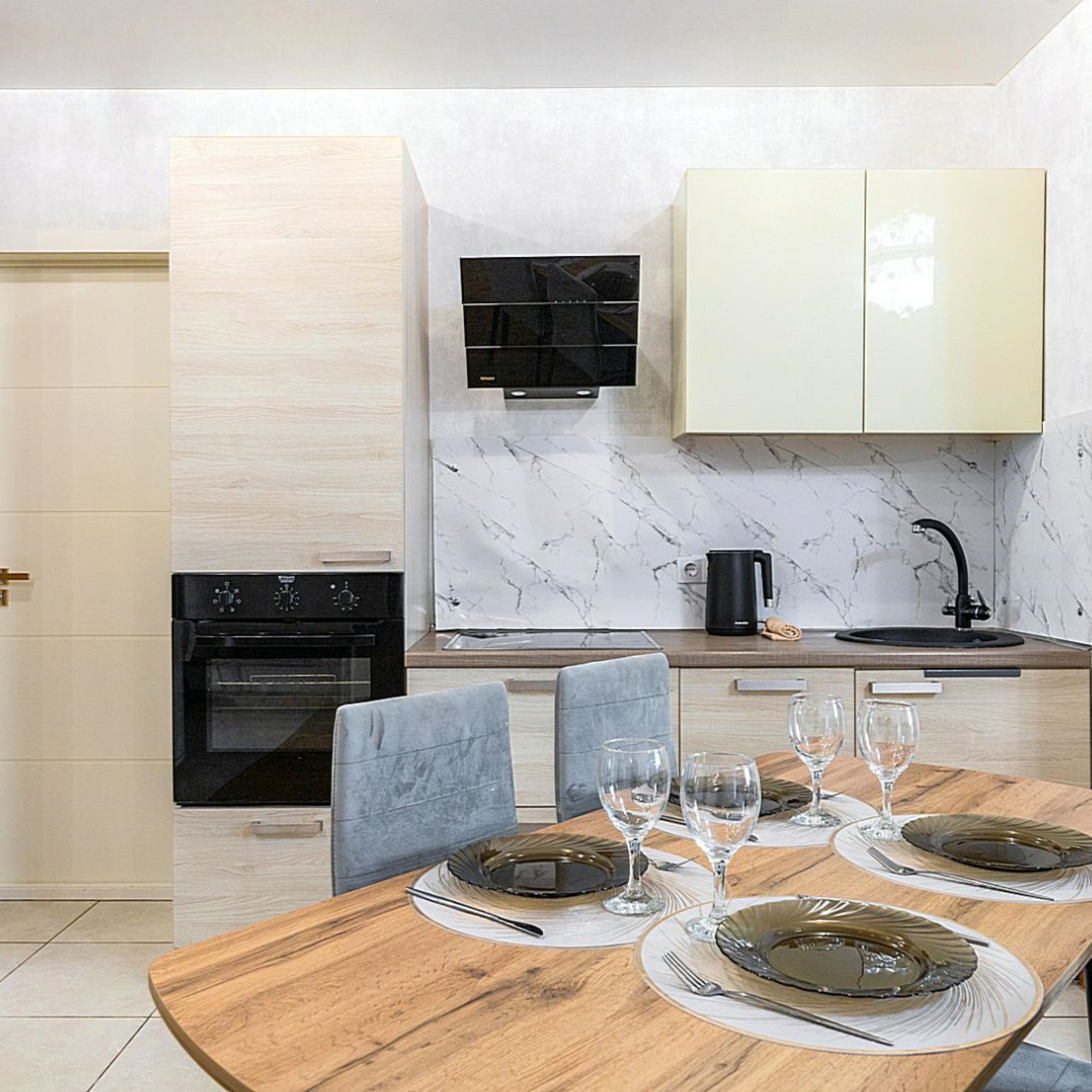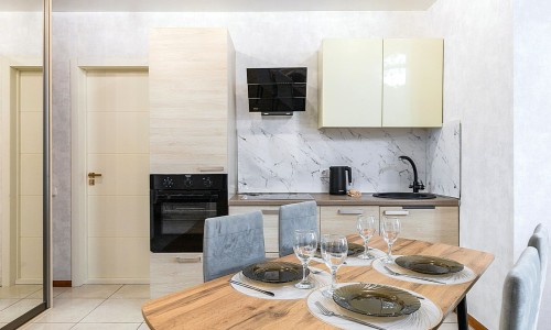 Кухонная зона оборудована варочной панелью, свч печью, духовым шкафом, встроенным холодильником, чайником и всей необходимой посудой.