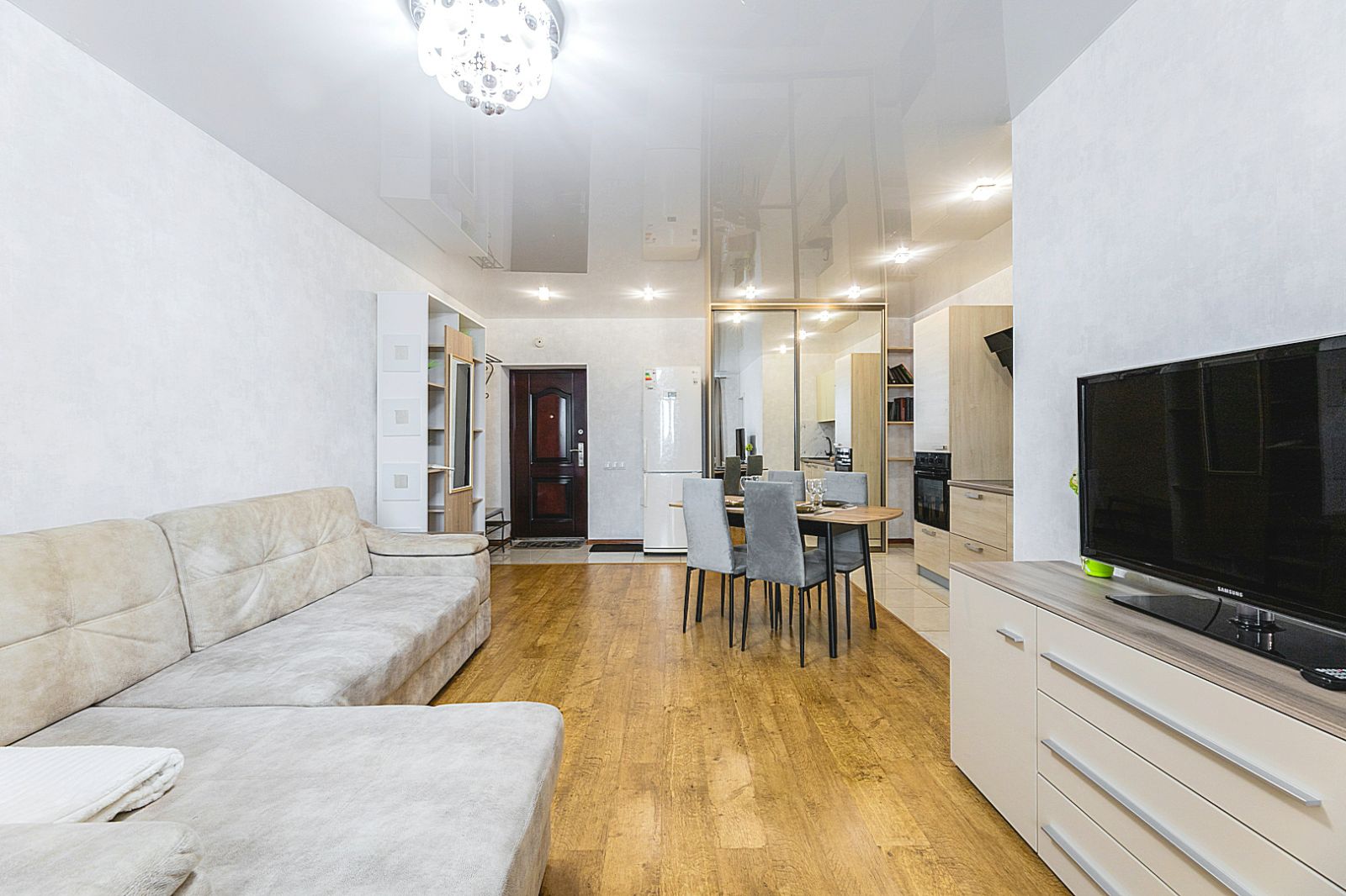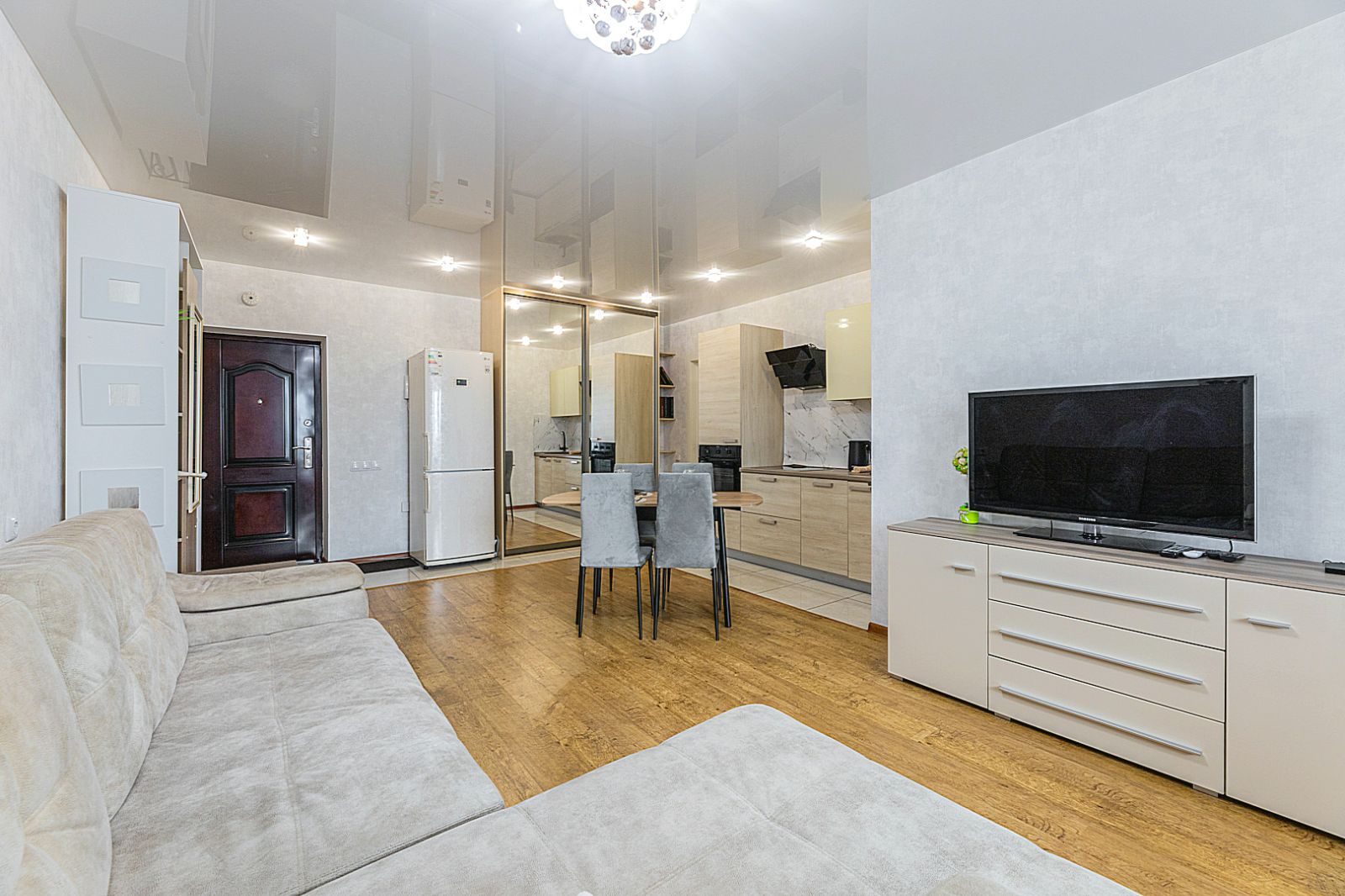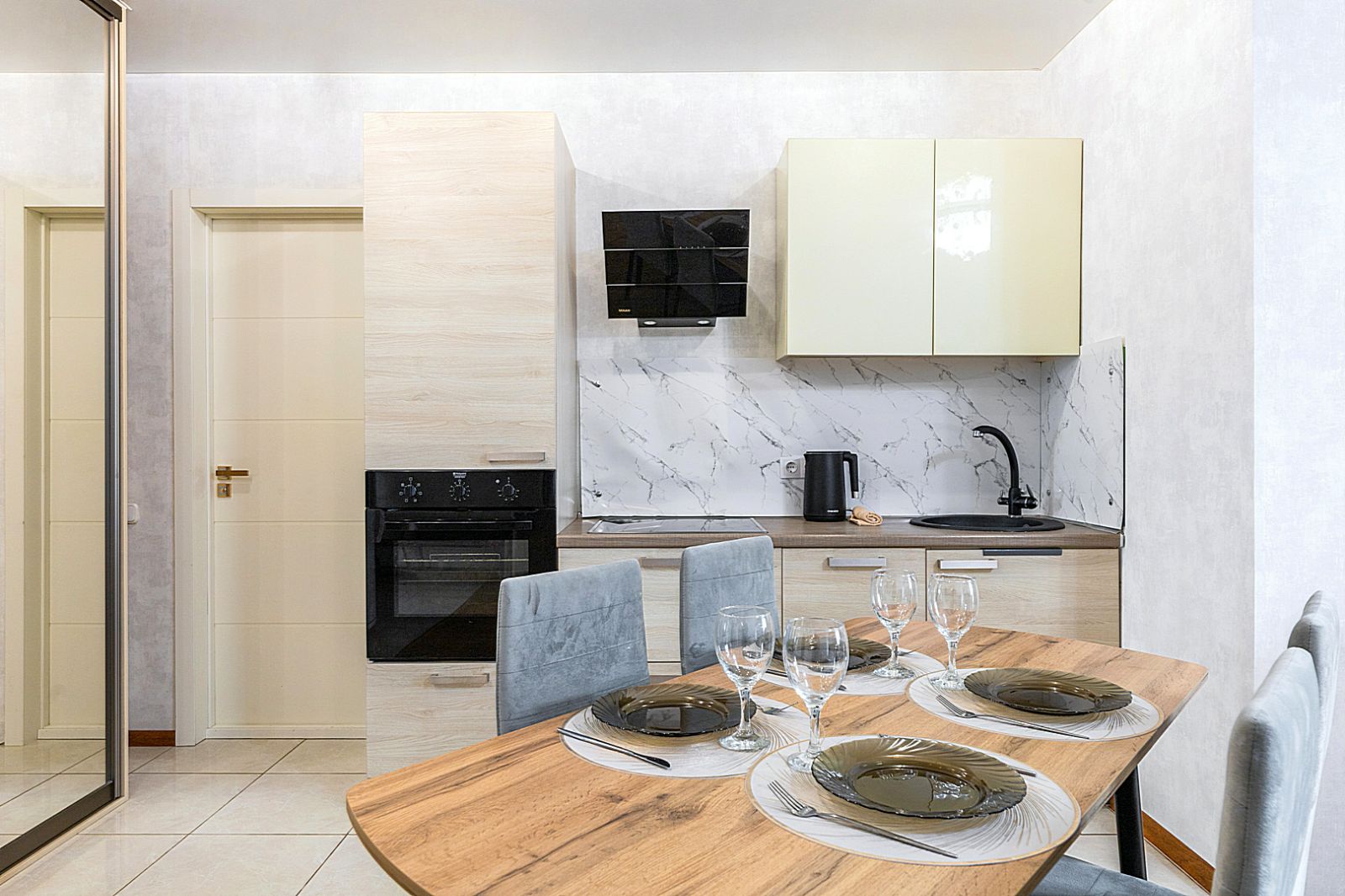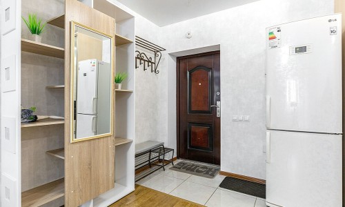 Кухонная зона оборудована варочной панелью, свч печью, духовым шкафом, встроенным холодильником, чайником и всей необходимой посудой.