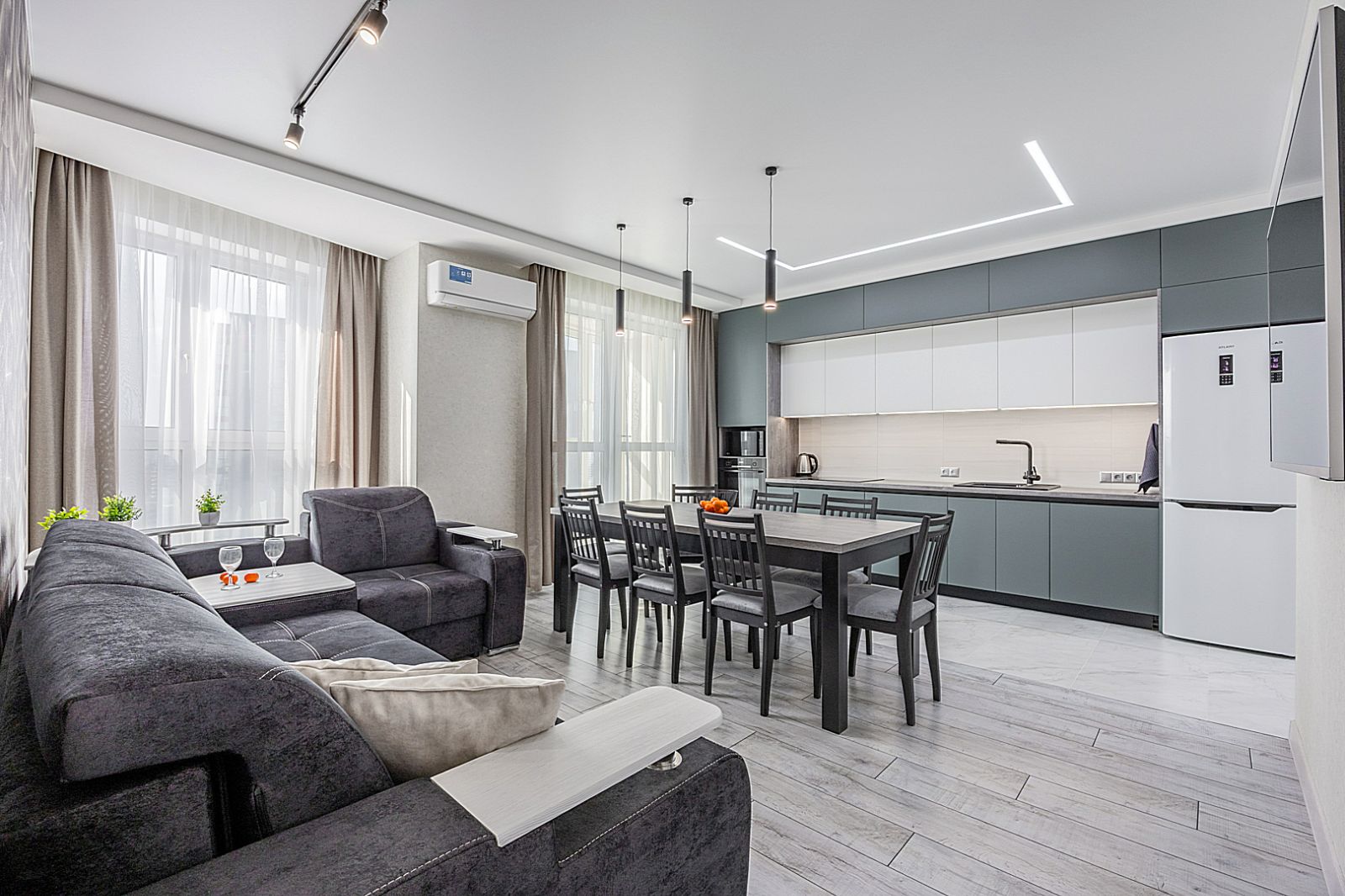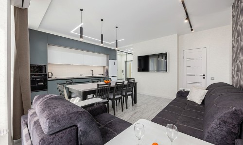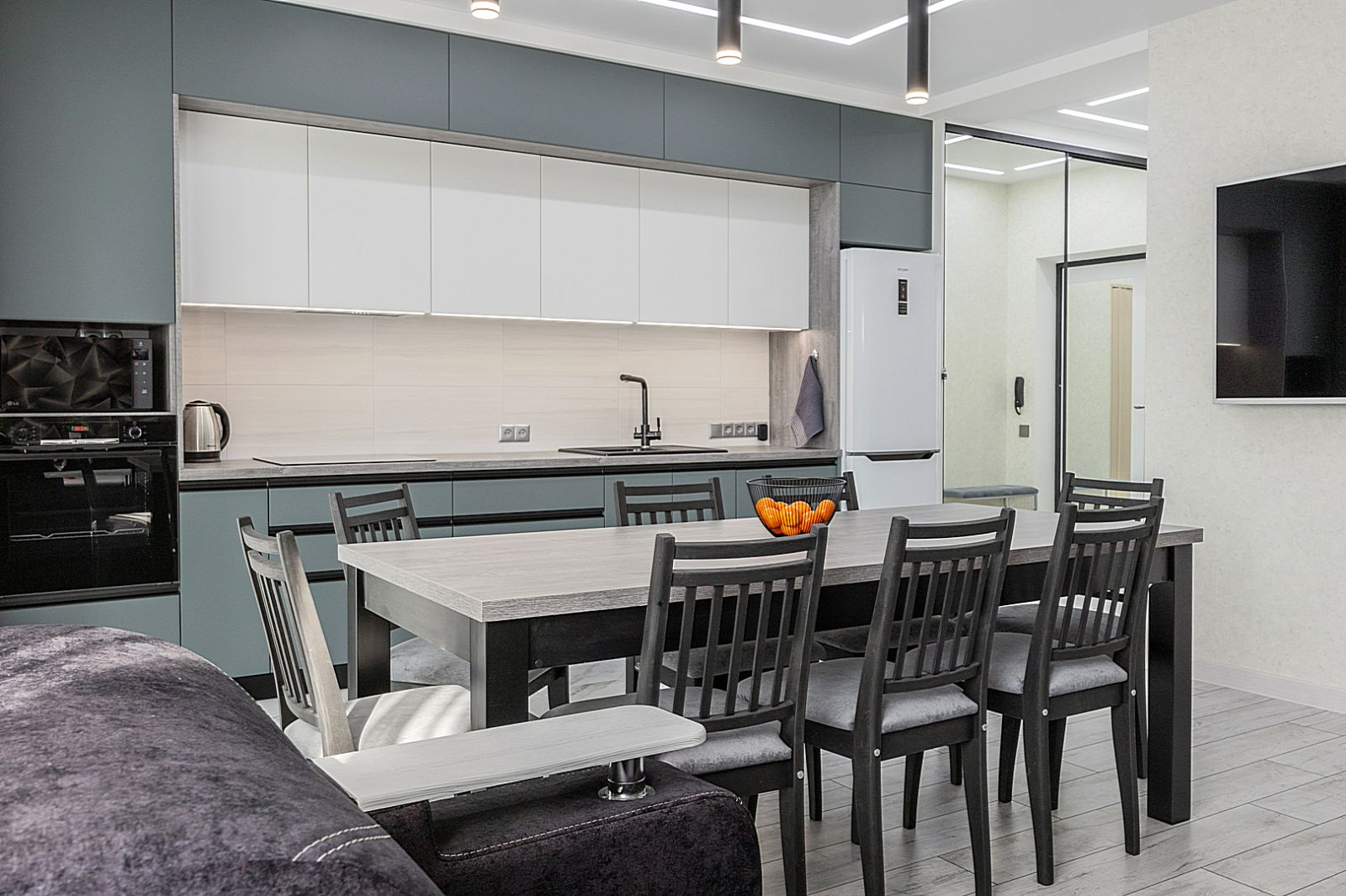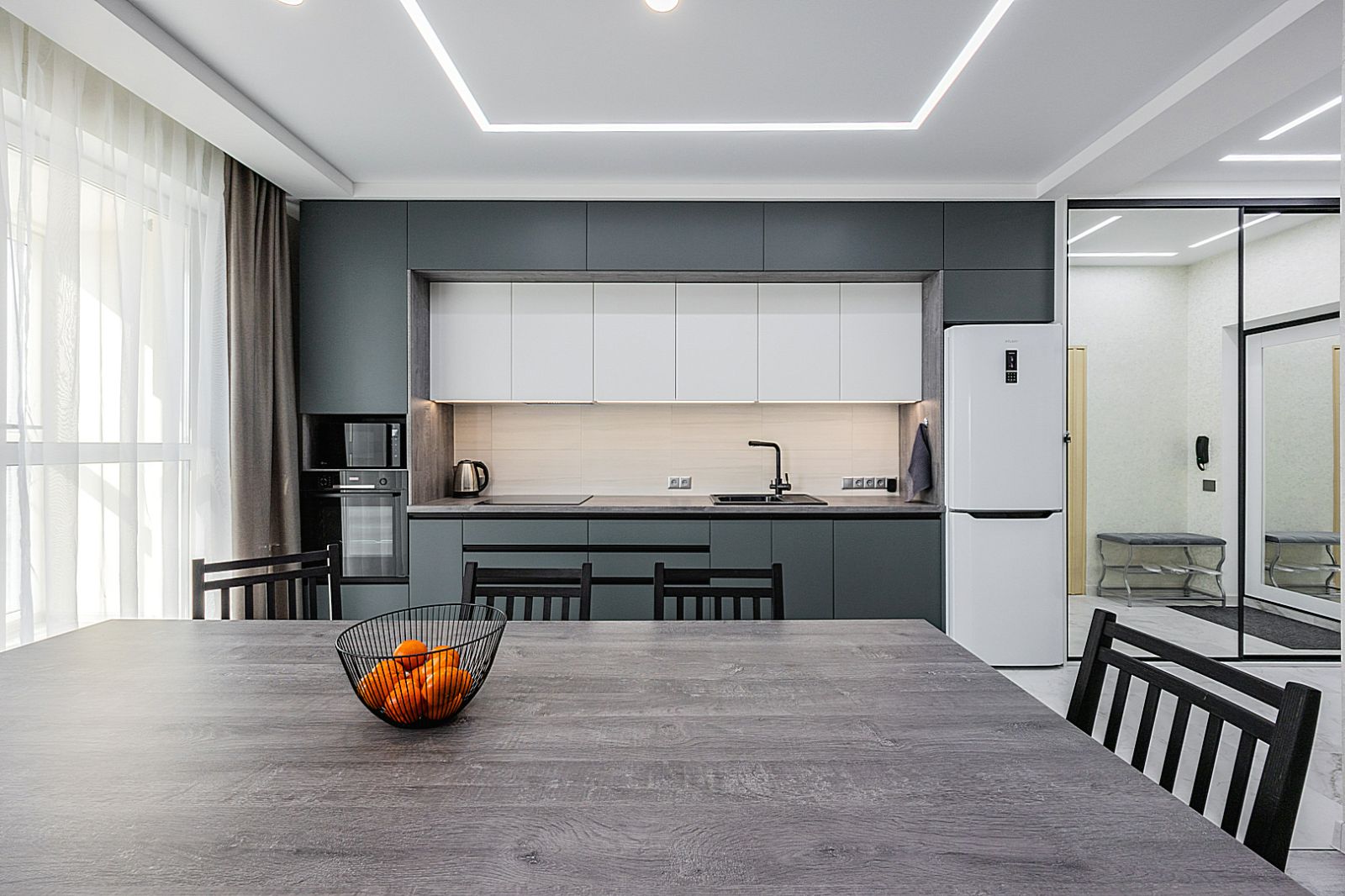 Кухонная зоной оборудована варочной панелью,посудомоечной машиной ,свч печь, духовой шкаф, встроенный холодильник и вся необходимая посуда.