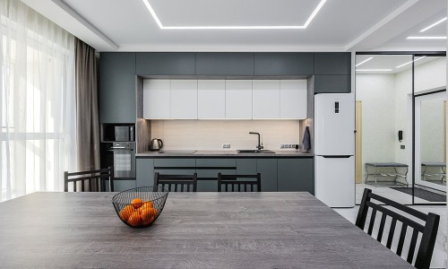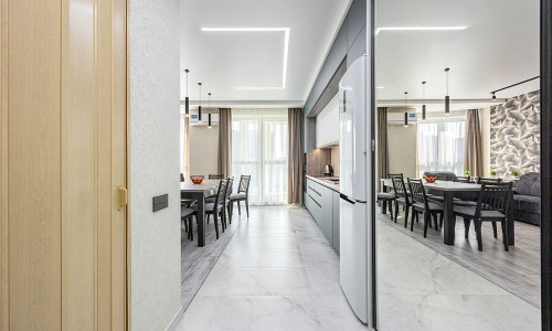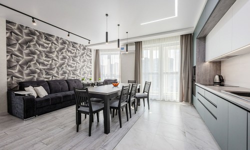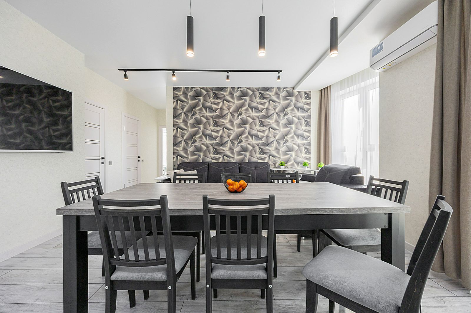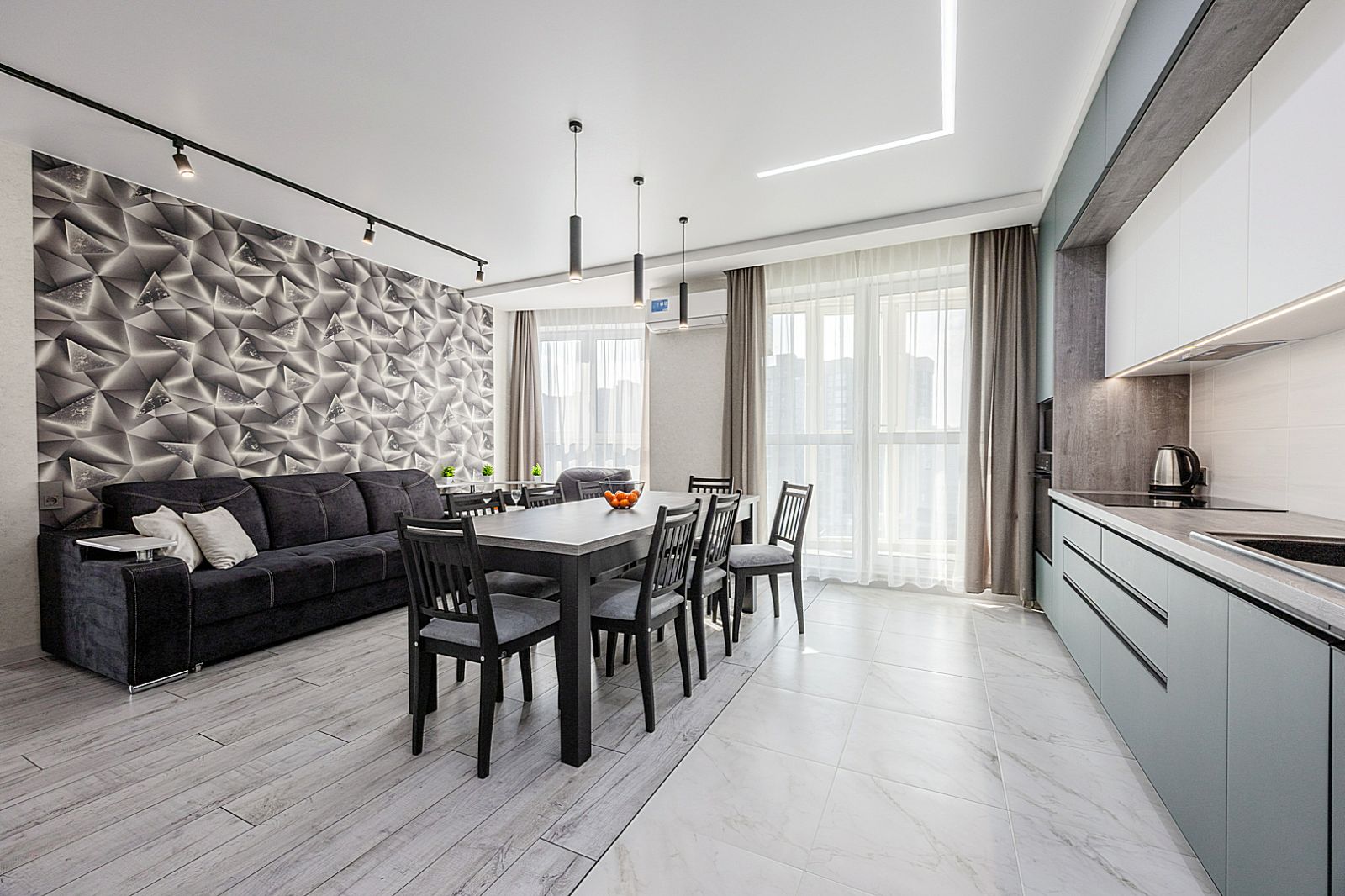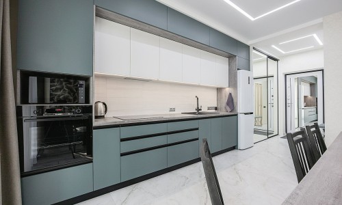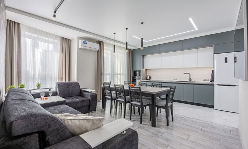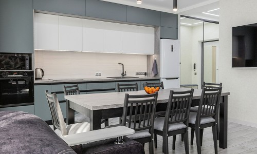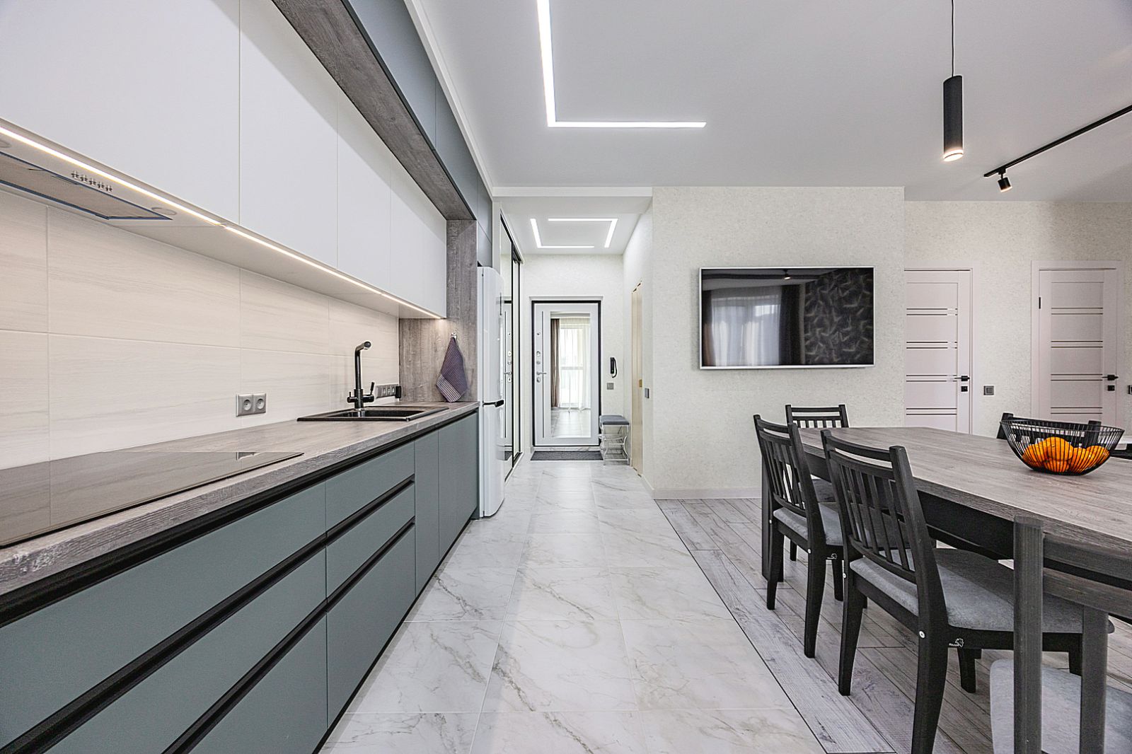 Кухонная зоной оборудована варочной панелью,посудомоечной машиной ,свч печь, духовой шкаф, встроенный холодильник и вся необходимая посуда.