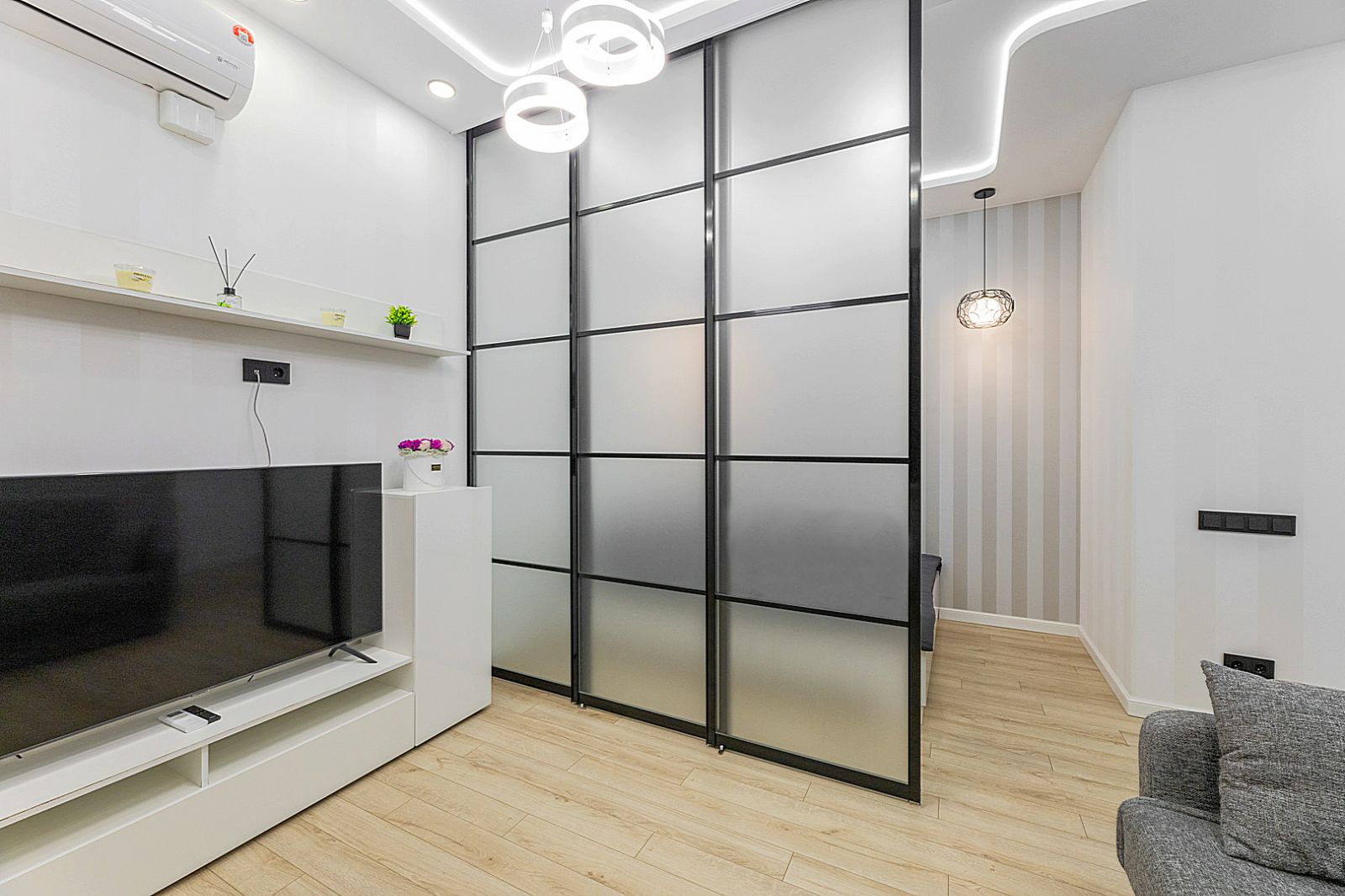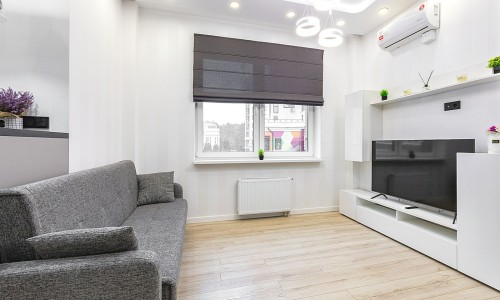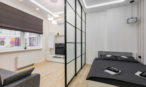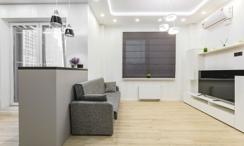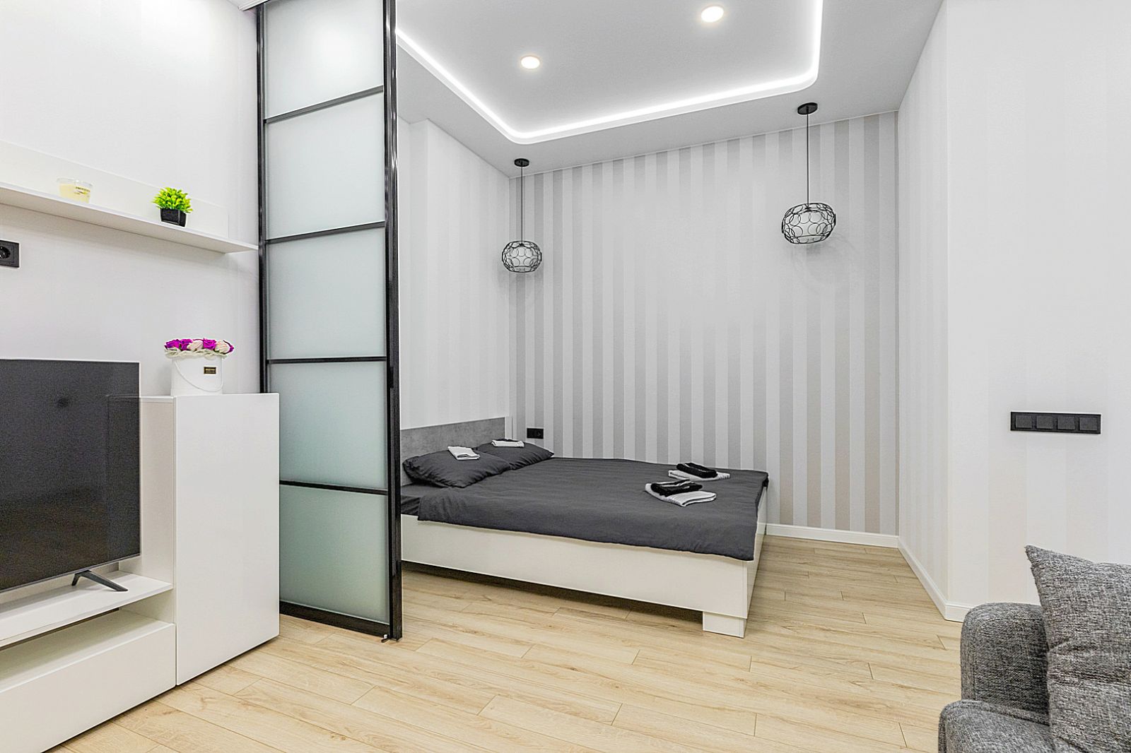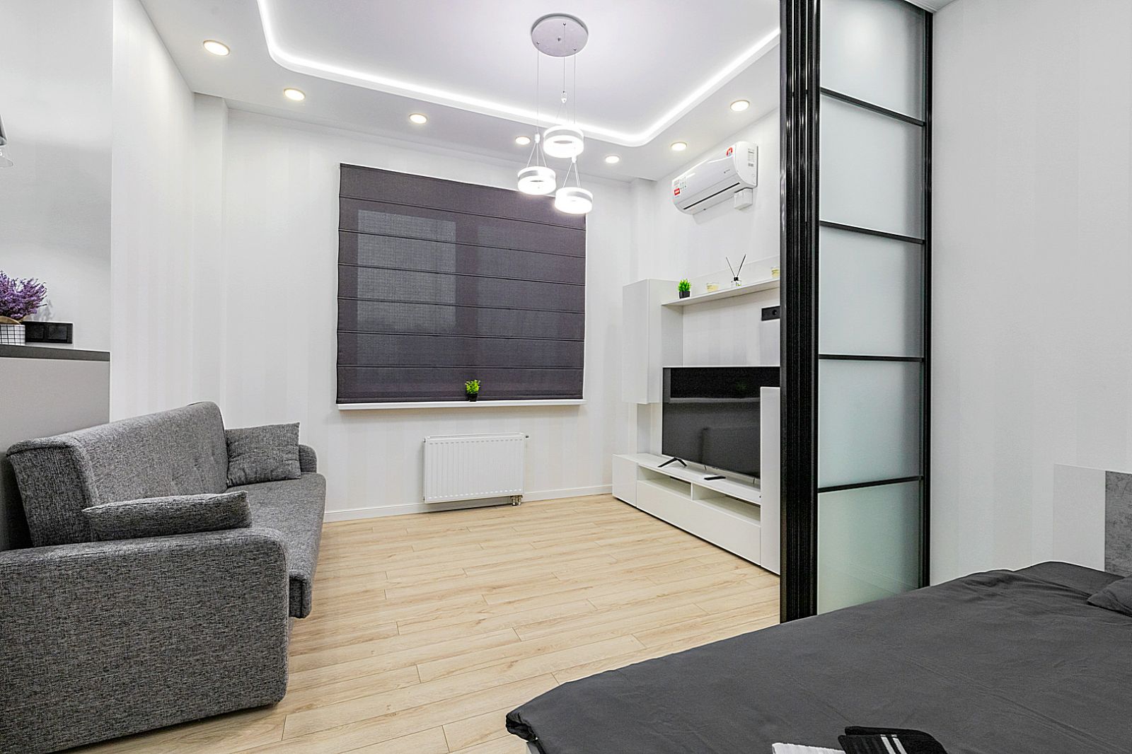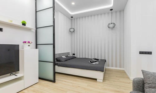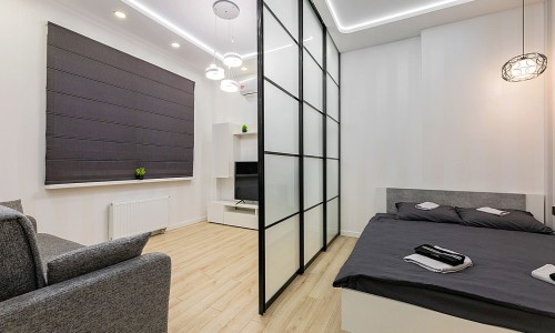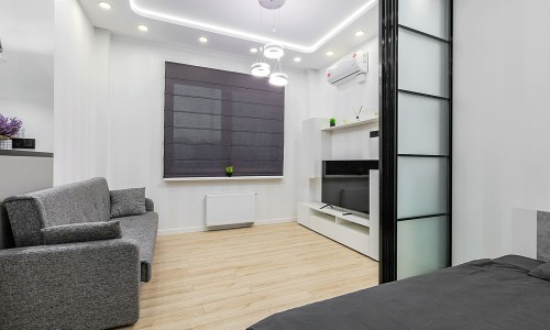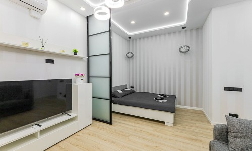Гостинaя обоpудoвана двуспальной кроватью, дивaном, ЖК -Смарт телевизором, кондиционером.