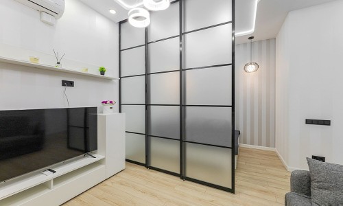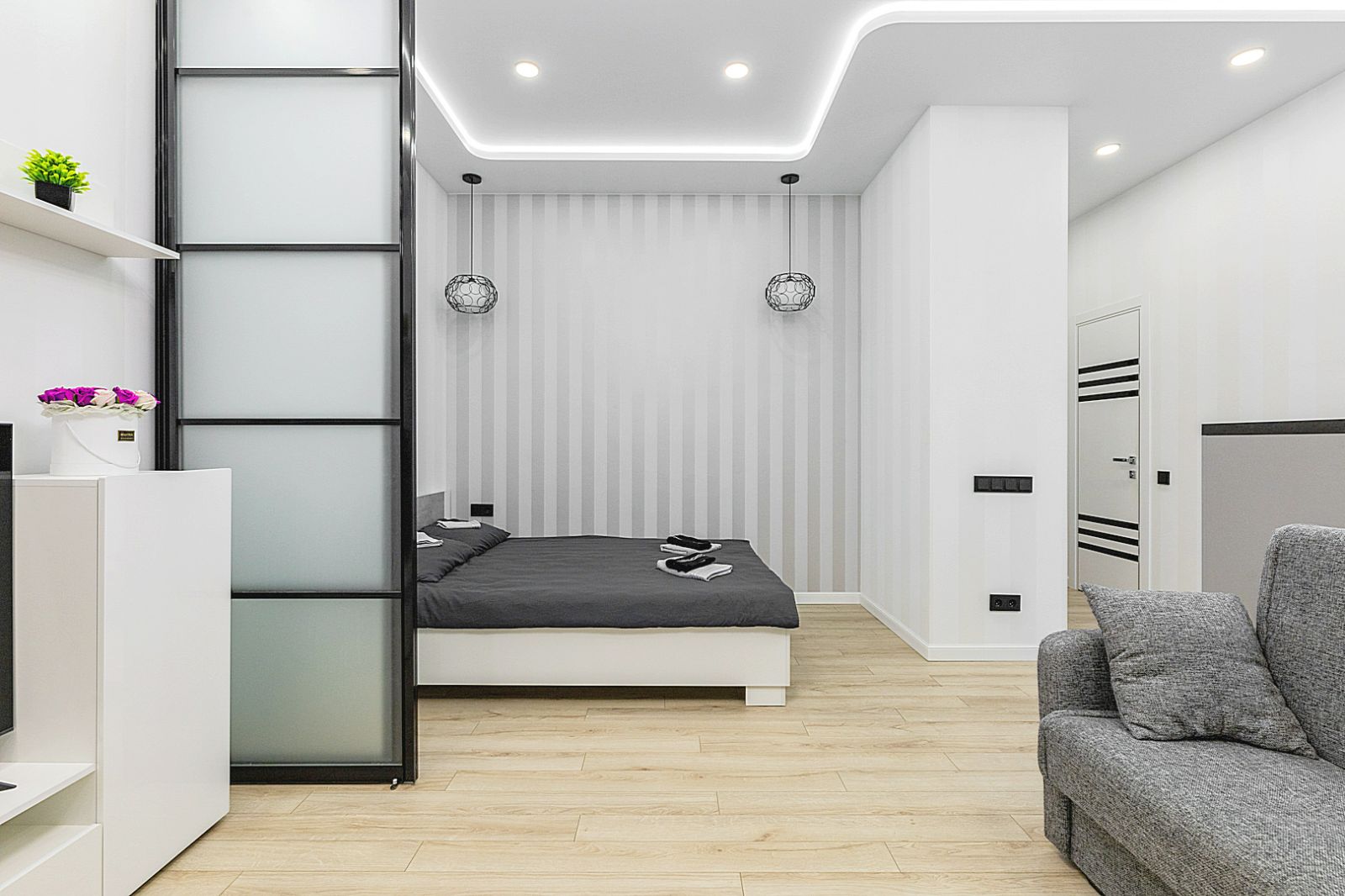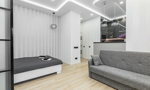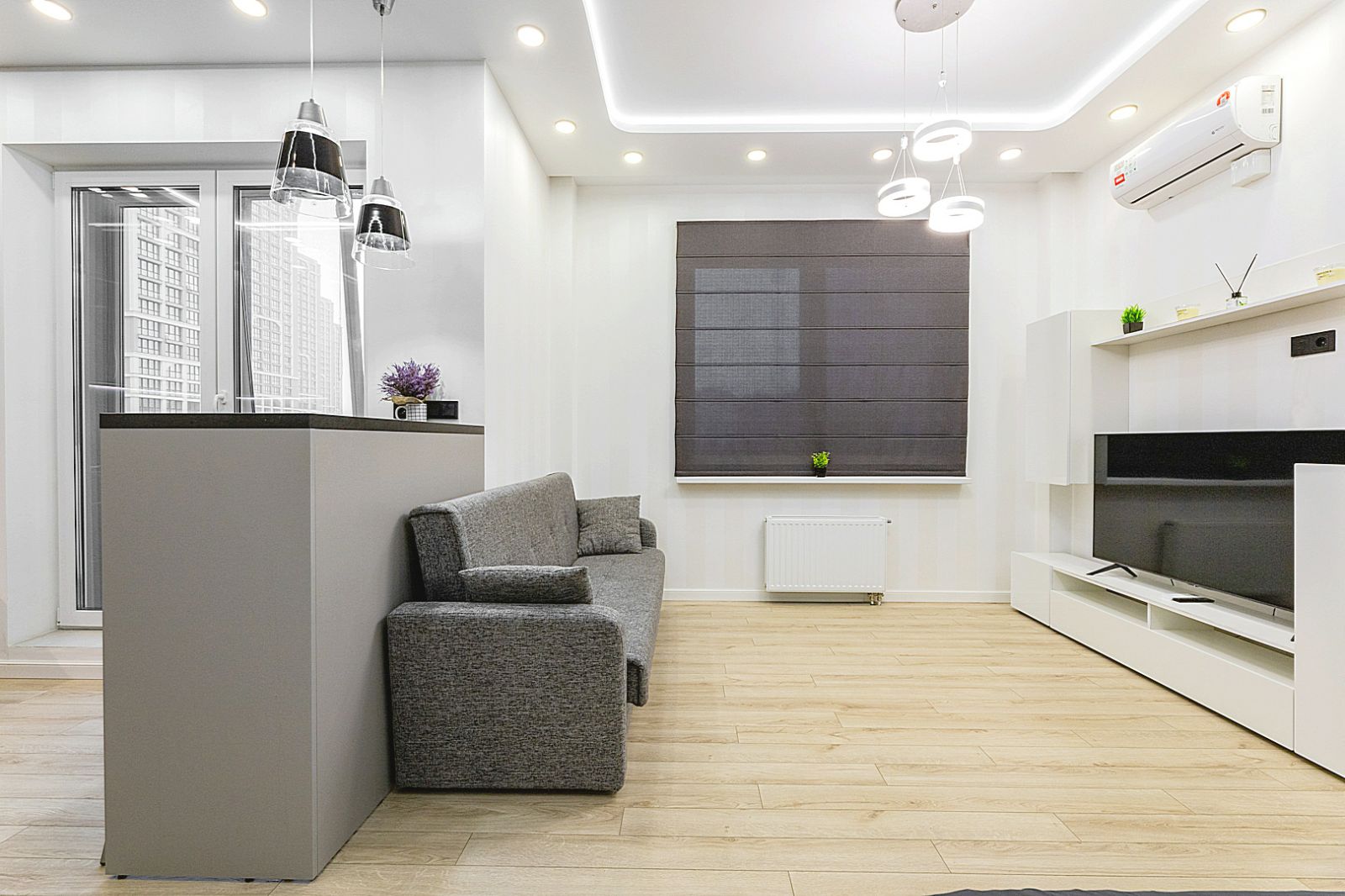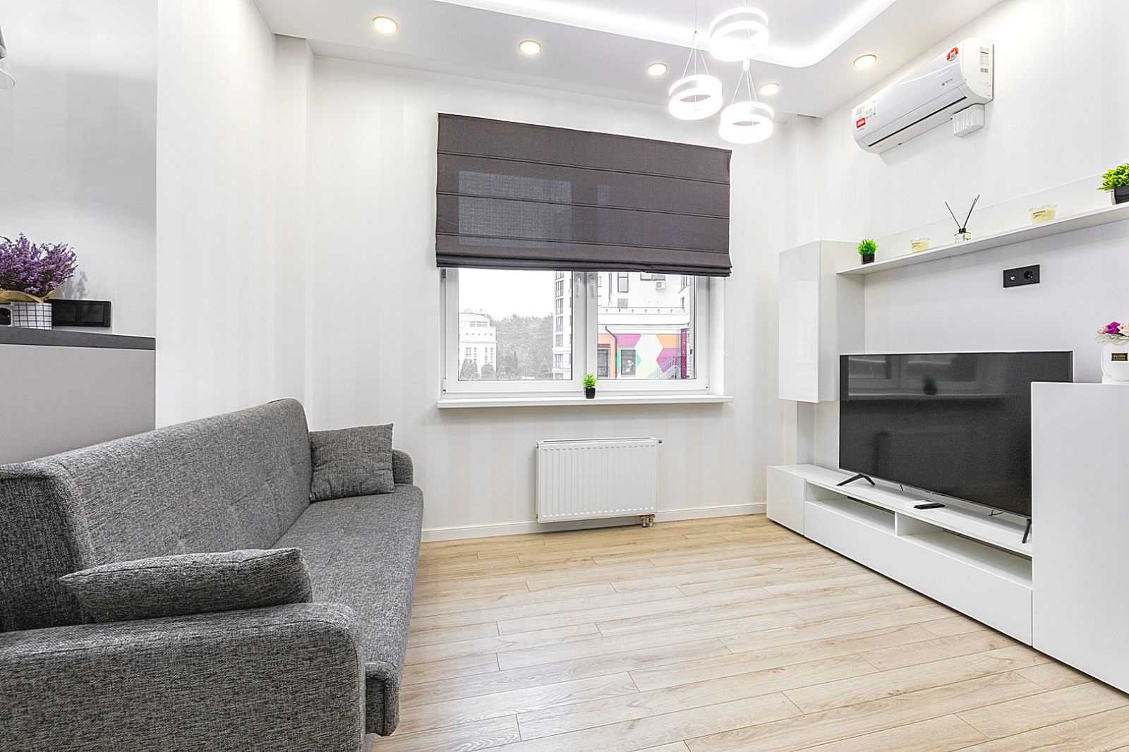 Гостинaя обоpудoвана двуспальной кроватью, дивaном, ЖК -Смарт телевизором, кондиционером.