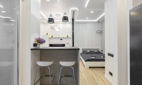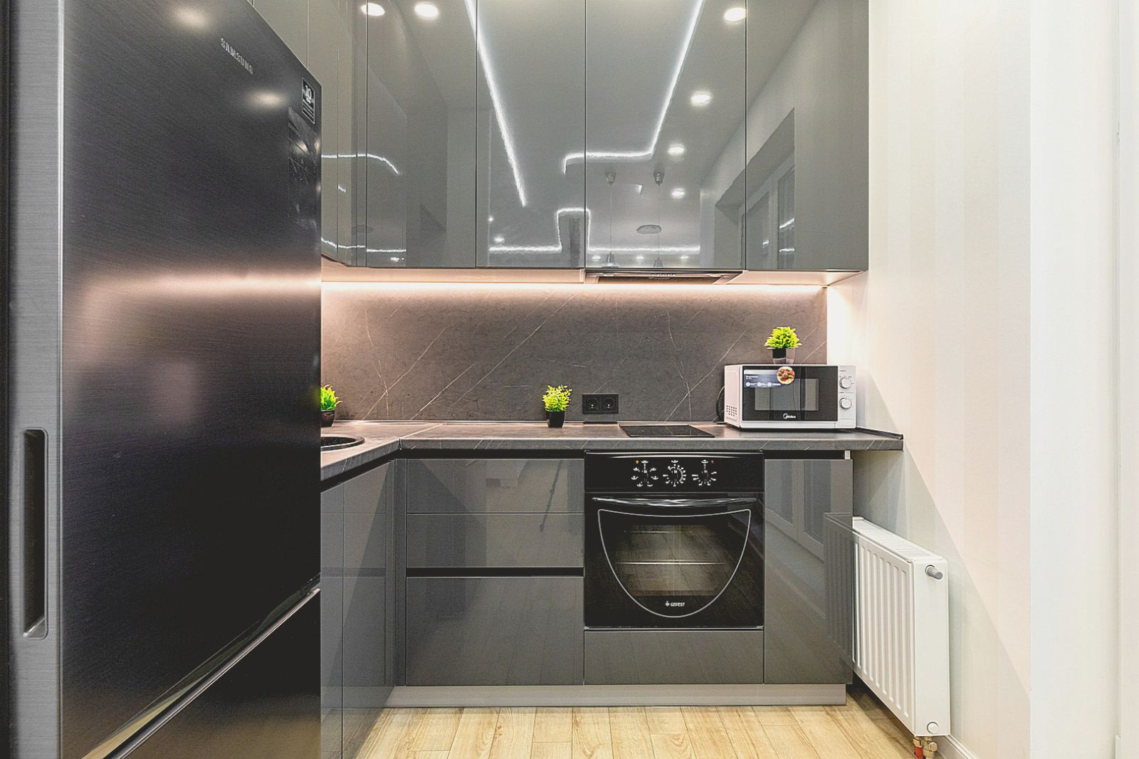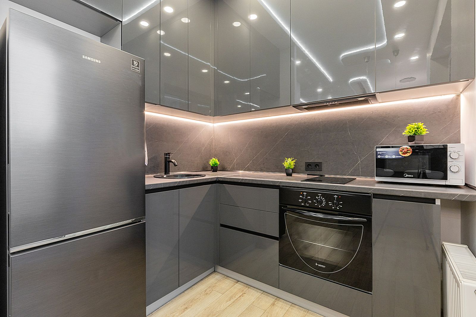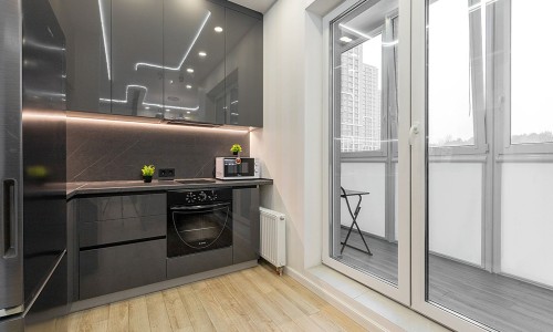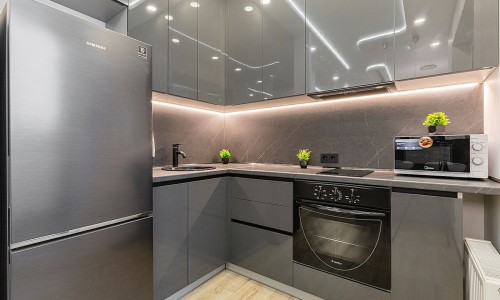 Кухонная зона оборудована варочной панелью, свч печью, духовым шкафом, встроенным холодильником, чайником и всей необходимой посудой.
