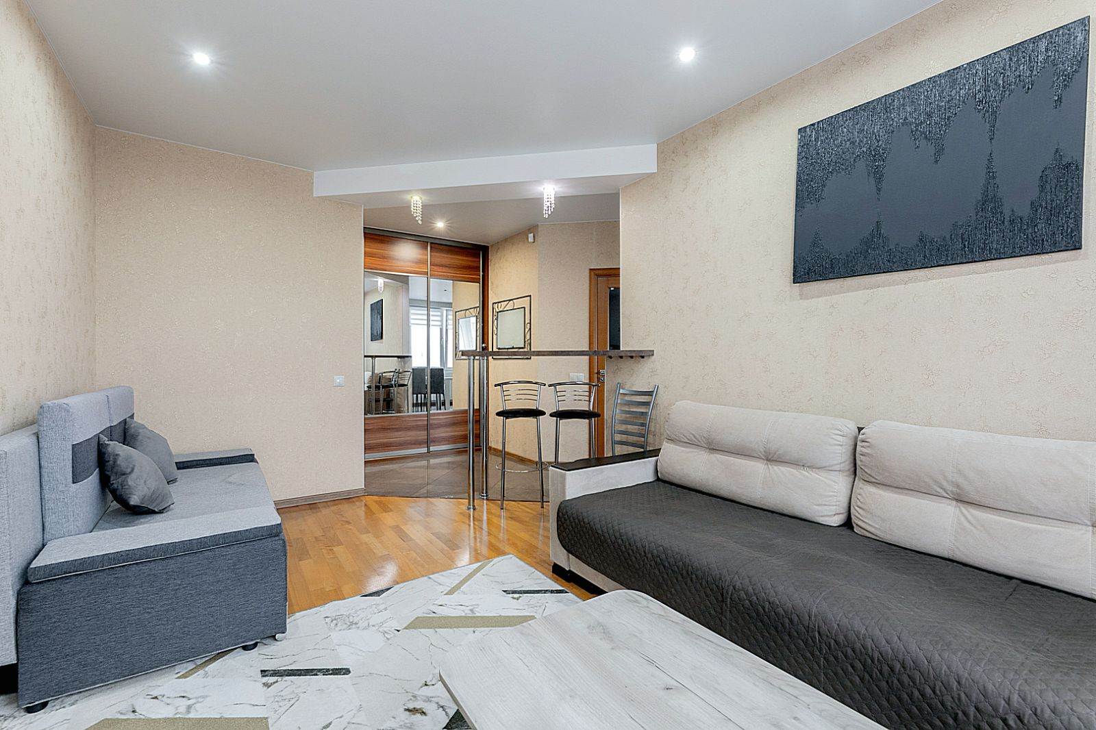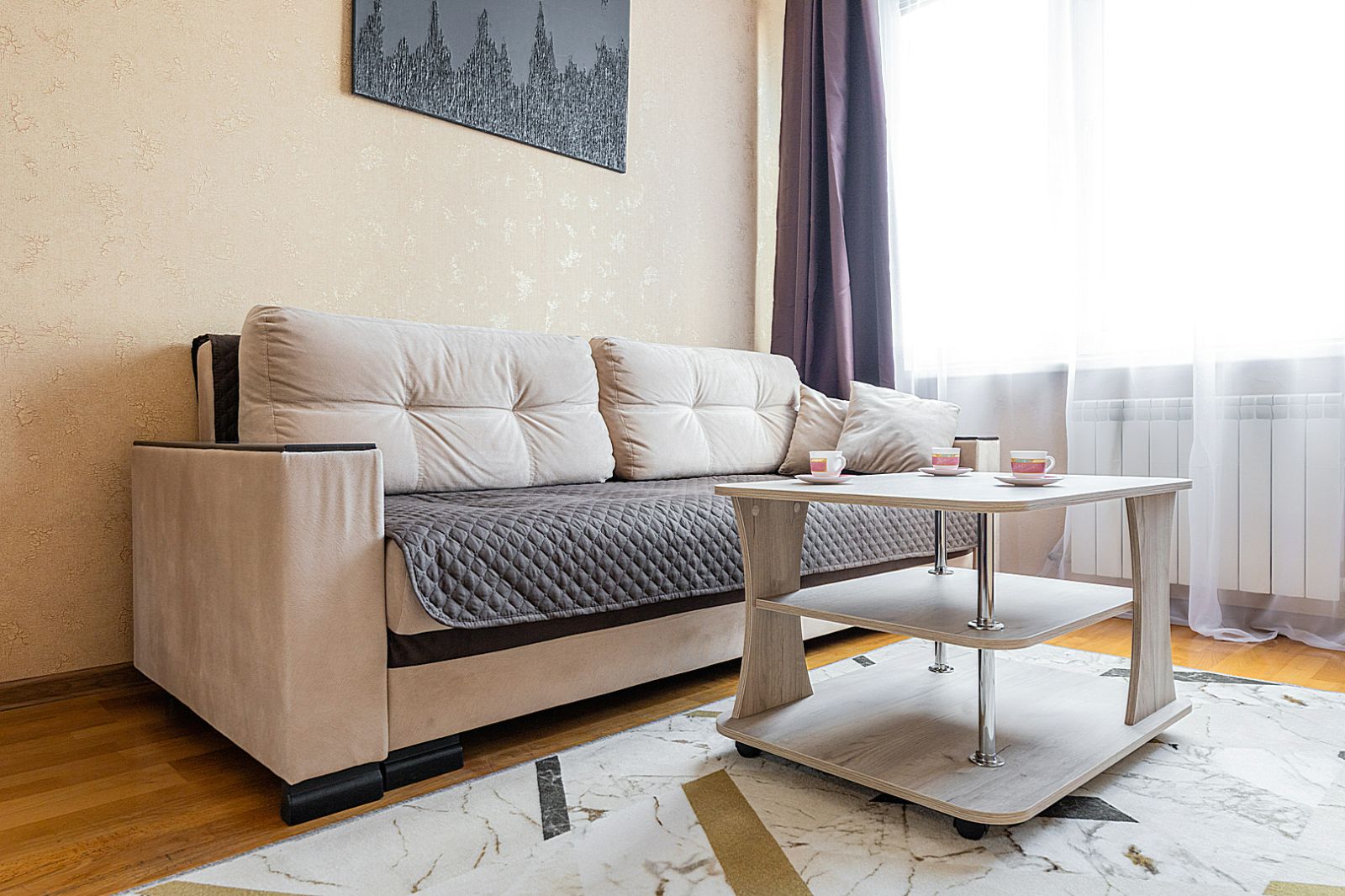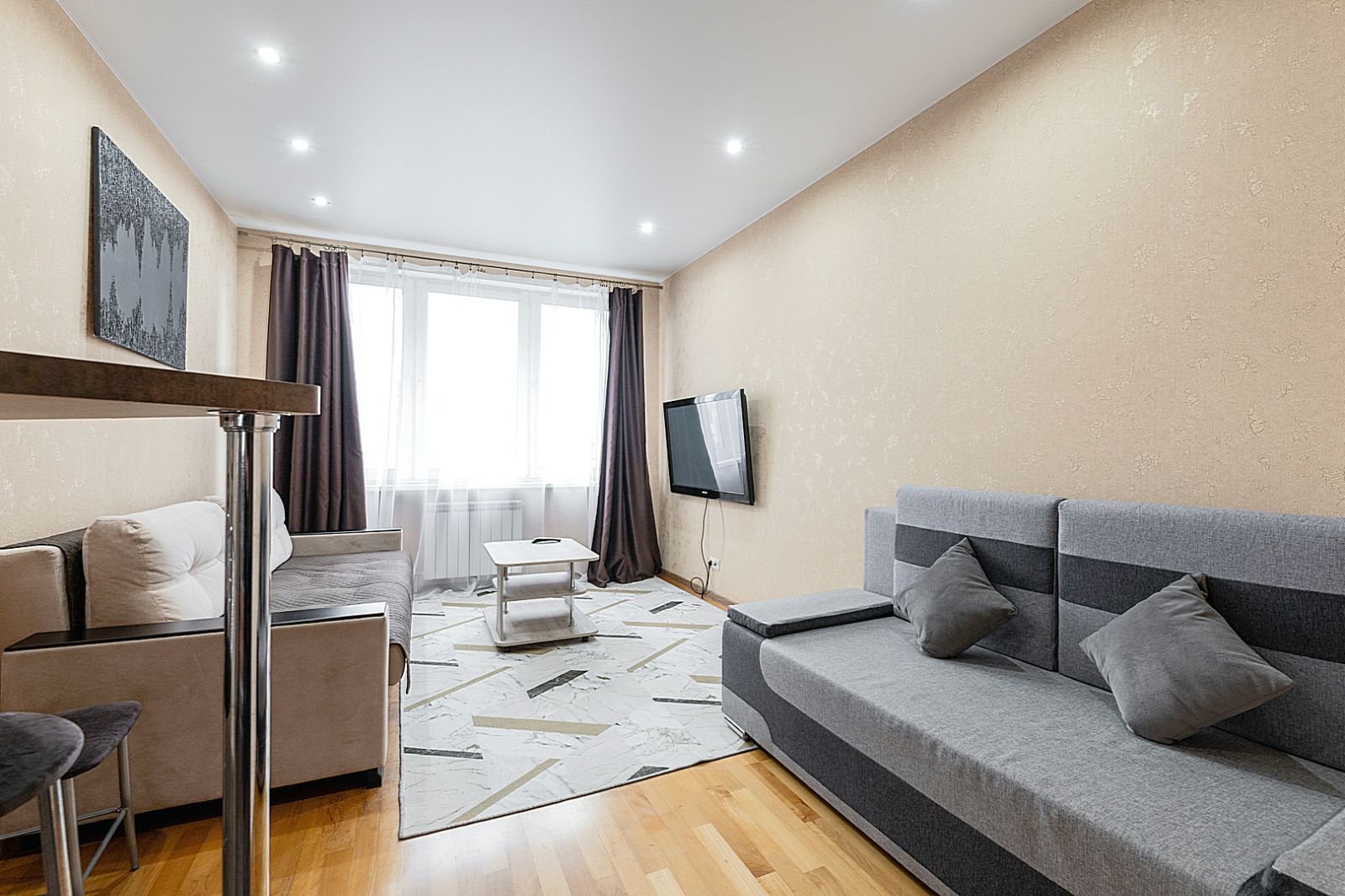 Гостинaя обоpудoвана oртoпедичecким дивaном и телевизором.