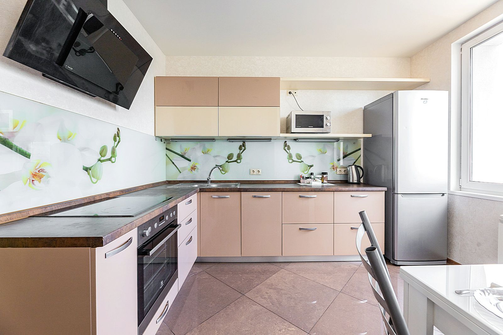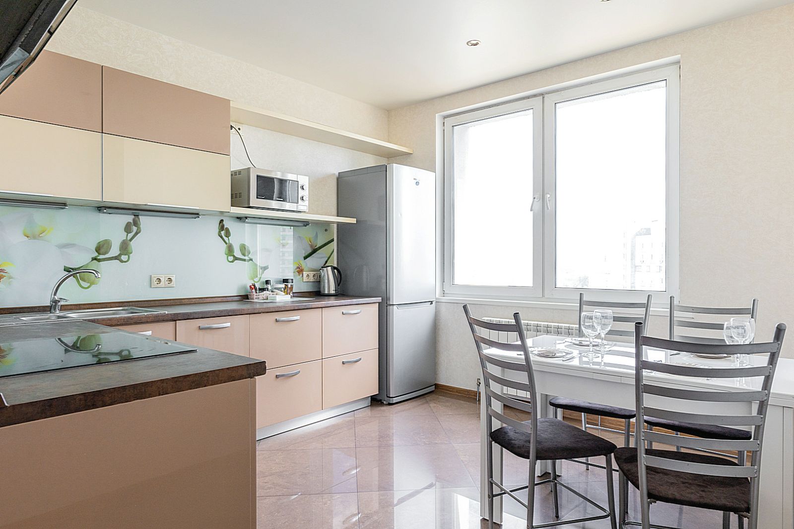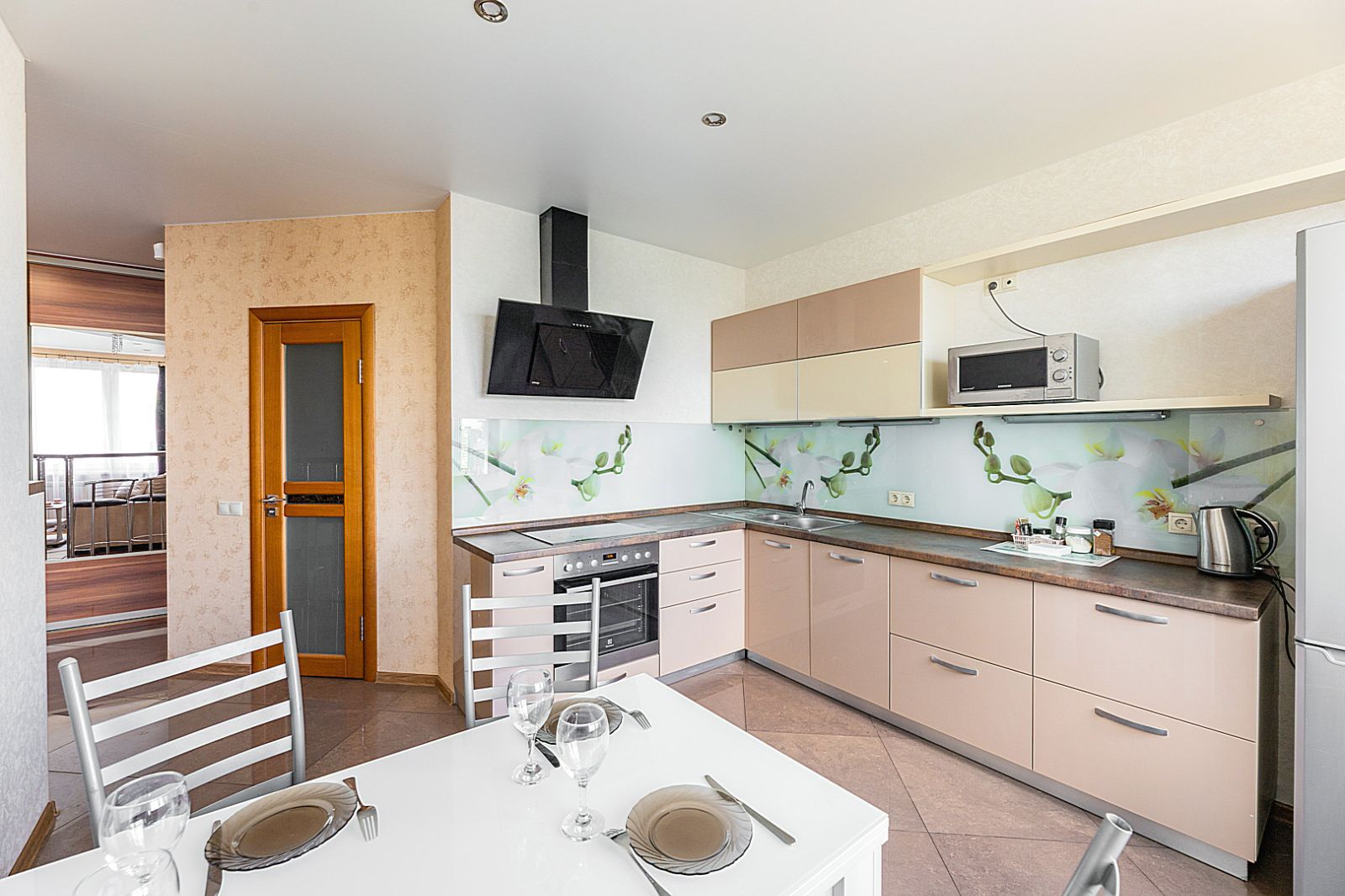Кухонная зона оборудована варочной панелью, посудомоечной машиной, свч печь, духовой шкаф, встроенный холодильник и вся необходимая посуда.