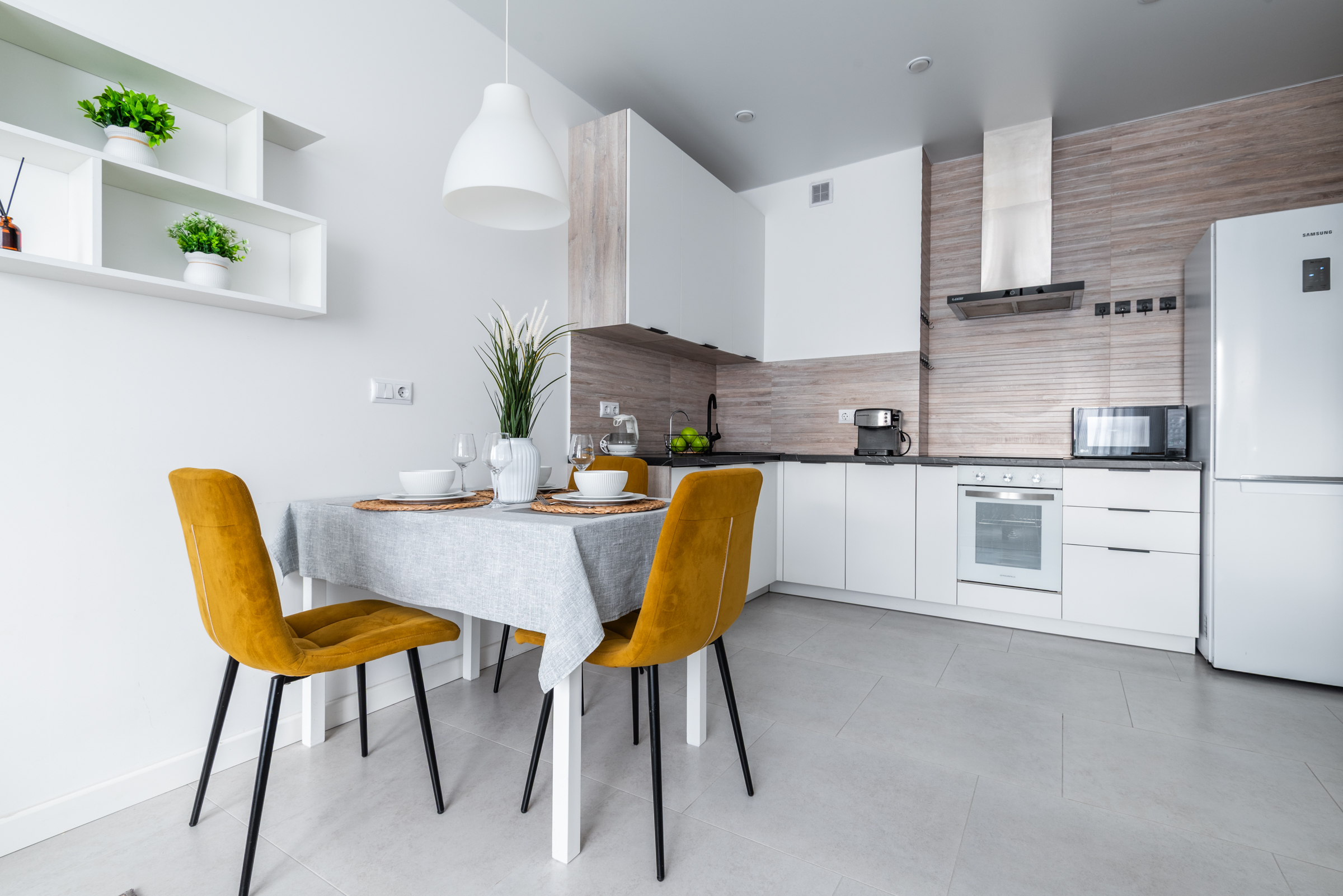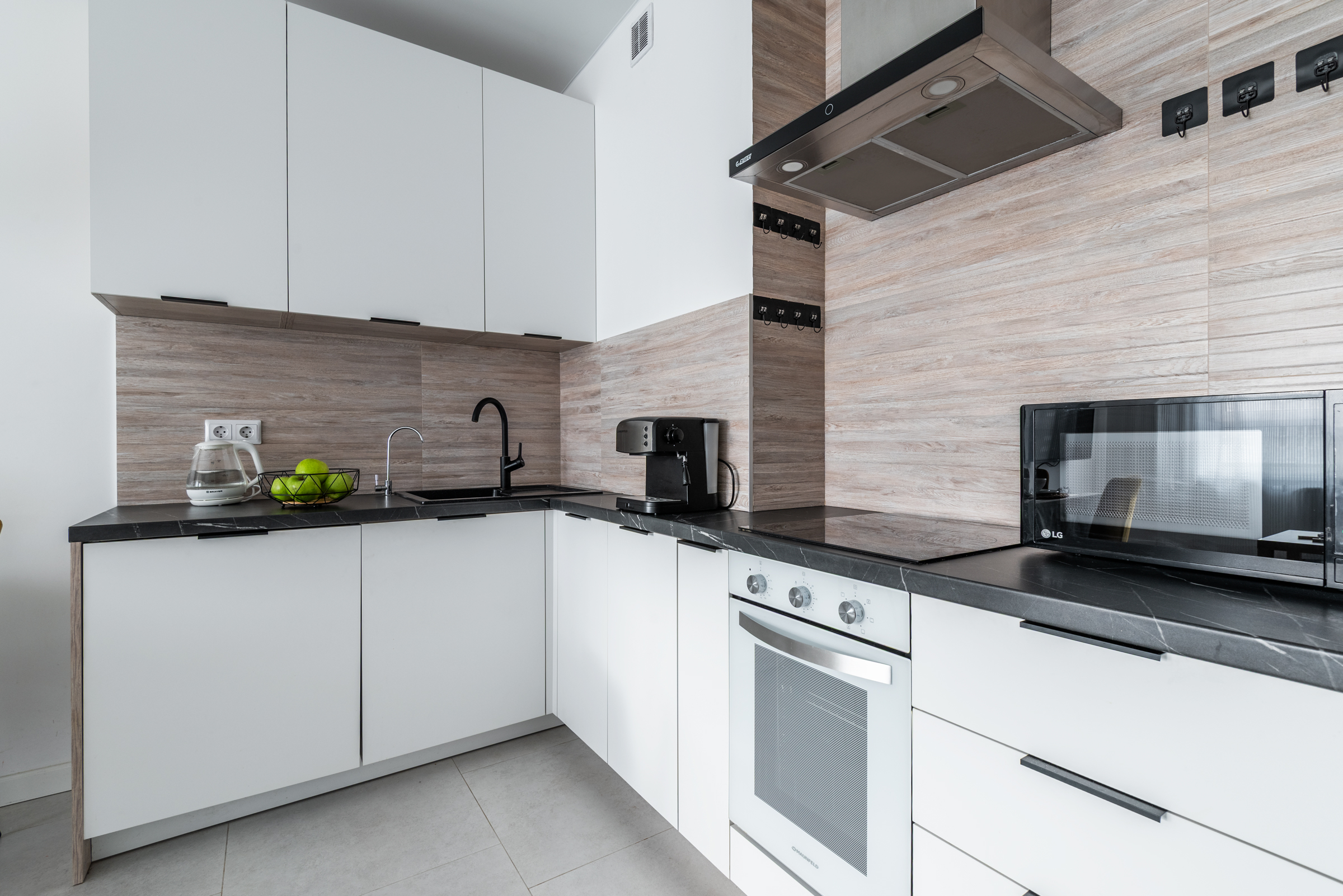 -Кофеварка, кондиционер, посудомоечная машина, СВЧ печь, духовой шкаф, электроплита, холодильник.