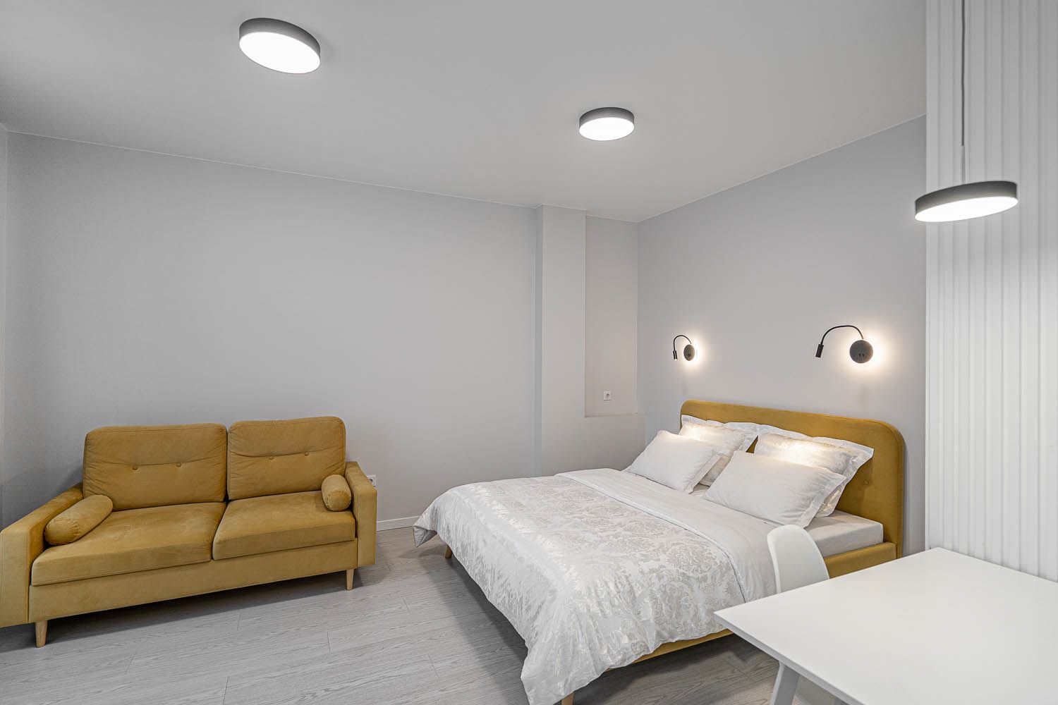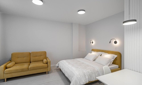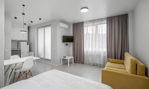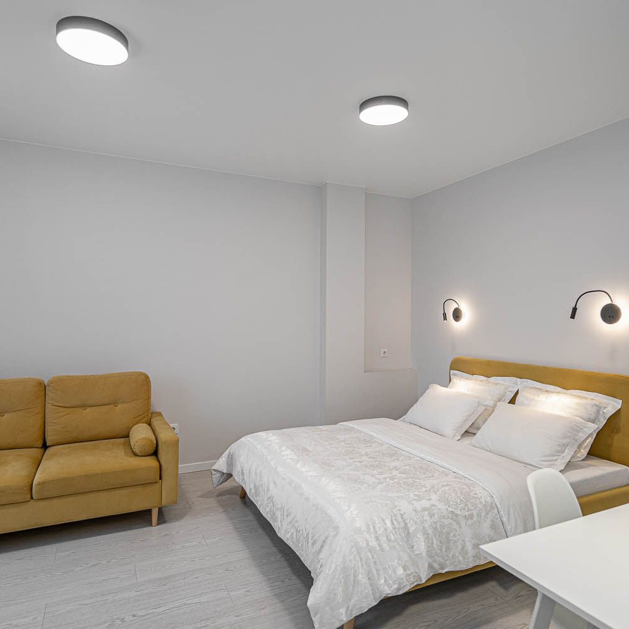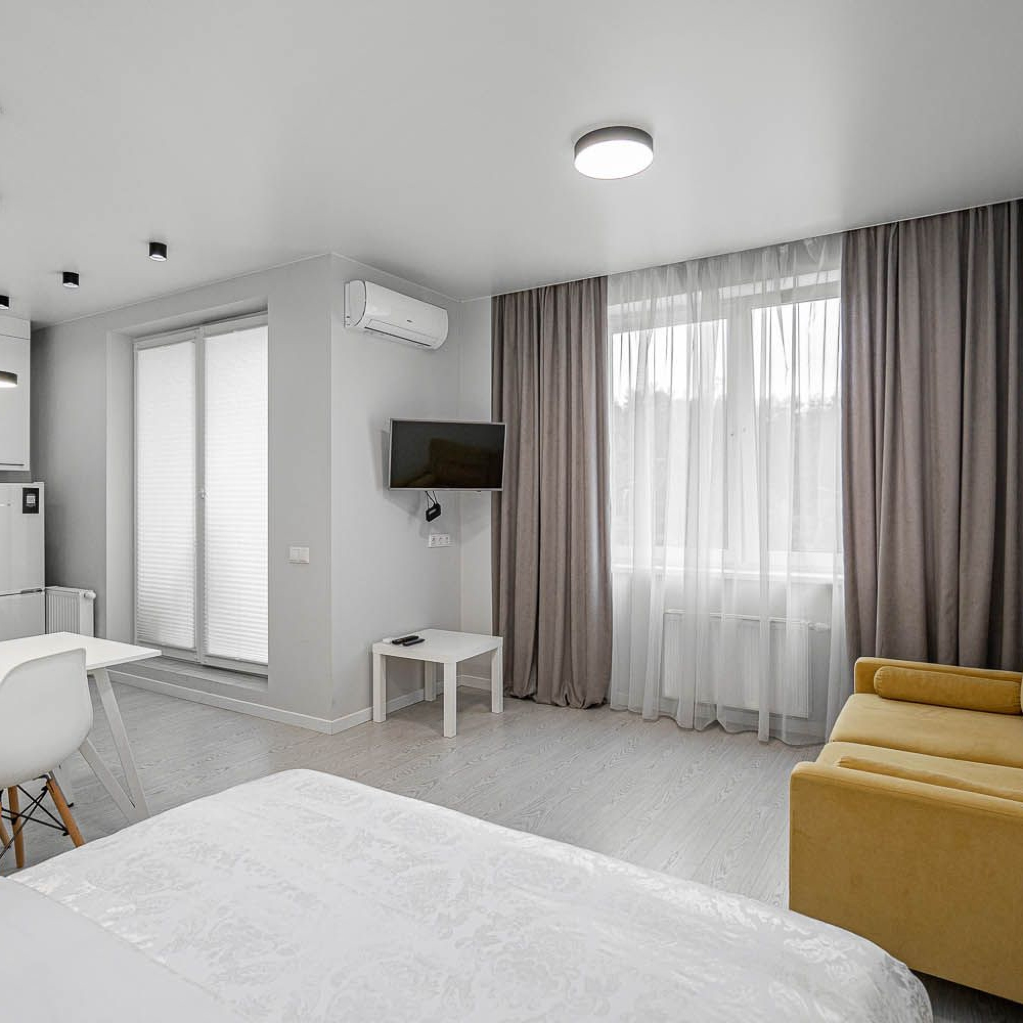 Внутреннее пространство квартиры продумано до мелочей. Здесь вас ждет большая двуспальная кровать, идеальная для спокойного и комфортного сна. Для удобства гостей квартира также оборудована раскладным диваном, который можно использовать для отдыха или размещения дополнительных гостей. Современный интерьер наполняет пространство светом и теплом, создавая атмосферу домашнего уюта.