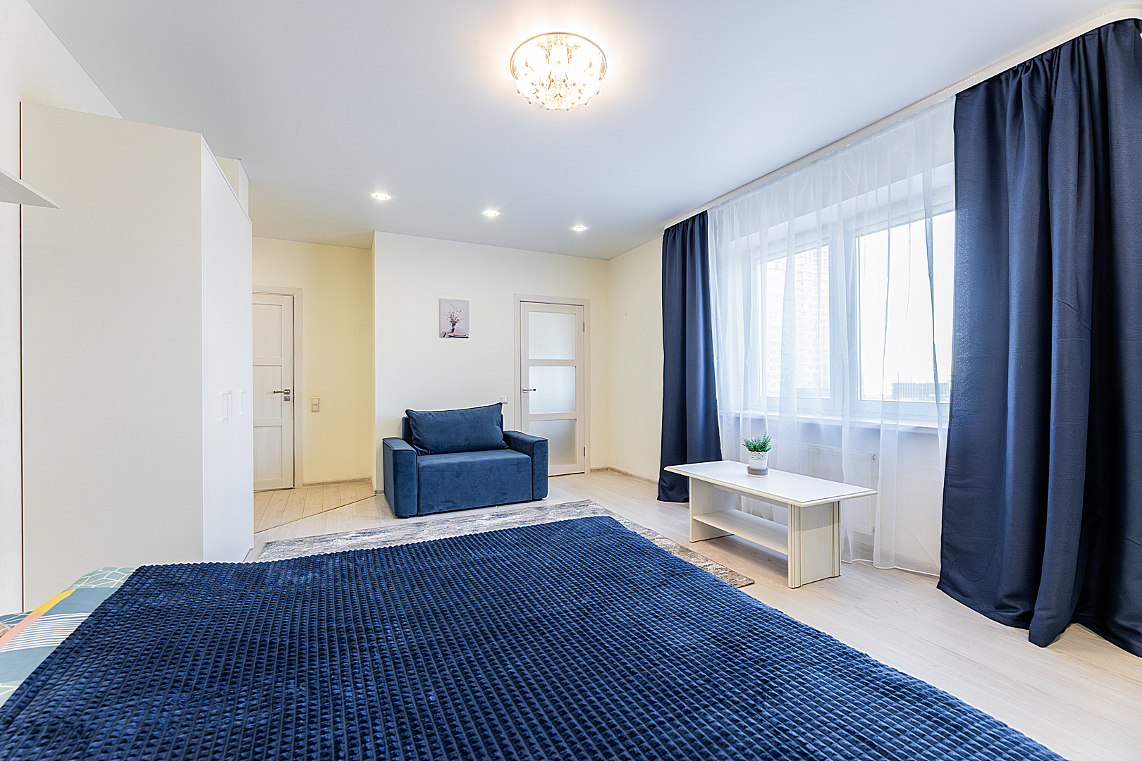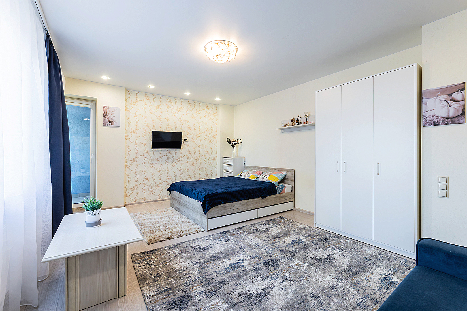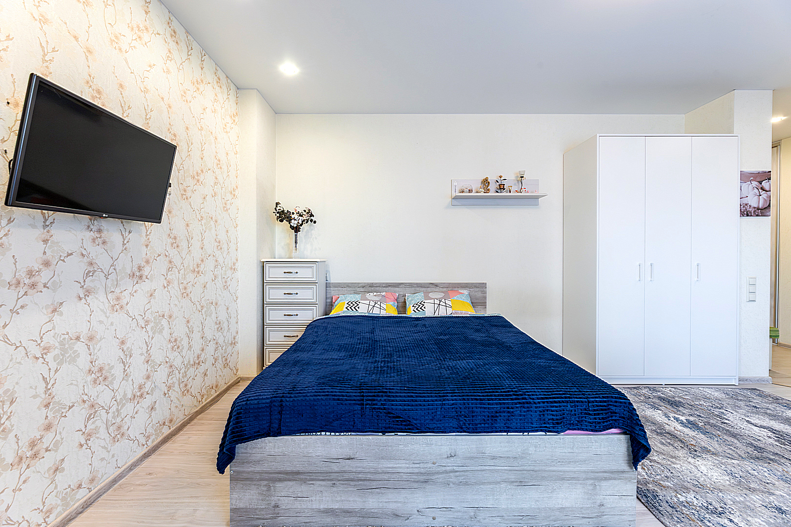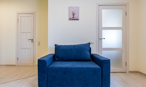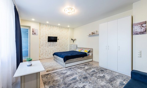 Гостинaя обоpудoвана двуспальной кроватью, раскладным креслом, телевизором, шкафом.