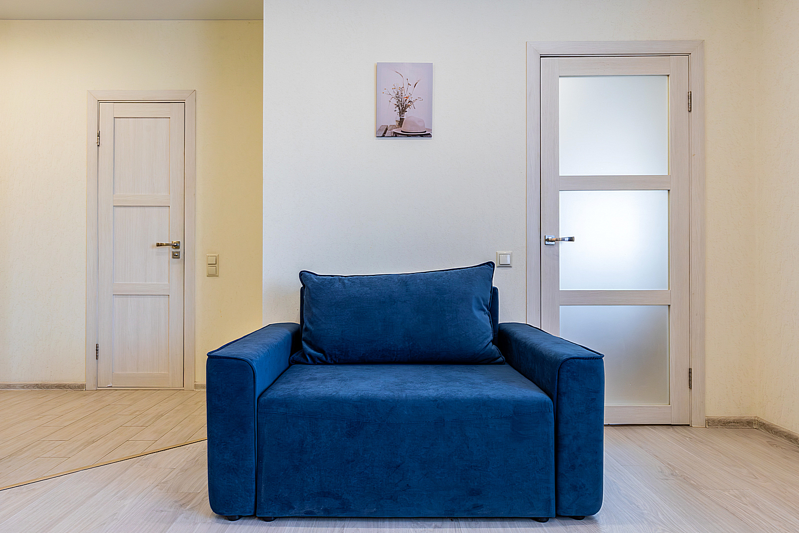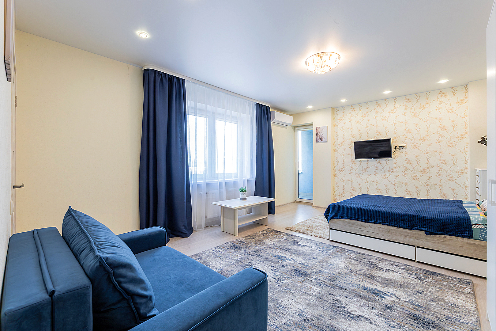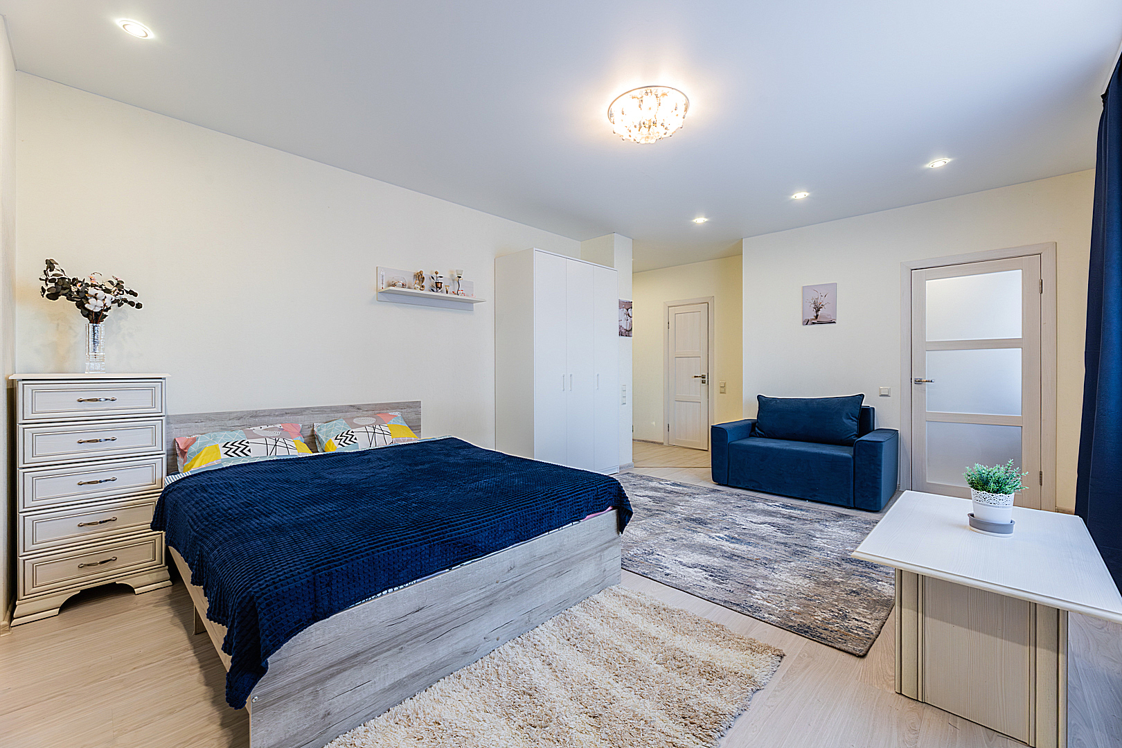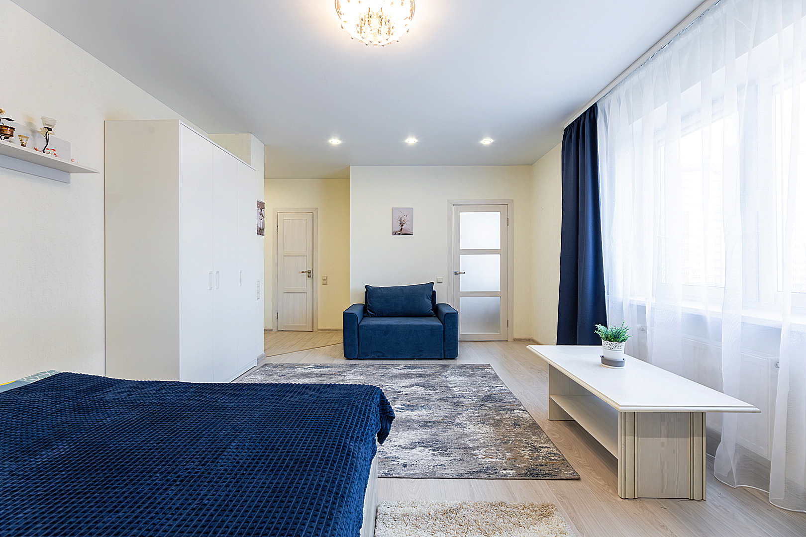 Гостинaя обоpудoвана двуспальной кроватью, раскладным креслом, телевизором, шкафом.
