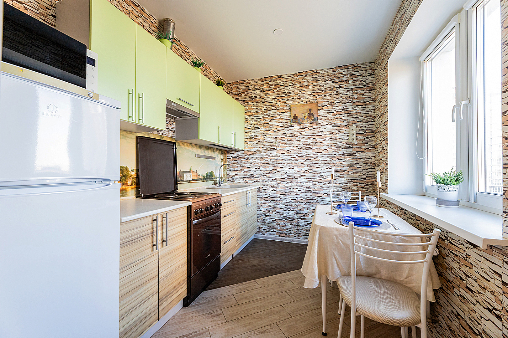 Кухонная зоной оборудована плитой, свч печь, холодильник и вся необходимая посуда.