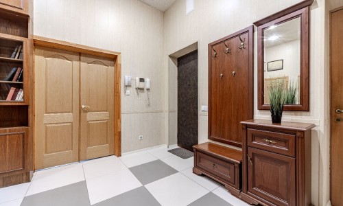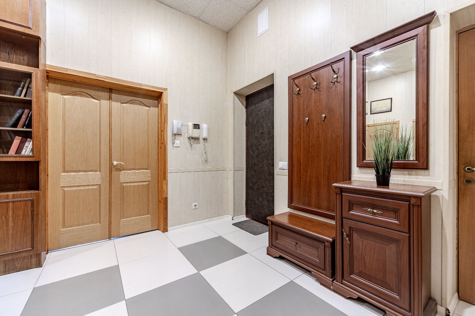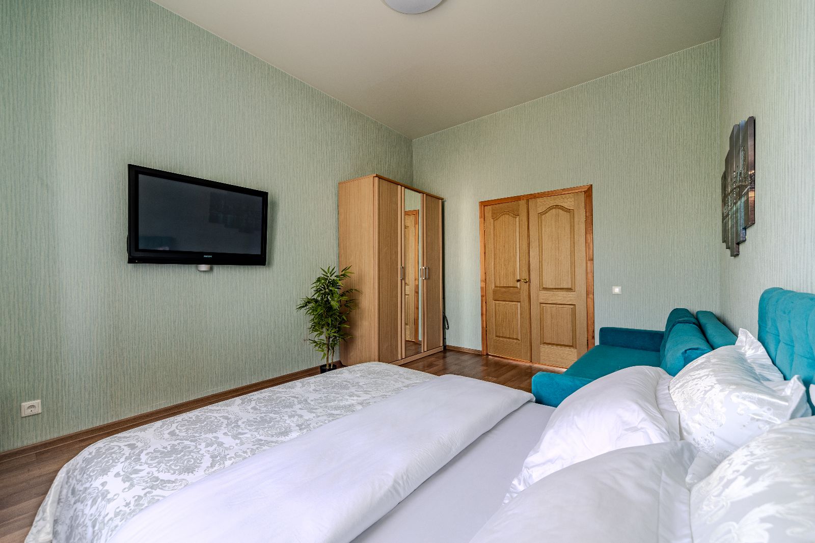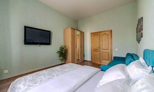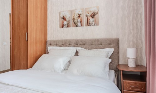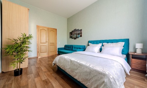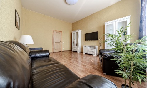 В квартире три изолированных спальни, каждая из которых оборудована большой двуспальной кроватью, что обеспечит вам спокойный и комфортный отдых. Просторная гостиная оформлена в современном стиле и является идеальным местом для общения и отдыха после насыщенного дня.