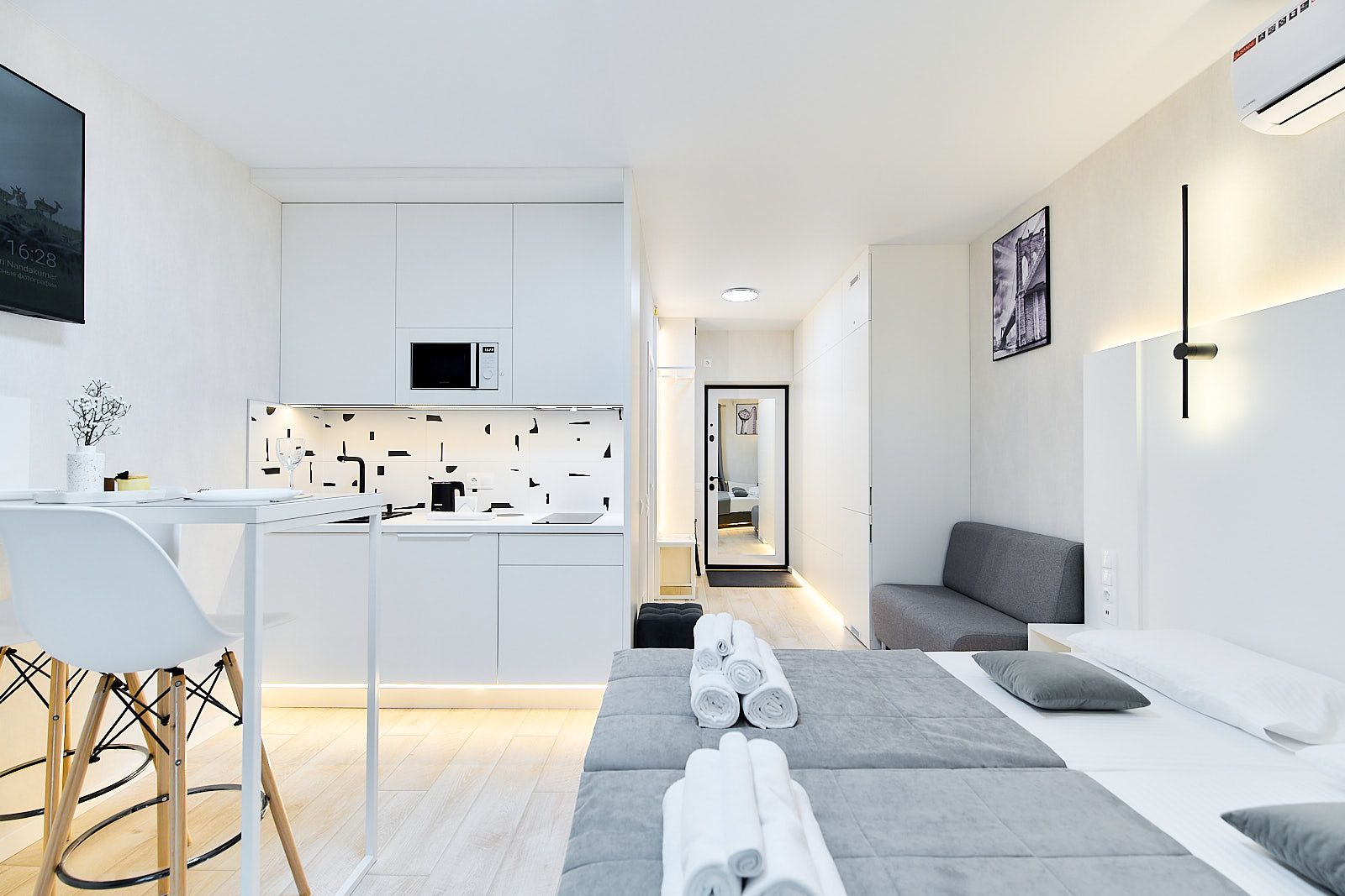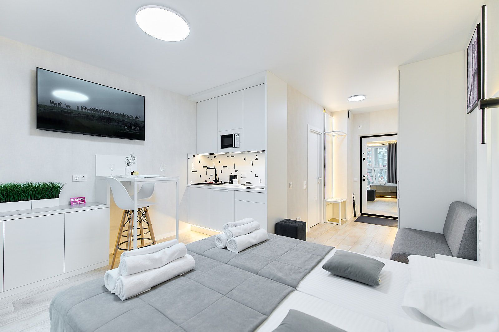 У вас будет квартира площадью 30 м2, которая готова принять ДВУХ человек и гарантировать им приятный и комфортный отдых. Здесь вы найдете все, что нужно для отличного проживания: большой телевизор с выходом в интернет и с предоплаченными подписками: яндекс плюс, кинопоиск, zala. Шторы блэкаут, фен, халаты, полотенца, тапочки. Электрочайник, необходимую столовую и кухонную посуду, большой холодильник, посудомоечную машину, микроволновую печь, утюг, гладильную доску, стиральную машину, сушилку для белья и даже гигиенические принадлежности в дозаторах.