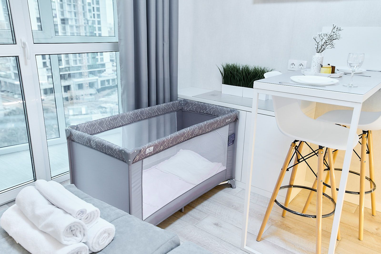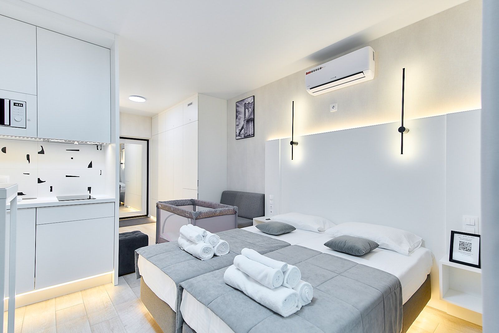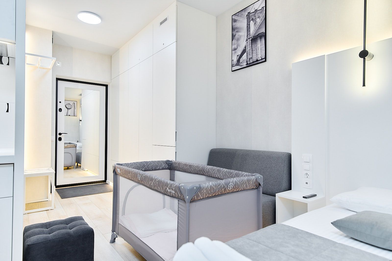 Квартира готова принять двух человек, а также предоставить дополнительную детскую кроватку-манеж для маленьких гостей.