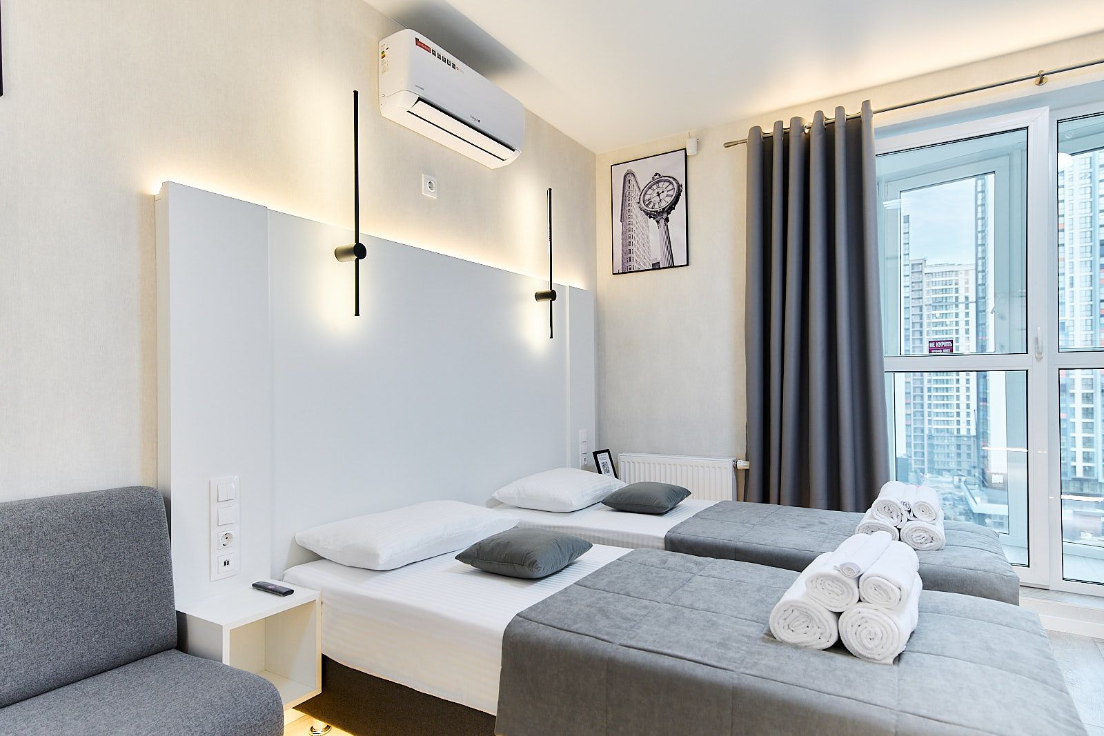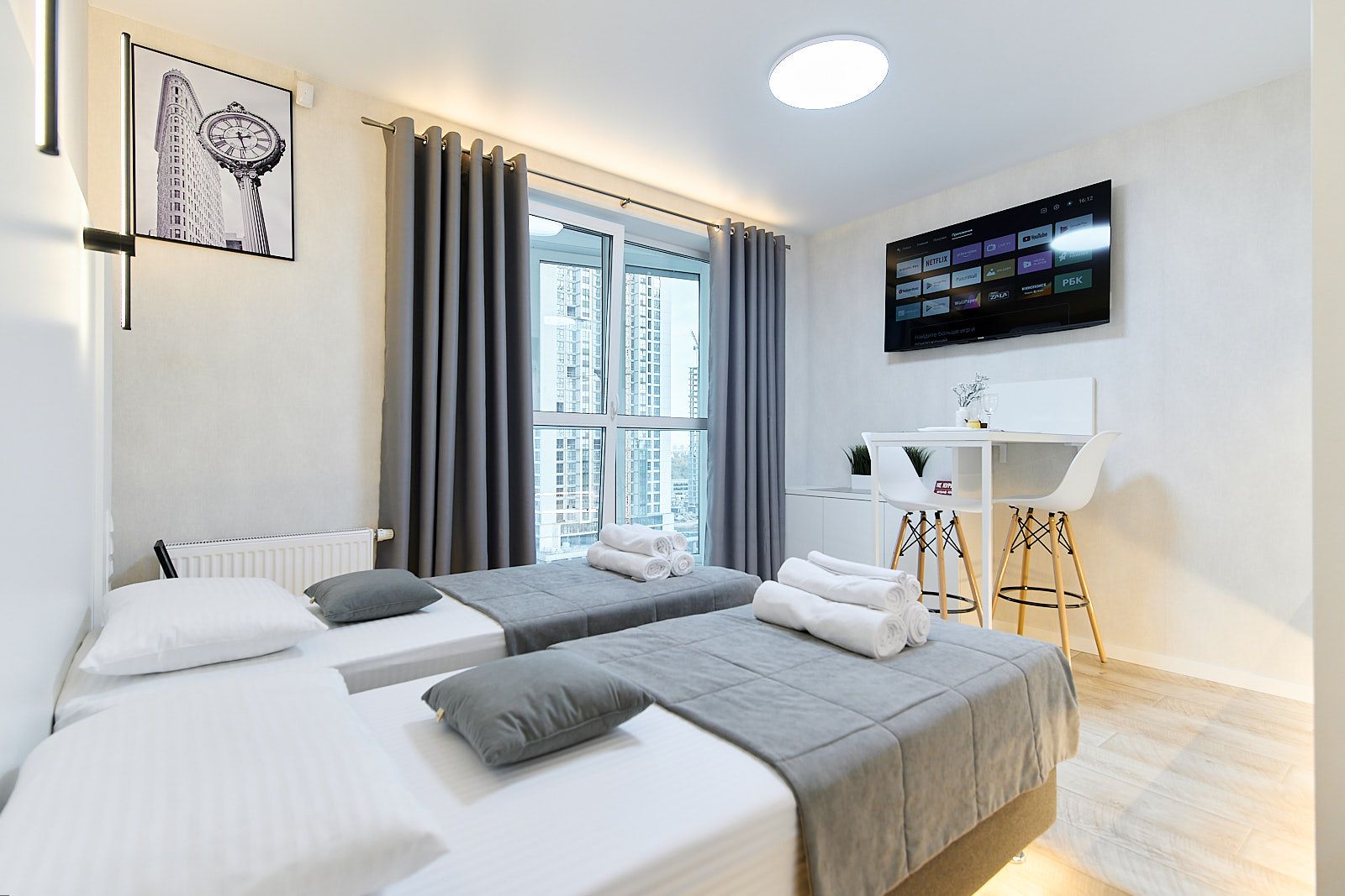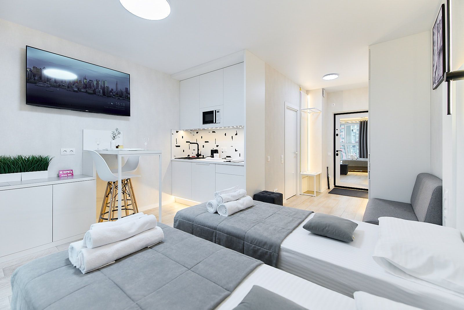 Кровати могут стоять как вместе, так и раздельно. Квартира рассчитана для проживания двух человек. Дом новый, поэтому хотелось бы предупредить о возможных звуках ремонта, иногда исходящих от соседей, но только в будние дни по белорусскому календарю и в рабочее время. Квартира находится в районе Минск-Мир – это самая современная часть столицы Беларуси. Перед каждым заселением гостей в квартире проводится обработка помещений ультрафиолетовым излучением с помощью бактерицидной лампы.