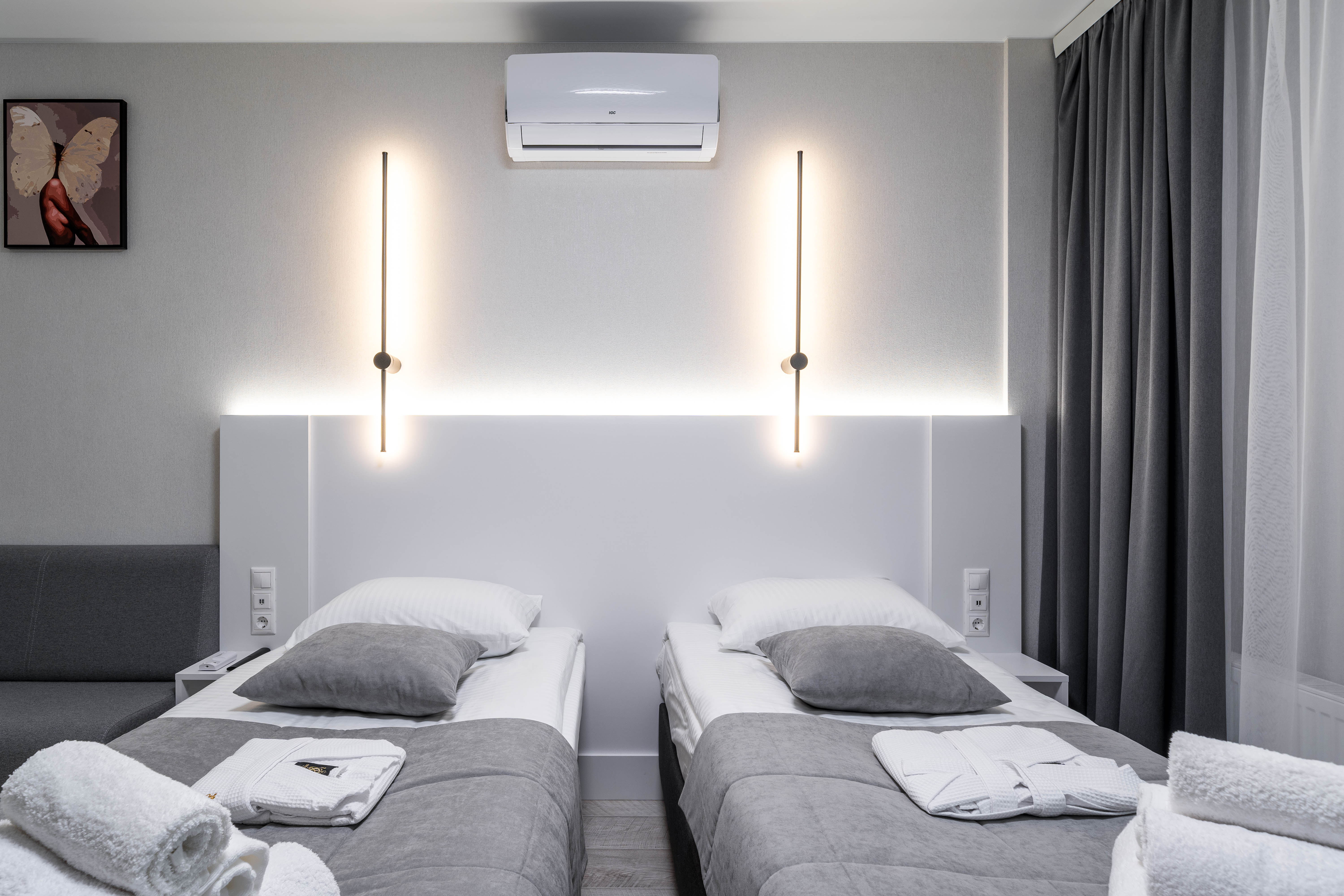 Кровати могут стоять как вместе, так и раздельно. Квартира рассчитана для проживания двух человек, но по необходимости может быть организовано дополнительное полноценное спальное место и для взрослого человека. Об этом просим уведомить заблаговременно. Дом новый, поэтому хотелось бы предупредить о возможных звуках ремонта, иногда исходящих от соседей, но только в будние дни по белорусскому календарю и в рабочее время. В квартире есть просторная лоджия, на которой так же не разрешается курить.