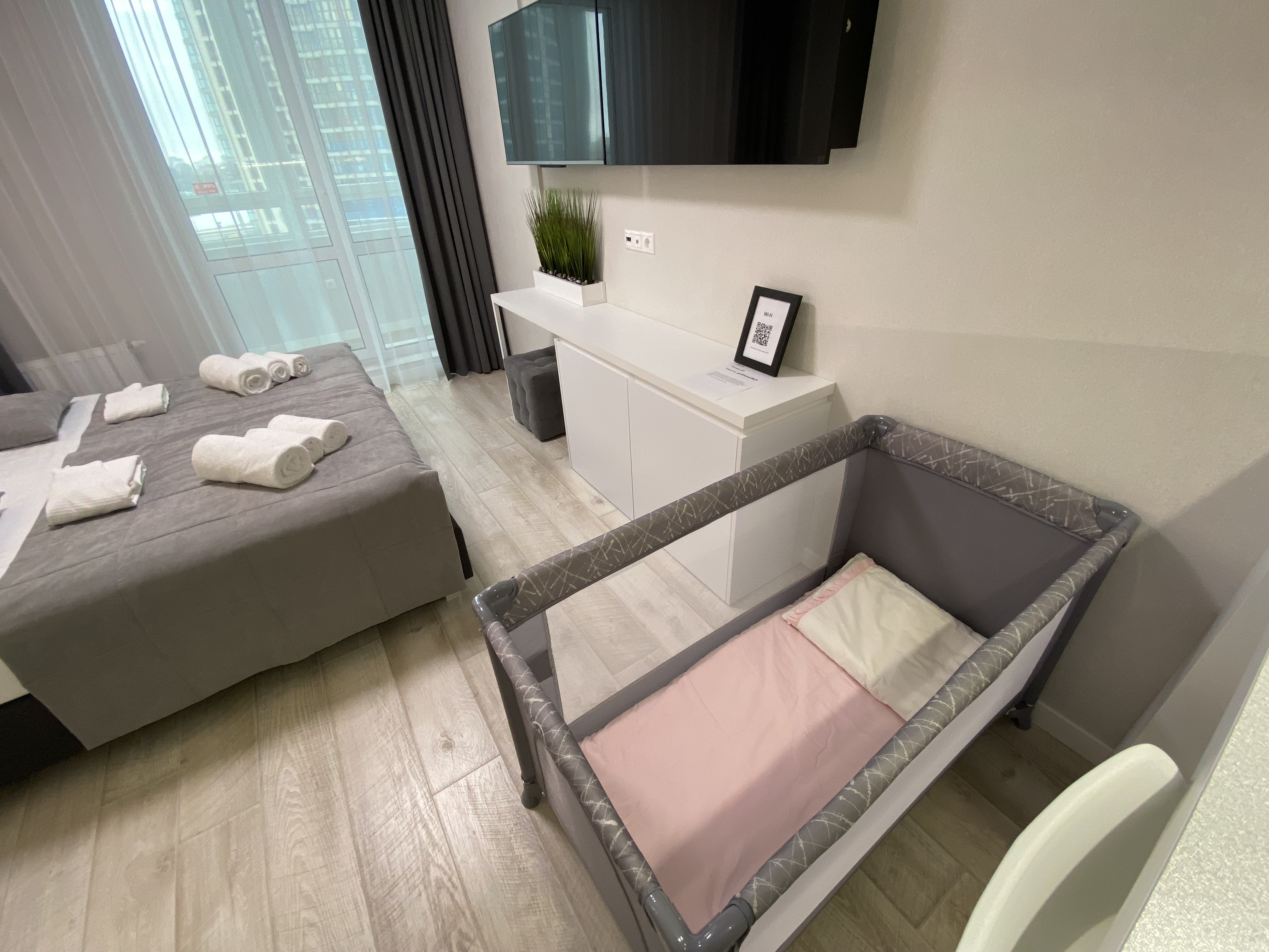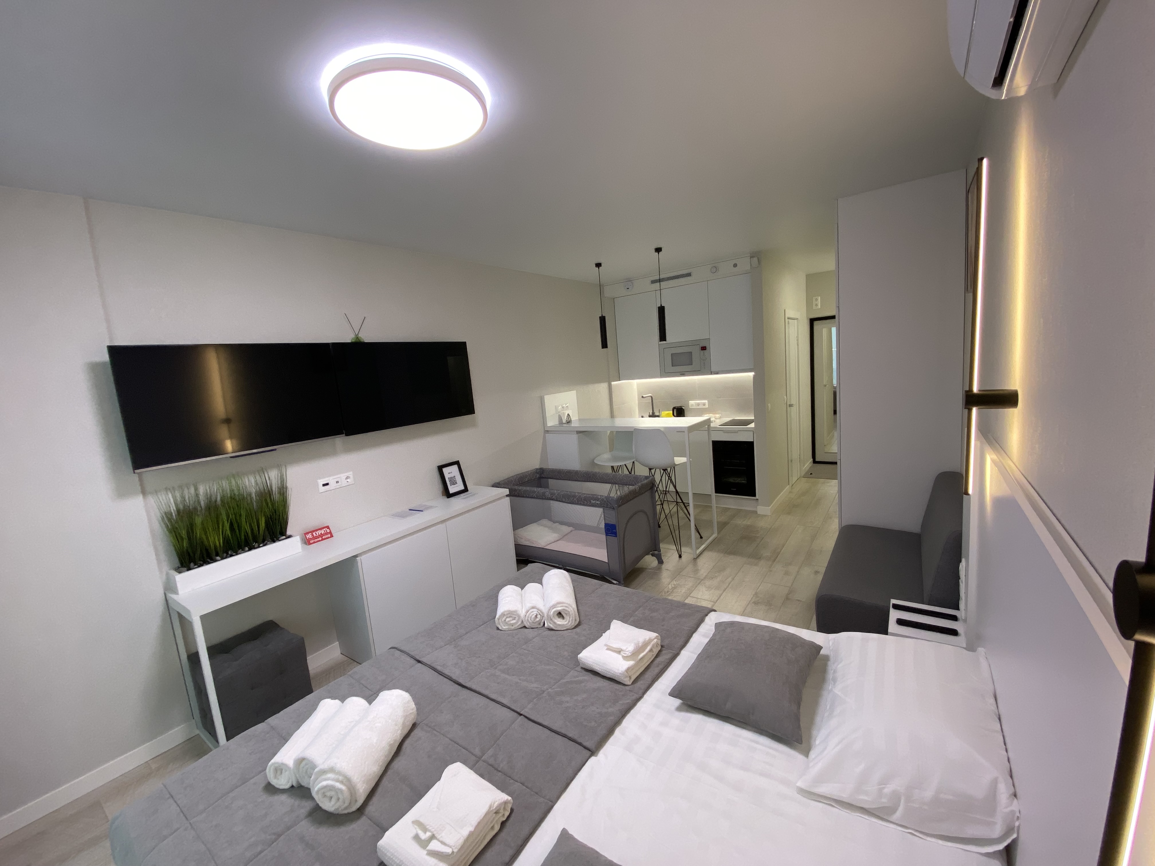 Квартира готова принять двух человек, а также предоставить дополнительную детскую кроватку-манеж для маленьких гостей.