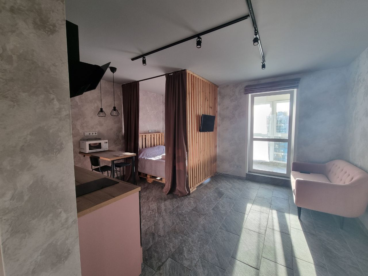 Стильная квартира-студия для двоих. Бесконтактное заселение! Есть все необходимое для кратковременного проживания и вашего комфорта. WIFI, смарт ТВ, фен, утюг, гладильная доска, свч-печь, электрочайник + кофе/чай, стиральная машина, духовой шкаф, электрическая плита, столовые приборы и посуда. В шаговой доступности магазины и кафе.