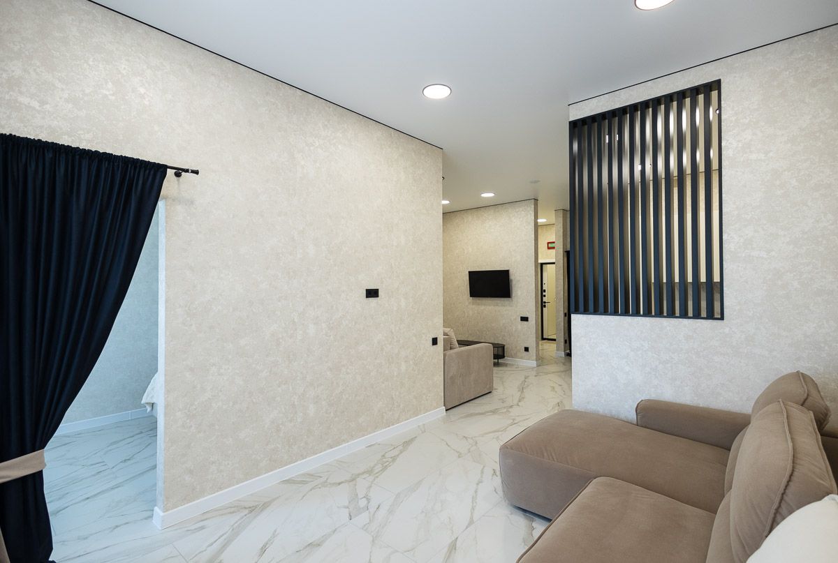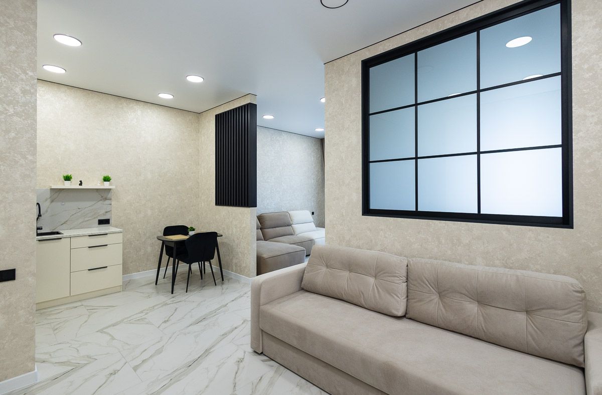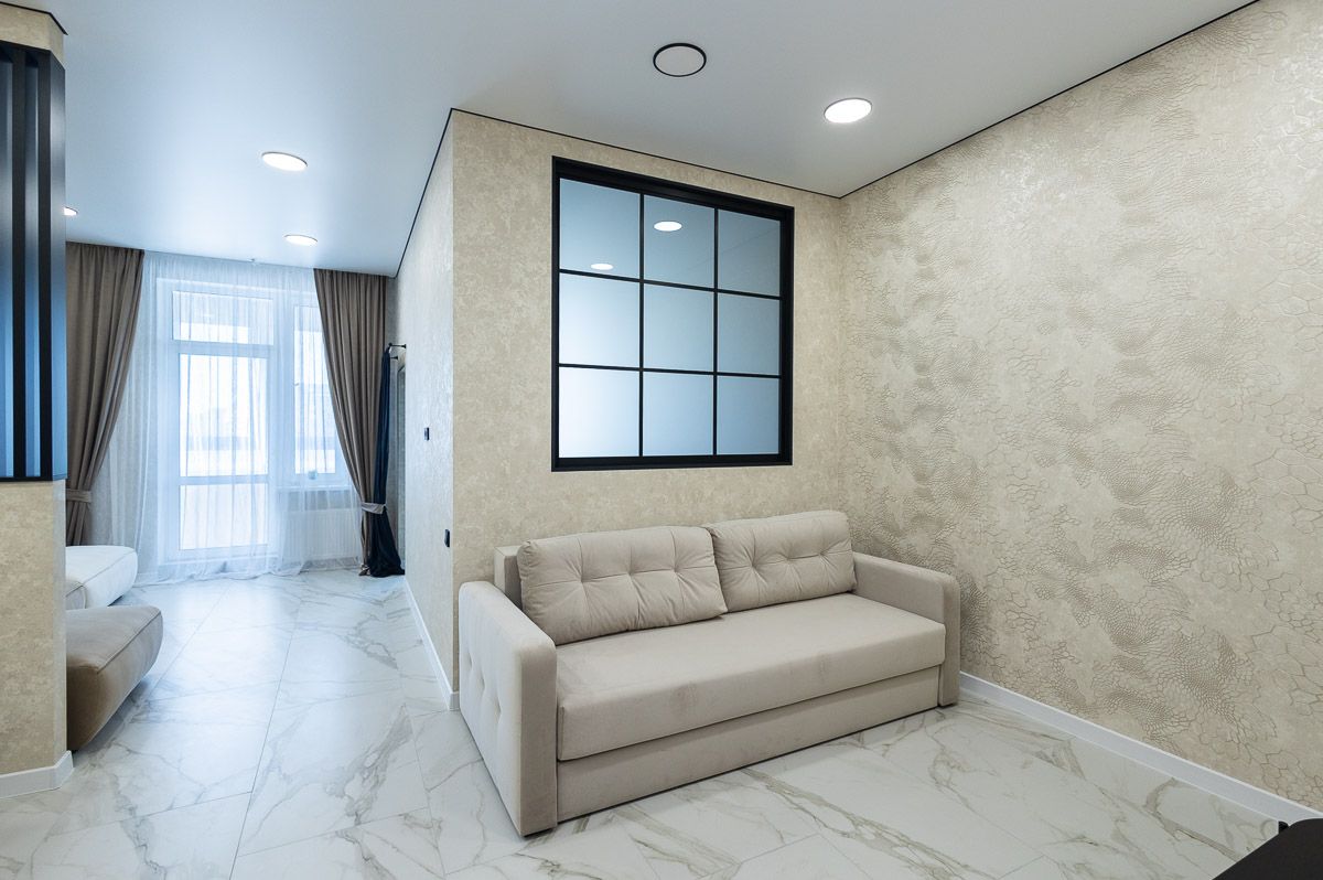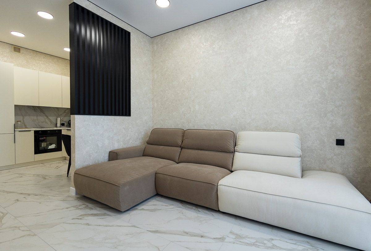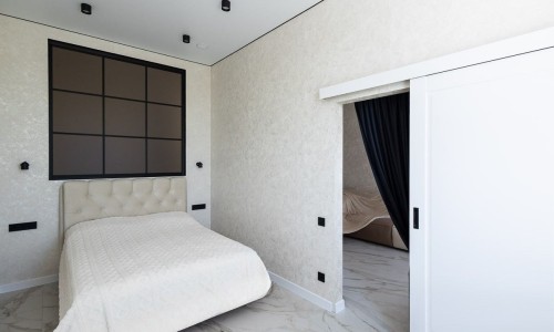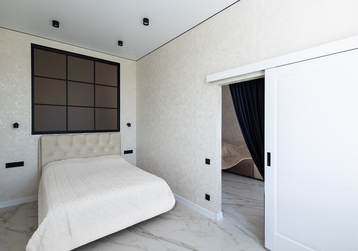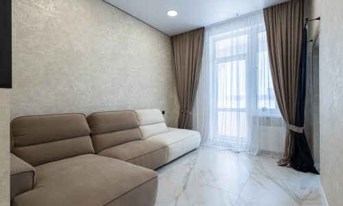 Комфортная спальня с двуспальной кроватью и гостиная с зоной отдыха