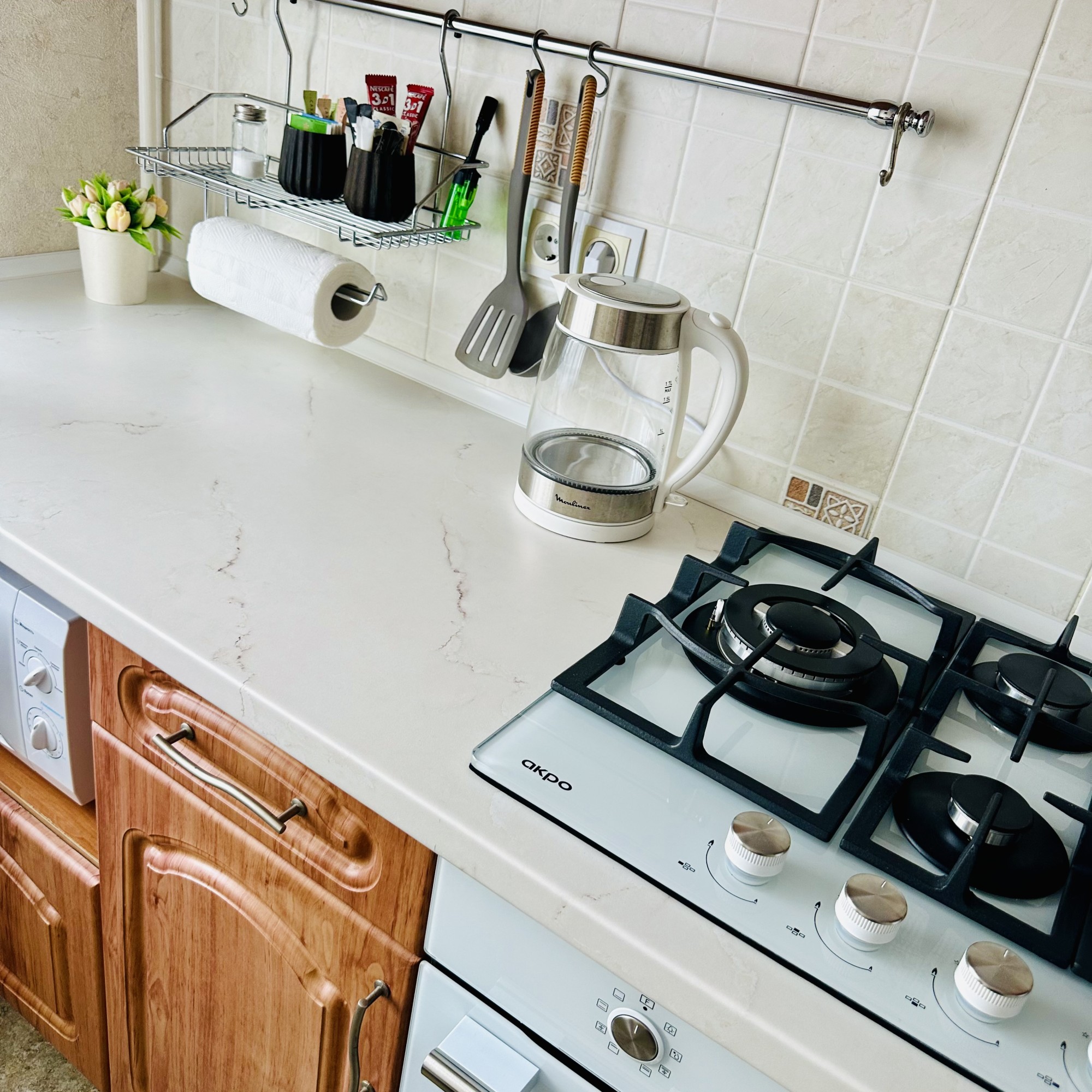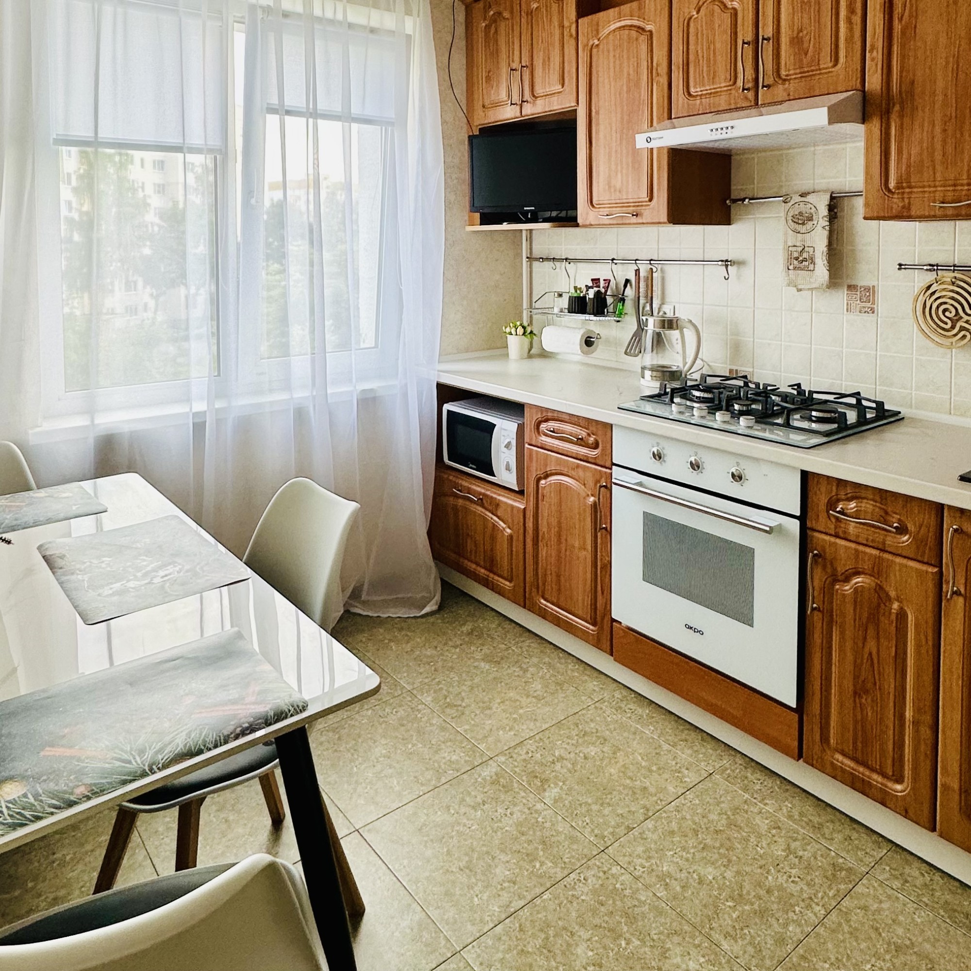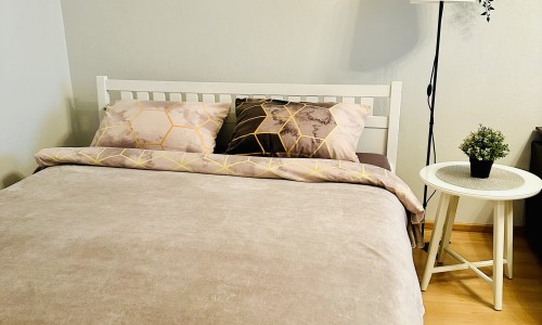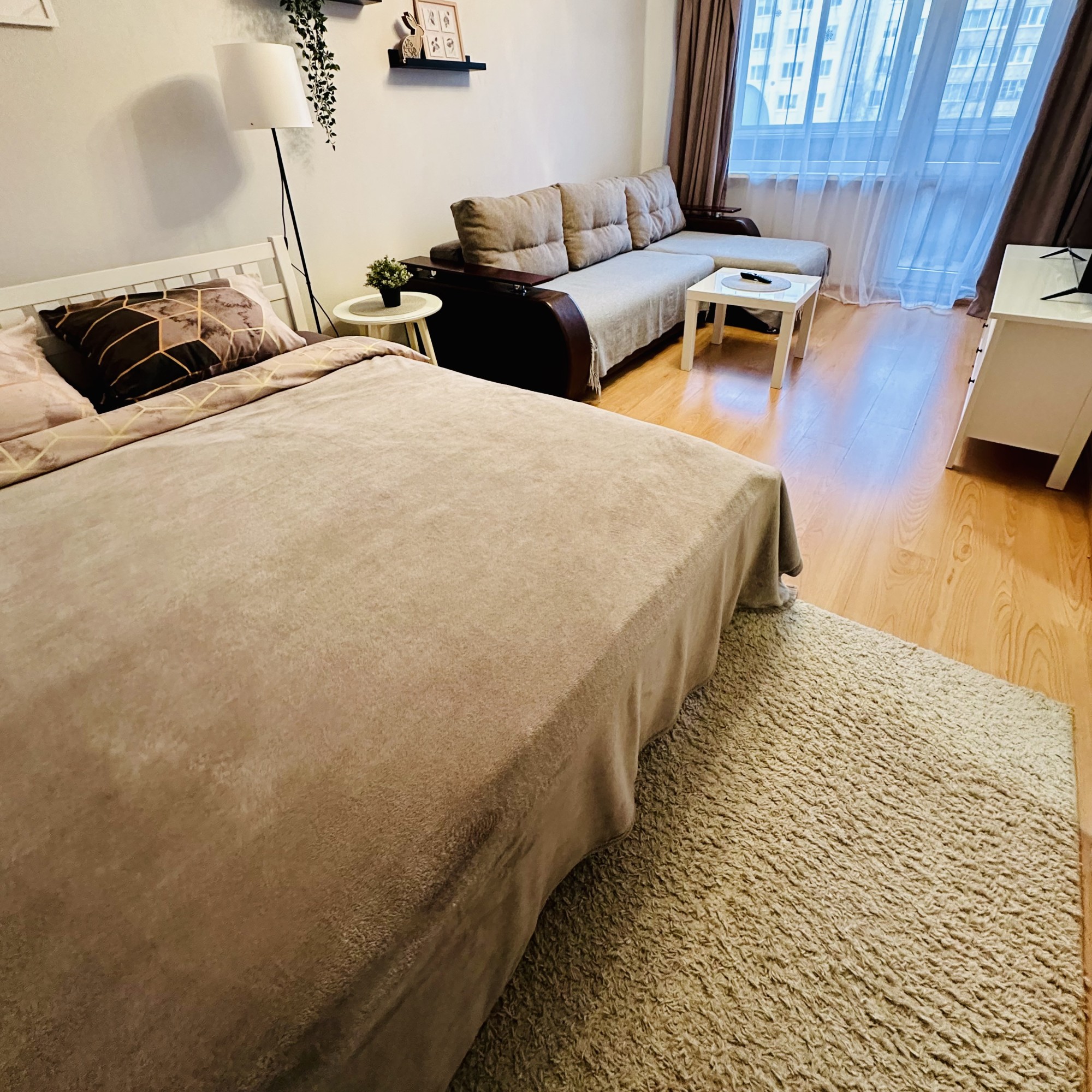 Есть все необходимое для проживания ( постельное , полотенца,мыло,фен, шампунь, гель душ, глад доска, утюг,чай , кофе .