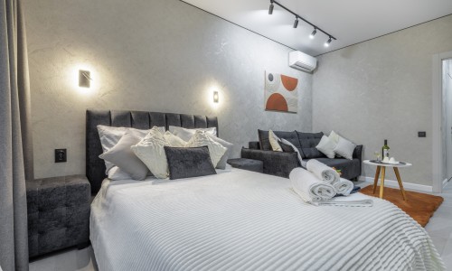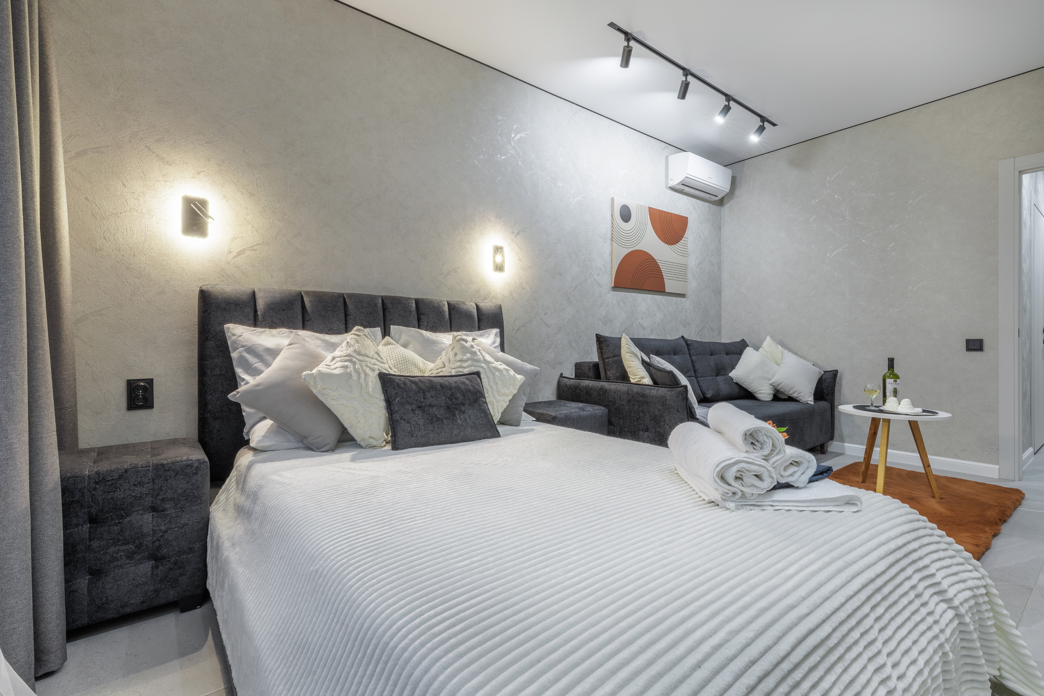 Имеется две двухспальные кровати, вместительный диван и кресло -кровать. Летом не будет жарко-установлен кондиционер. Современная кухня оборудована всей необходимой техникой, включая посудомоечную и кофемашину. Имеется парковочное место в подземном паркинге. Стоимость за проживание будет зависеть от времени и количества проживающих)