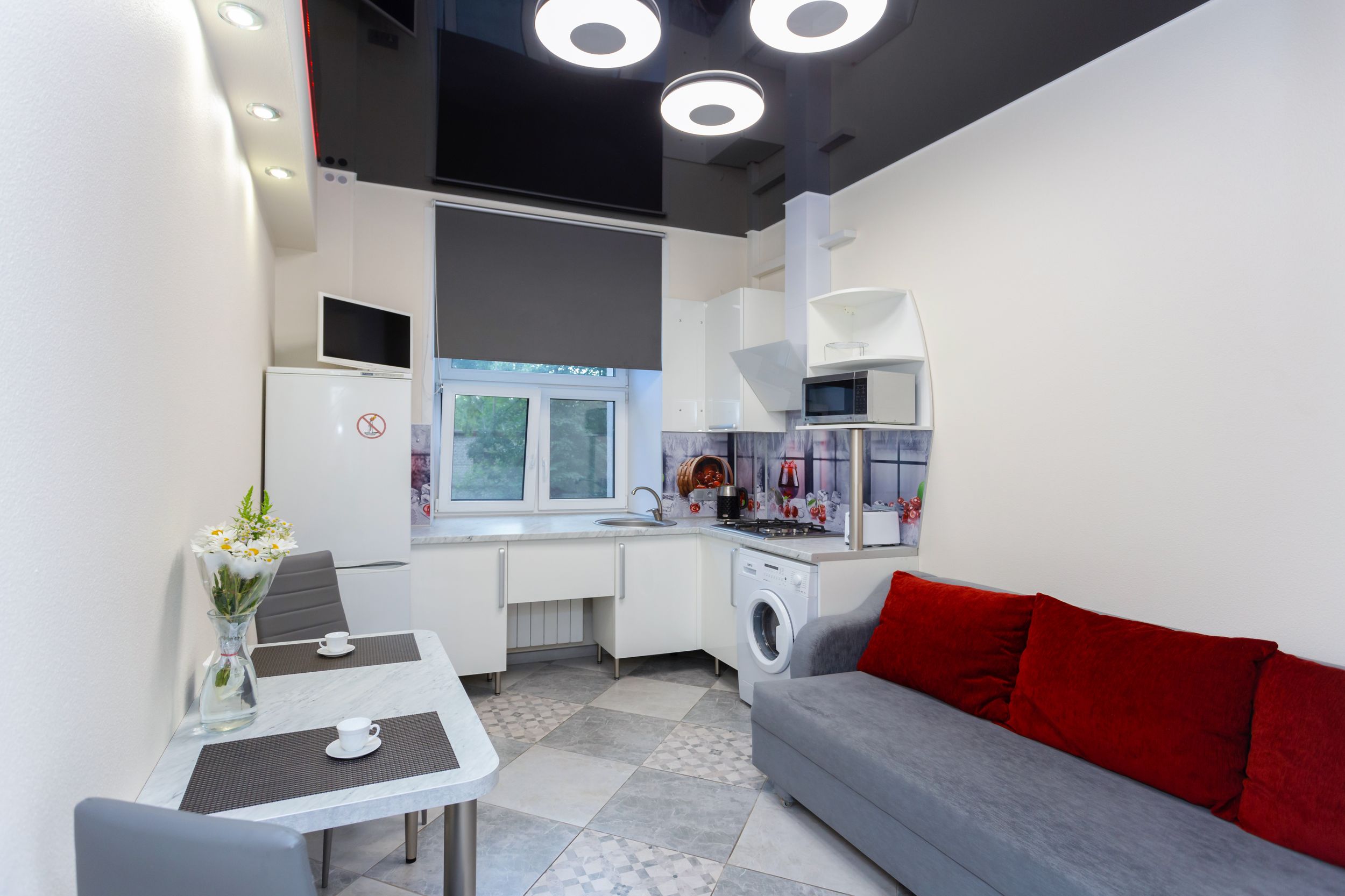 Оборудованная гостиная-кухня-столовая. ЖКИ SMART TV. Диван-трансформер QWIN SIZE 160x200.