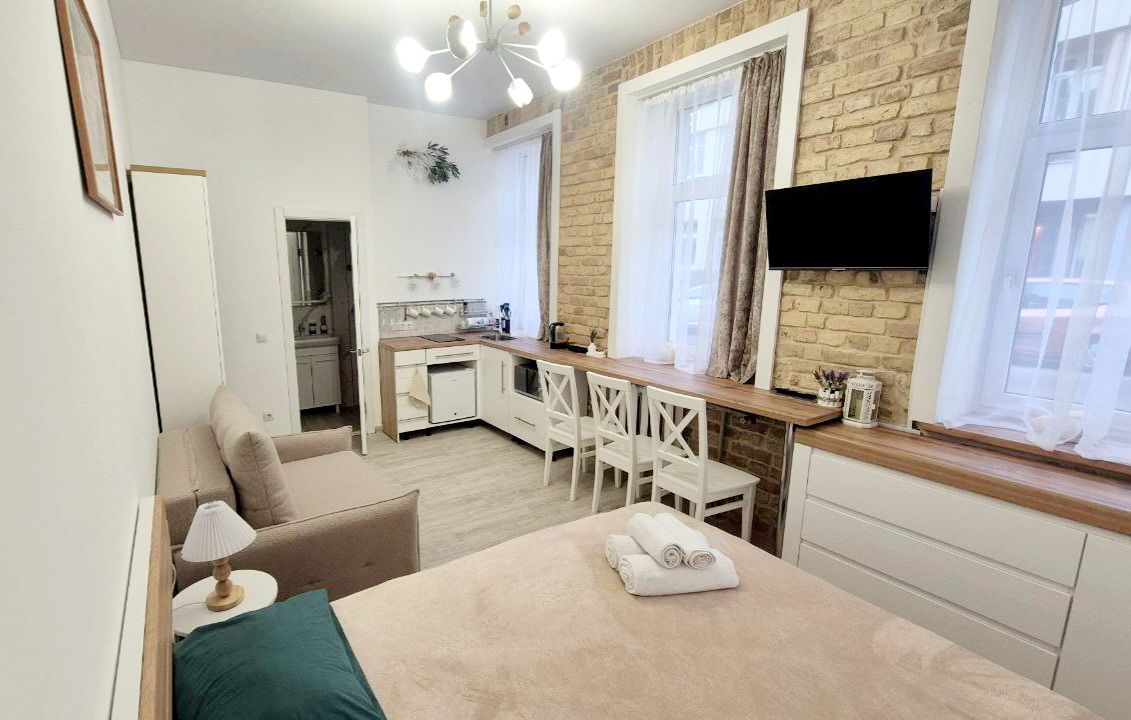 Большая двуспальная кровать, ортопедический матрас, мягкие подушки и самое лучшее постельное белье из варёного хлопка , которые доставят вам истинное удовольствие и прекрасный сон. В номере есть диван на два дополнительных спальных места. Световые зоны создают уют и прекрасную атмосферу в номере. Кухонная зона оснащена всем необходимым оборудованием (холодильник, электроплита, микроволновка) и необходимой посудой для приготовления самых лучших завтраков. В номере имеется утюг,фен и стиральная машинка. Благодаря кондиционеру у нас всегда комфортная температура.
