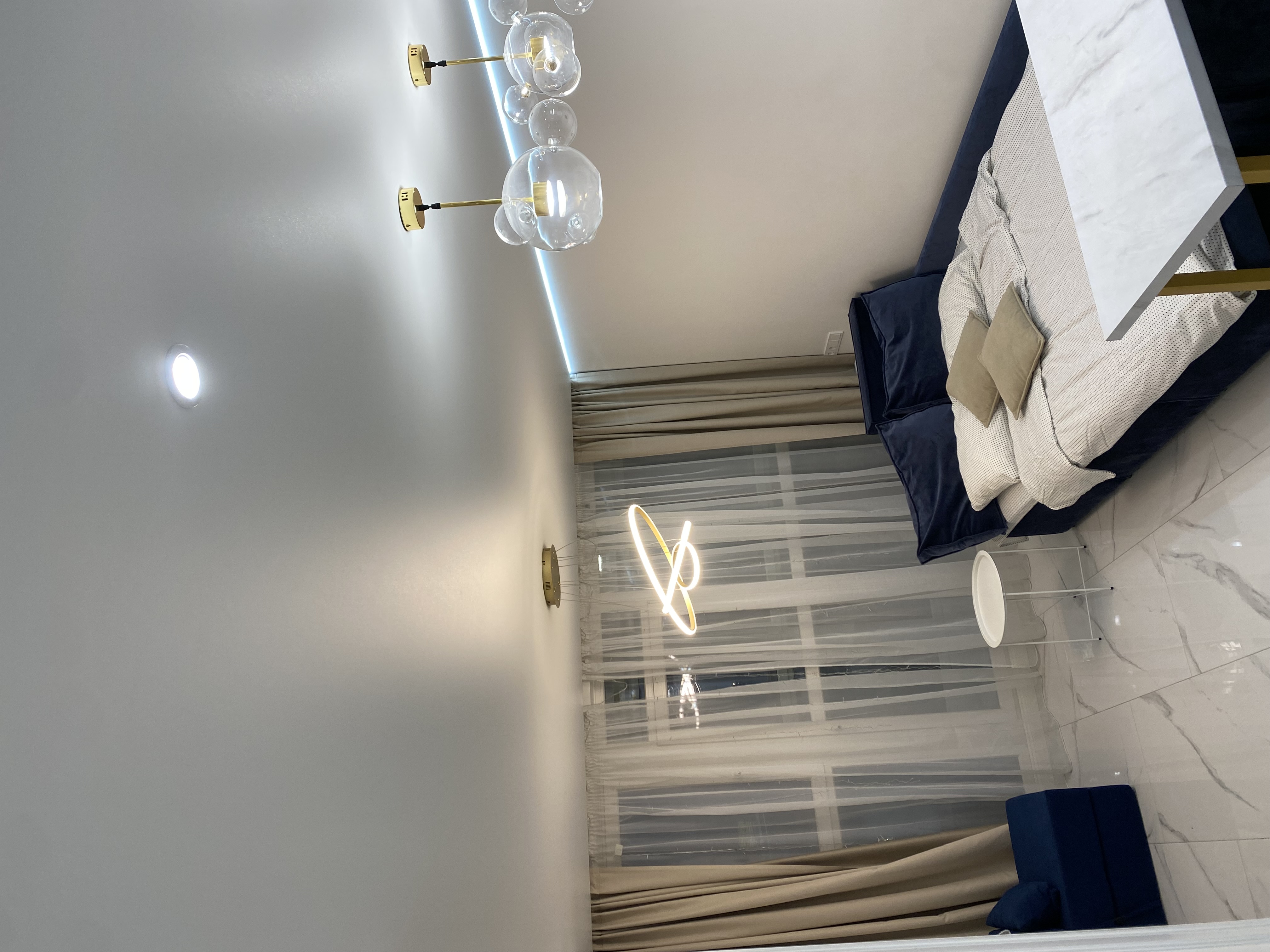 Есть всё необходимое для комфортного проживания двух человек. Электро шторы, камин, телевизор Смарт ТВ 55 дюймов, интернет, халатов 2, тапочки 2, полотенца:2 больших, 2 маленьких, 1 под ноги
