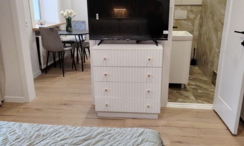 - **Гостиная-кухня**: Просторное помещение с окнами, наполняющими пространство естественным светом. Современная кухня оборудована встроенной техникой (варочная панель, холодильник, посудомоечная машина), фасады выполнены в матовых тонах, столешница — из кварцевого агломерата. В зоне гостиной — удобная кровать, кресло раскладное.