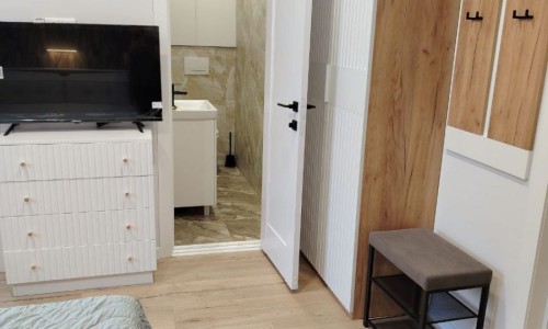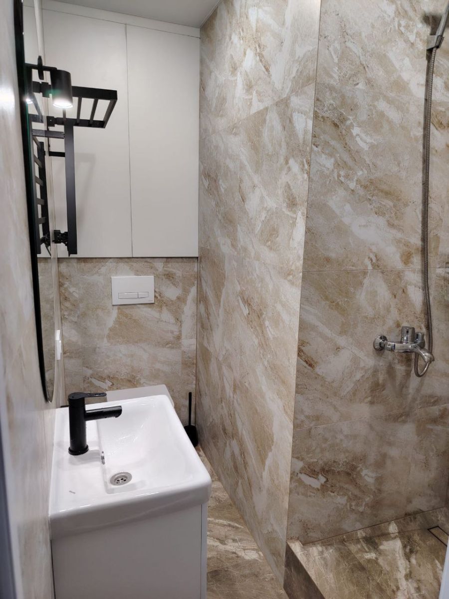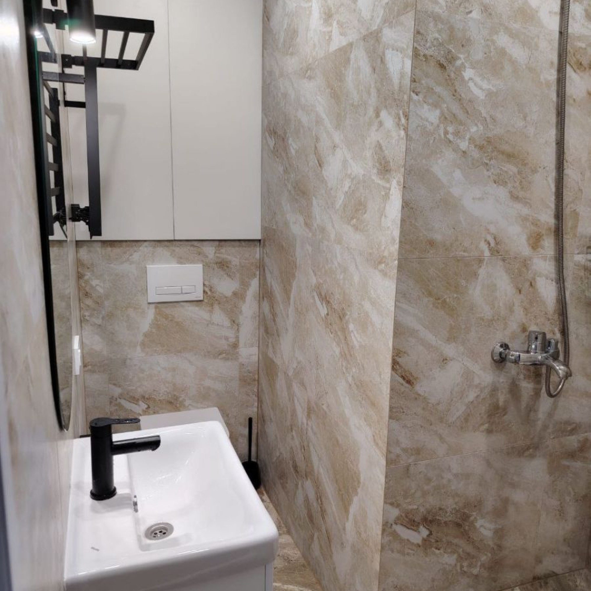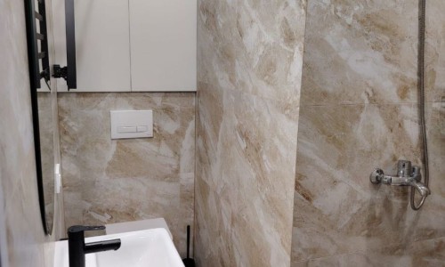 - **Санузел**: Совмещенный, с керамогранитной плиткой, подвесной сантехникой, с тропическим душем и встроенным зеркальным шкафчиком.