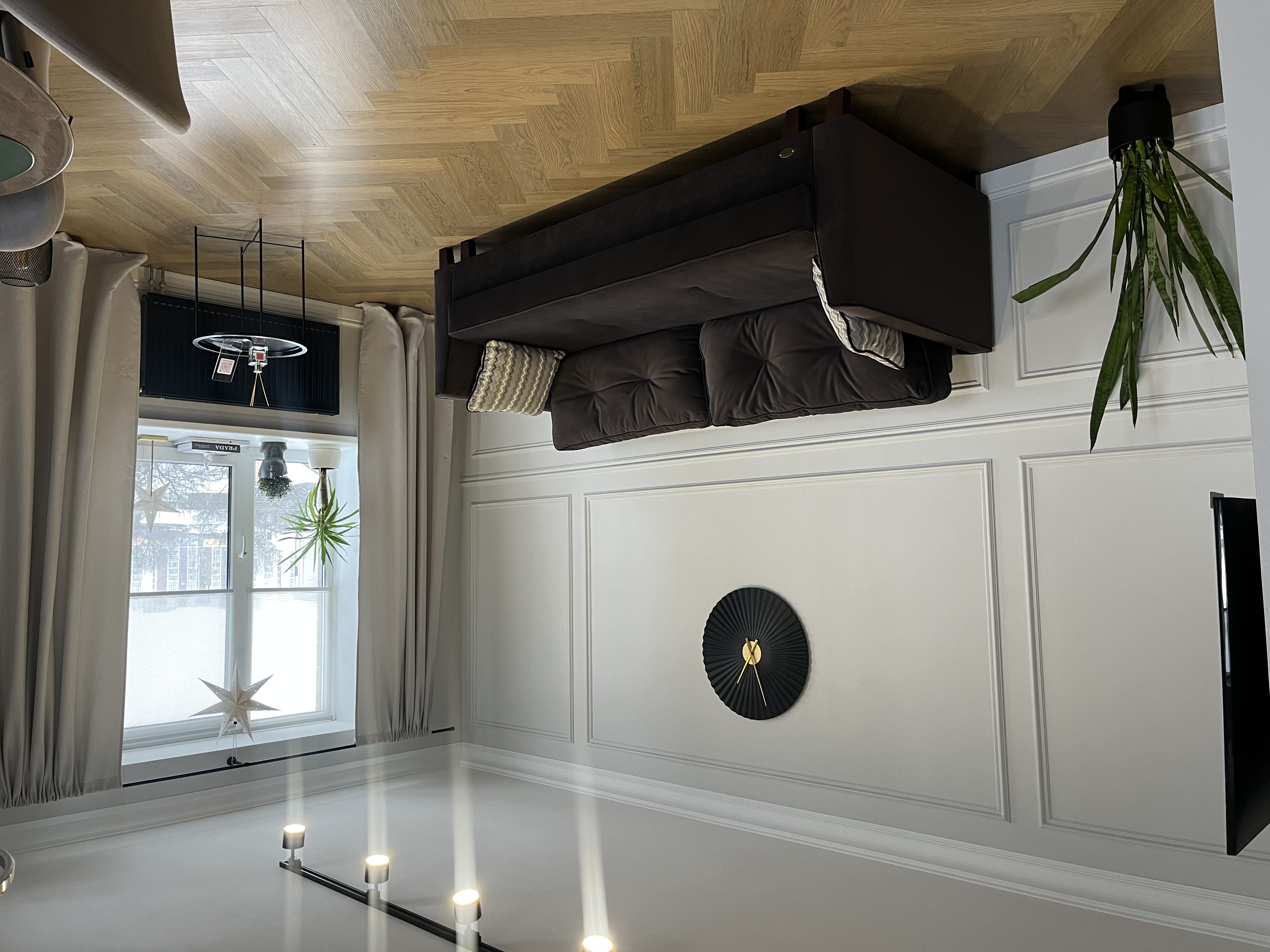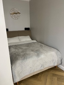 Основное спальное место с индивидуально изготовленной двух спальной кроватью расположено уютно в нише квартиры со светильниками с без проводной зарядкой для телефона , дополнительное двуспальное место может быть организовано на диване-тахте. В апартаментах оборудована уютная лоджия с прекрасным видом на центральную часть города.