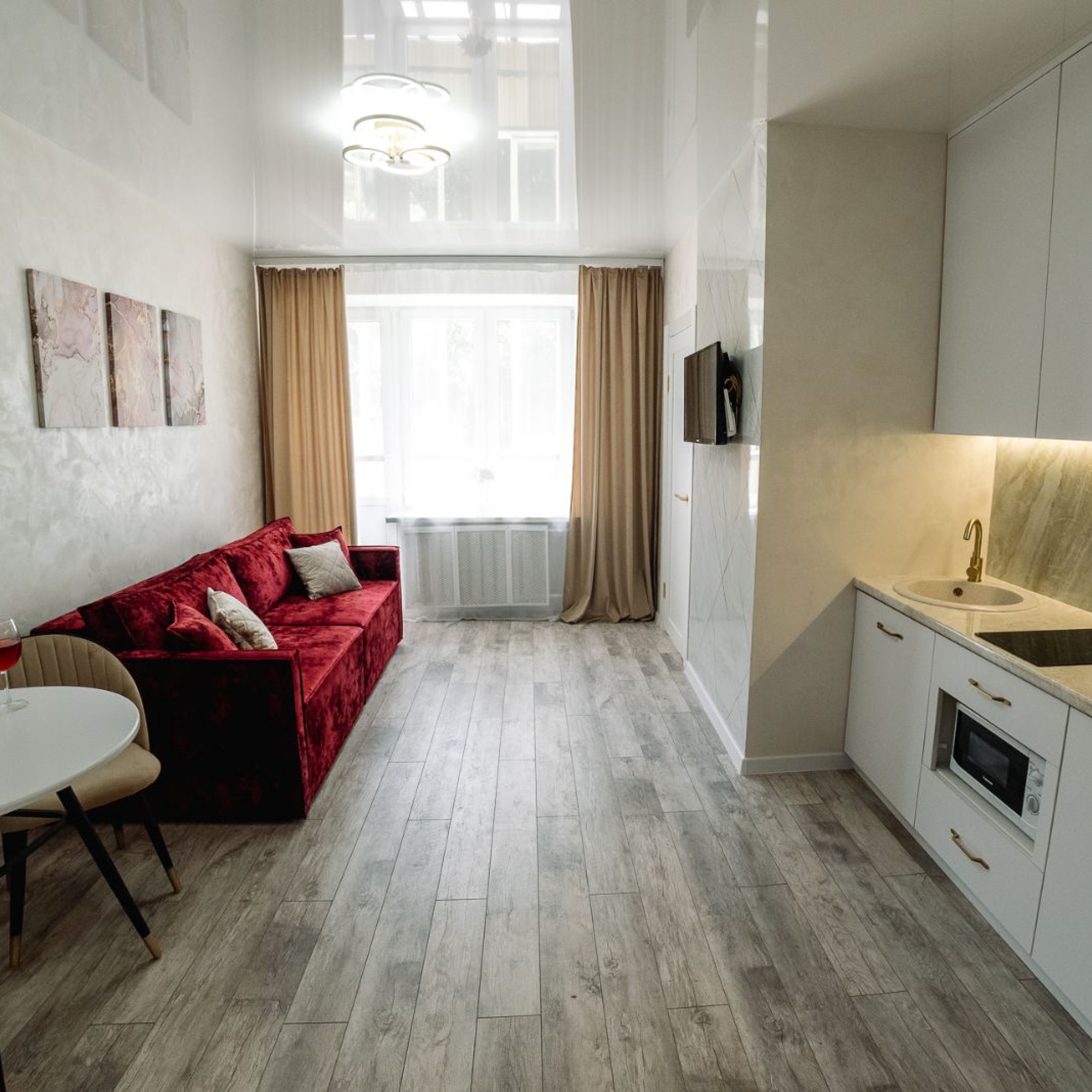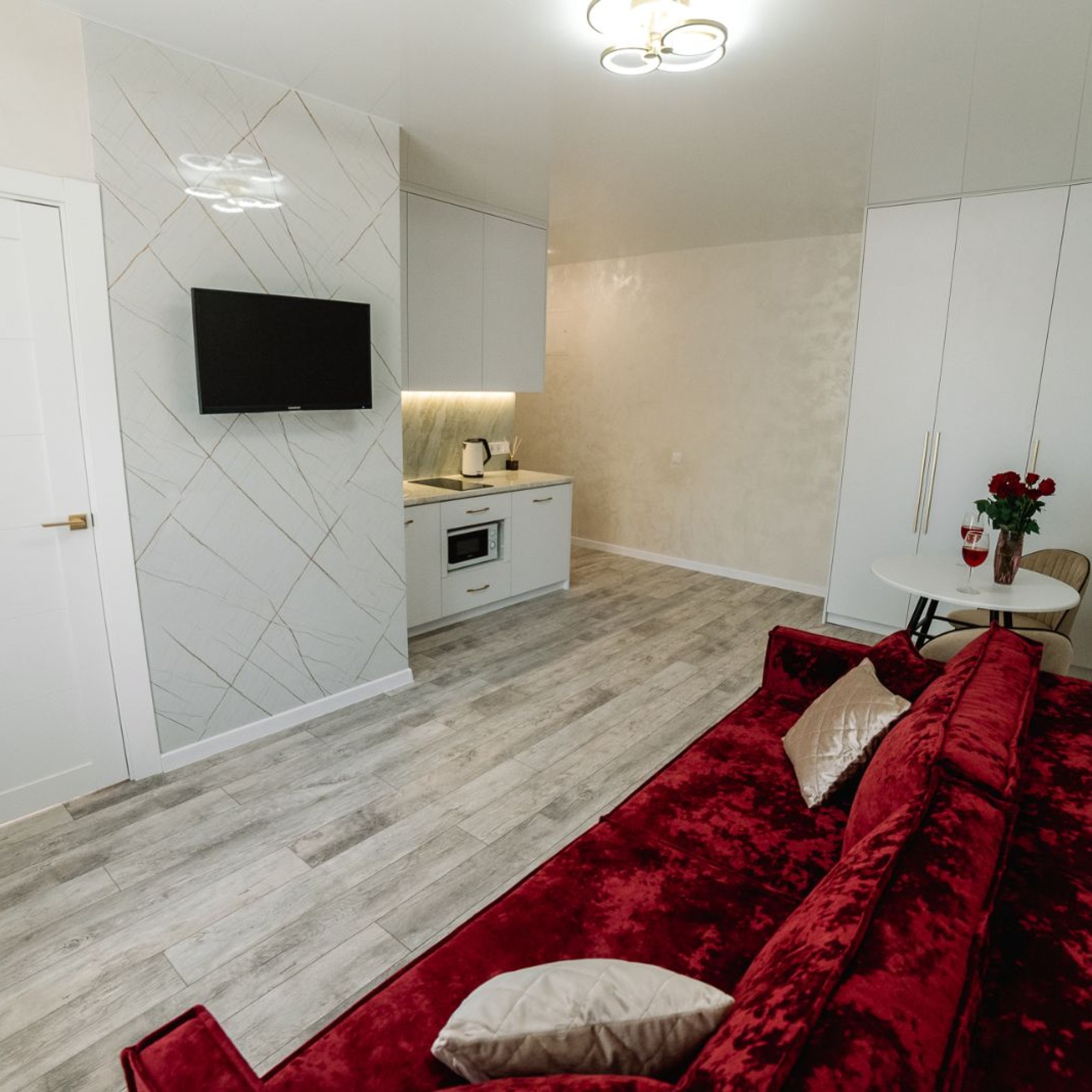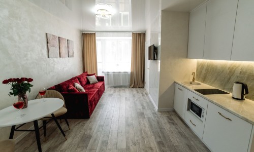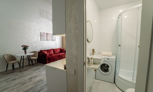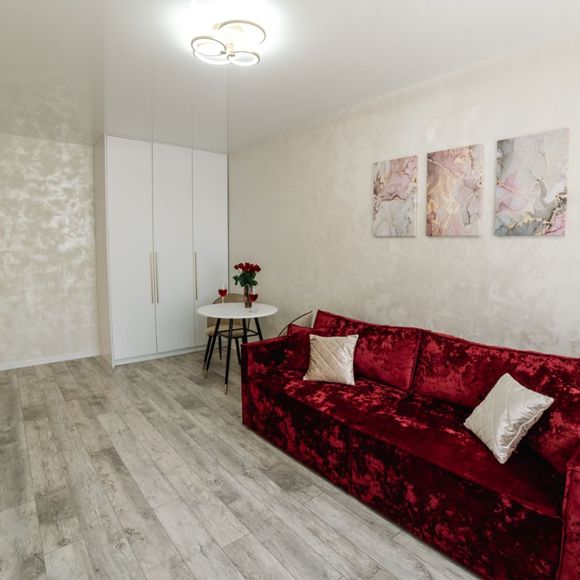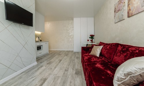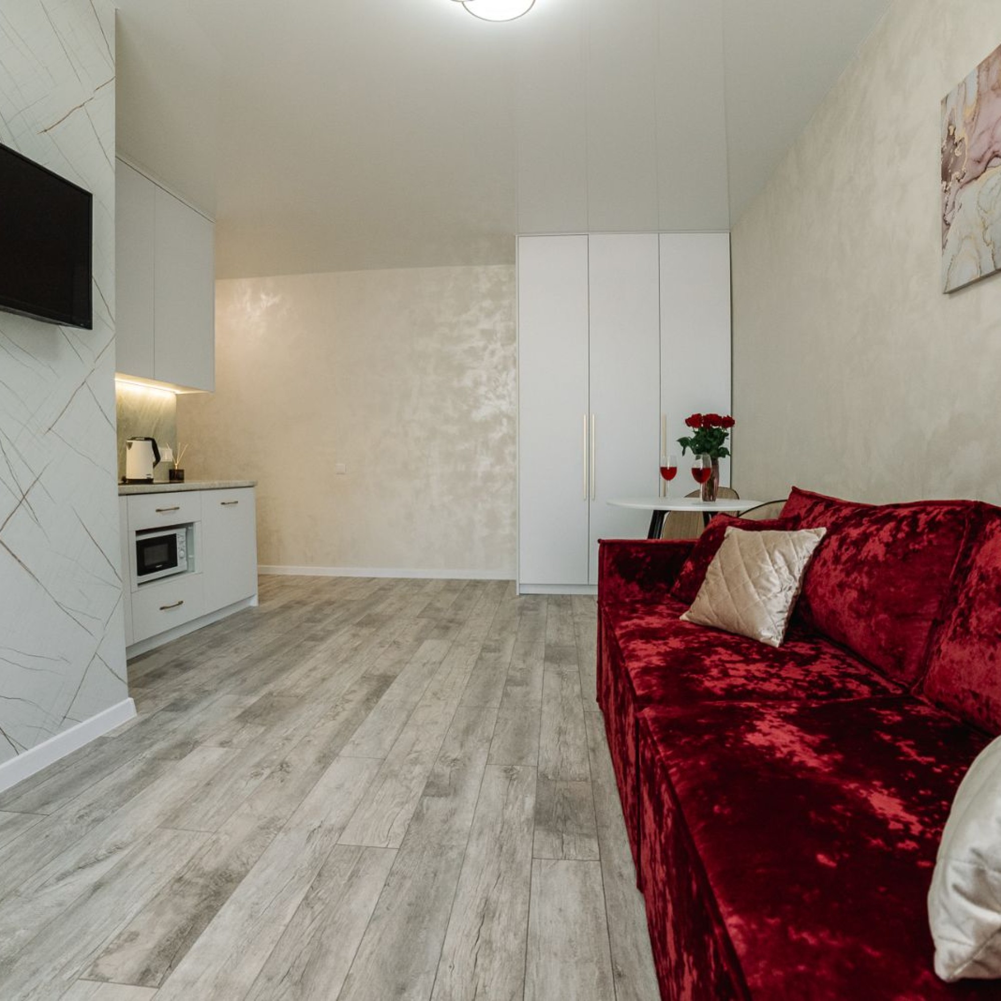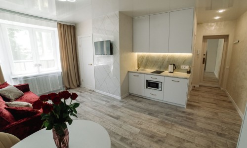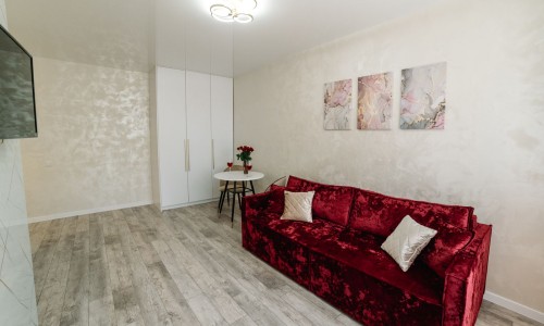 Квартира состоит из гостиной, совмещенной с кухонной зоной, небольшой изолированной спальни, совмещенного санузла.