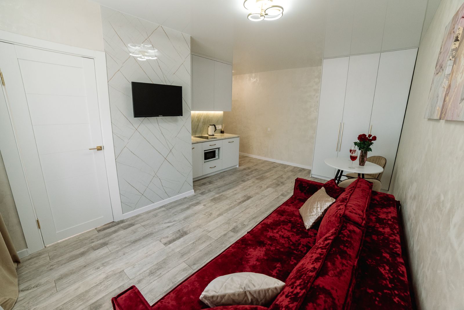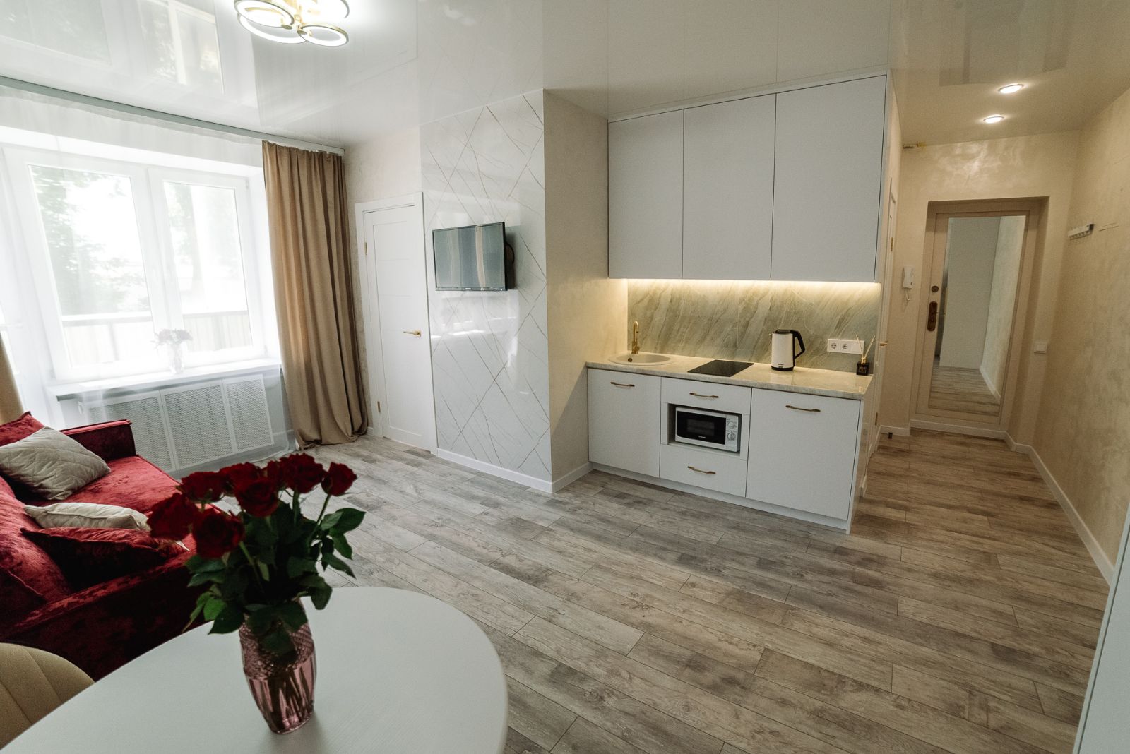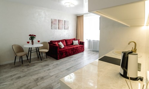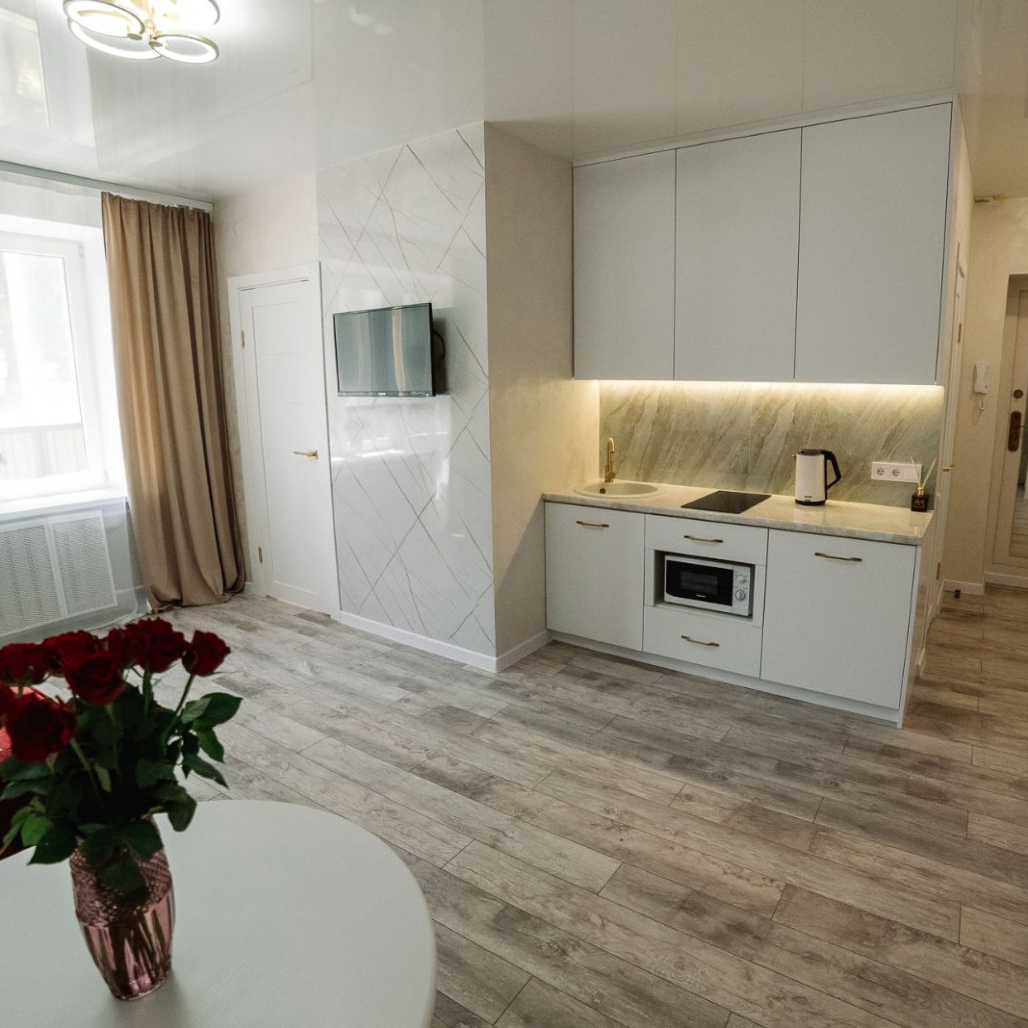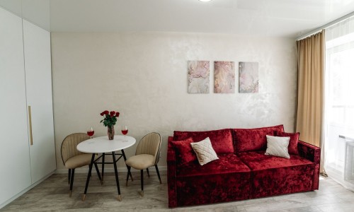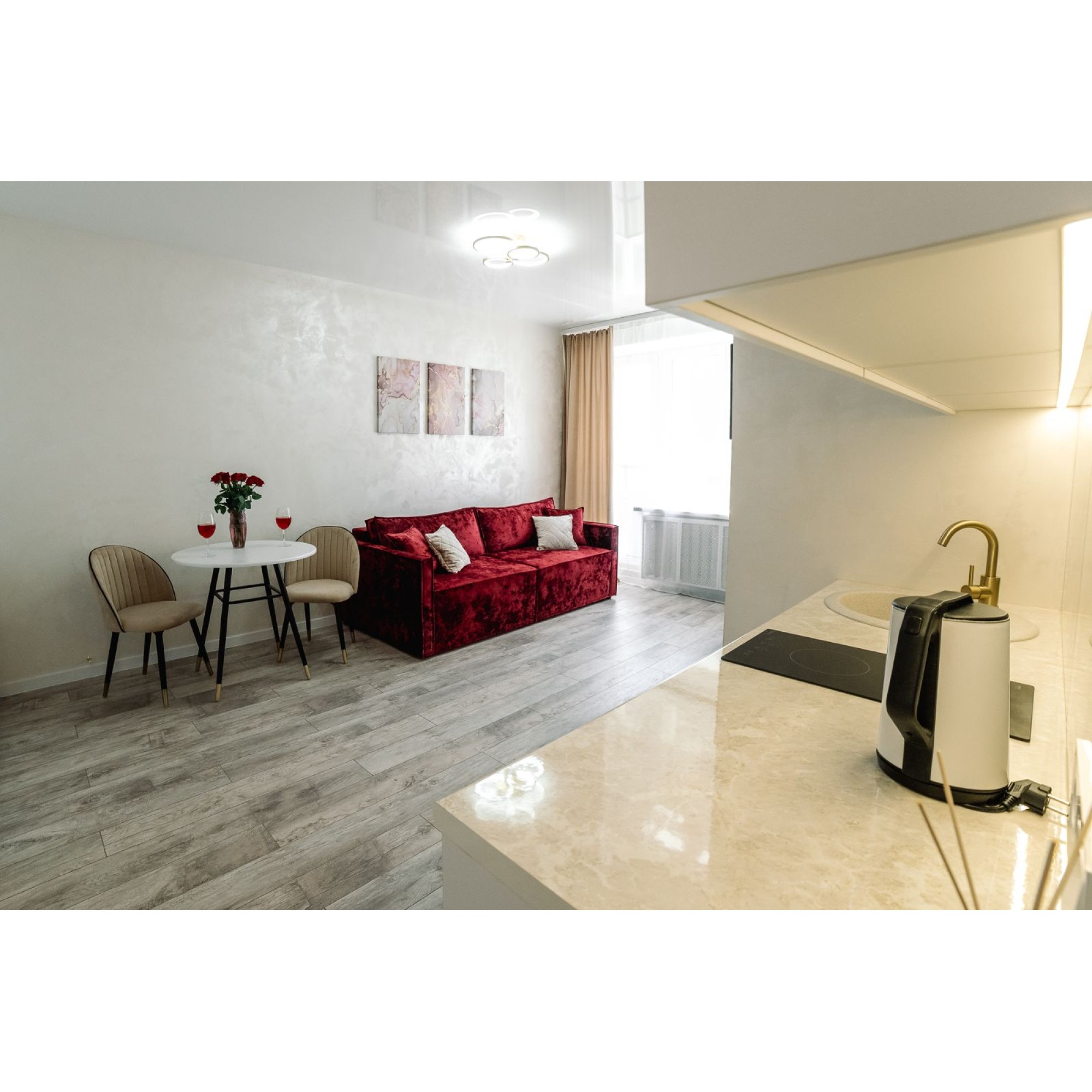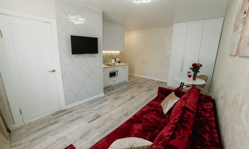 Квартира состоит из гостиной, совмещенной с кухонной зоной, небольшой изолированной спальни, совмещенного санузла.