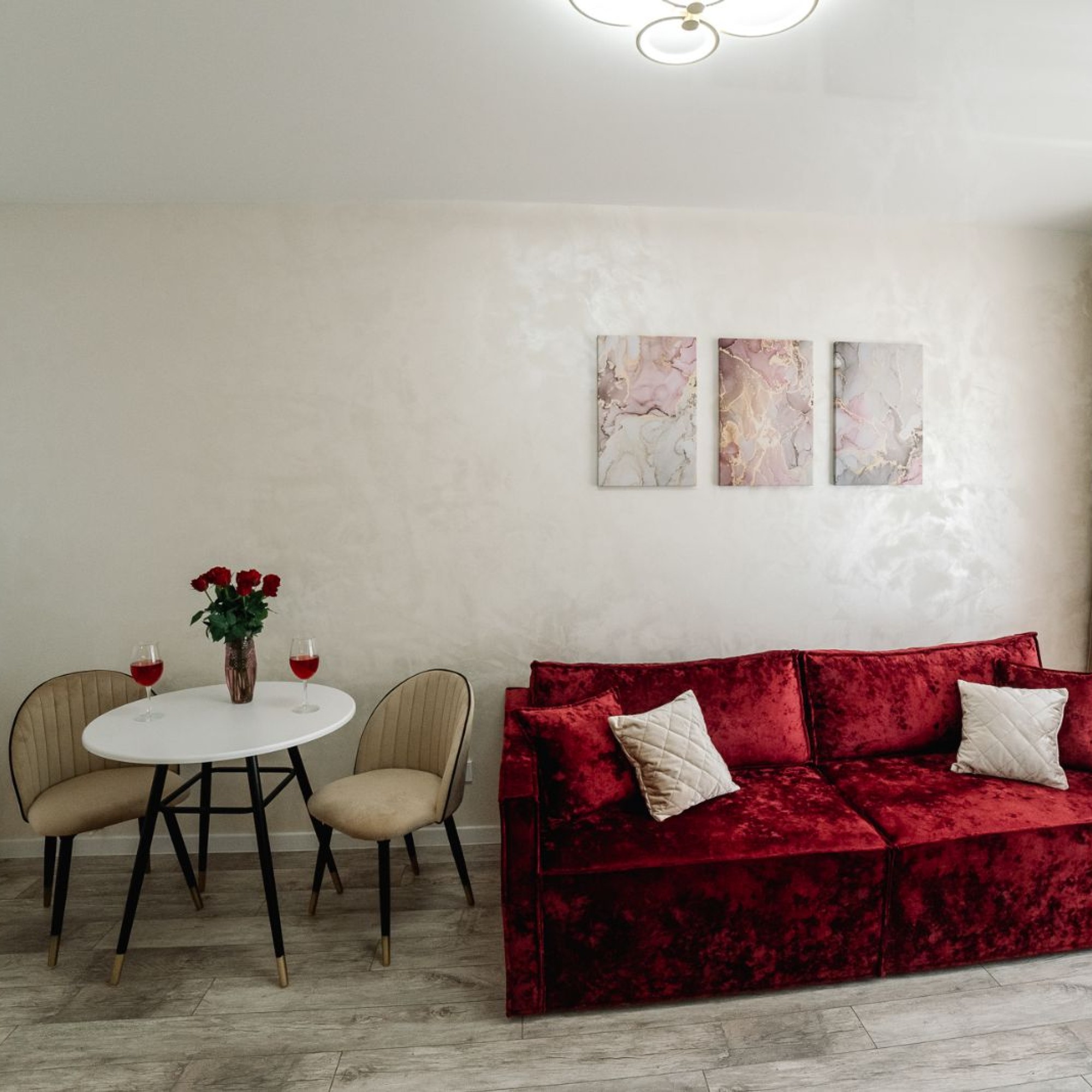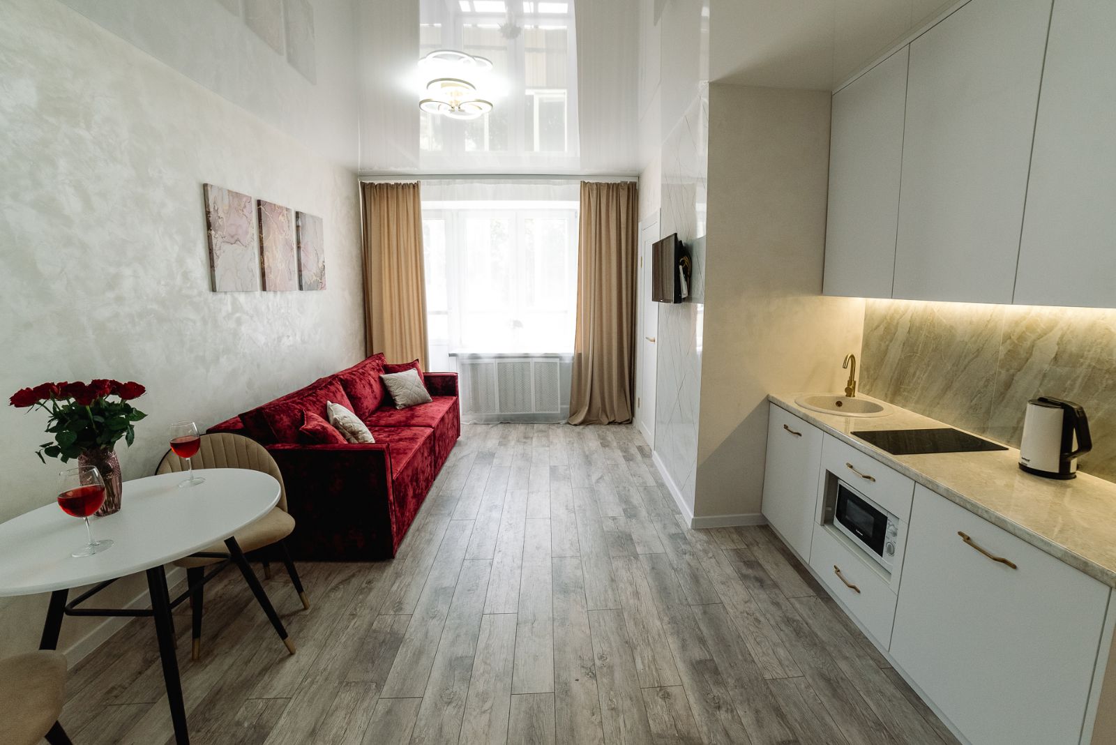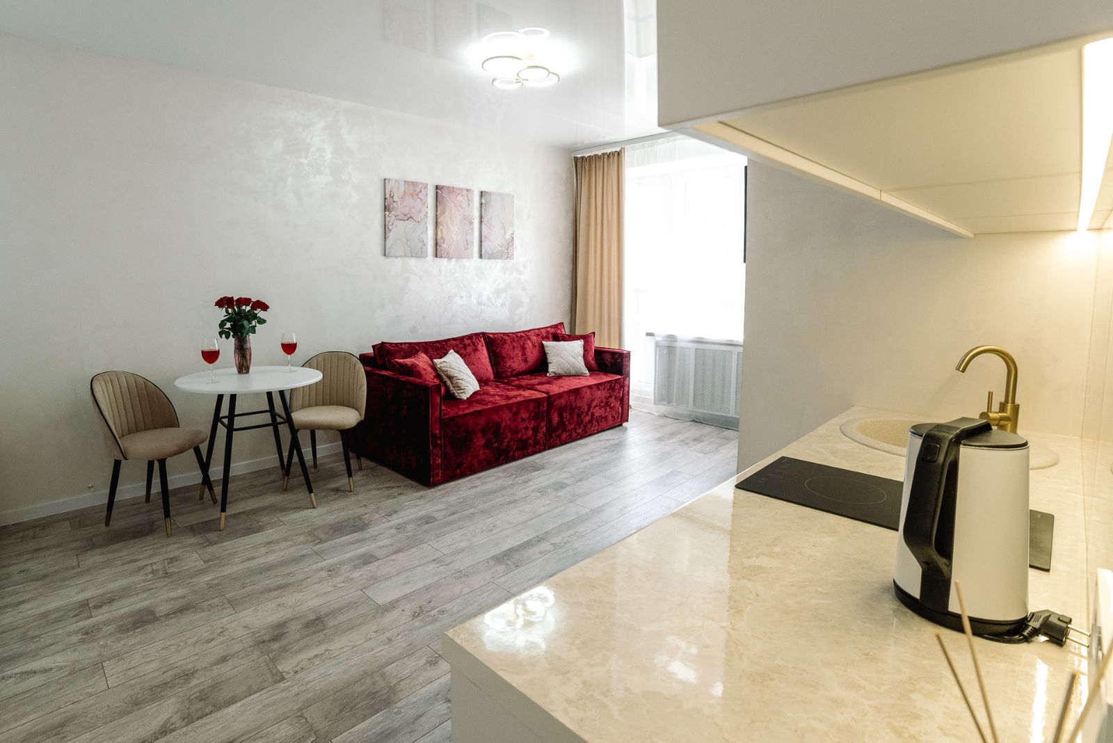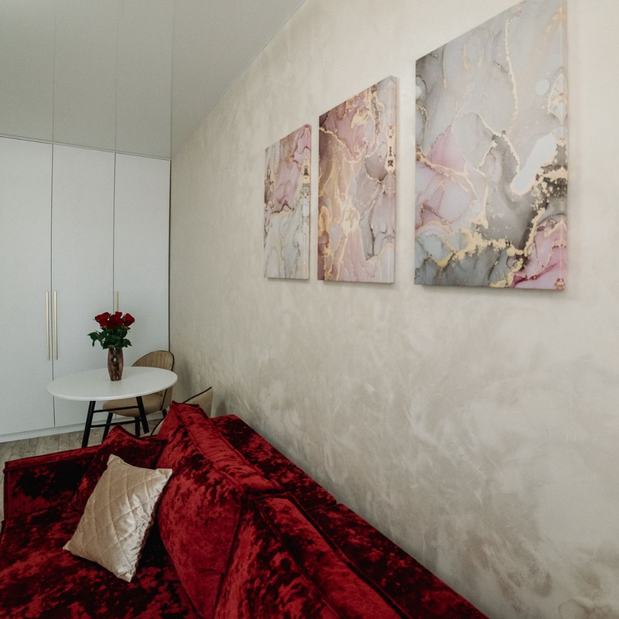 Квартира состоит из гостиной, совмещенной с кухонной зоной, небольшой изолированной спальни, совмещенного санузла.