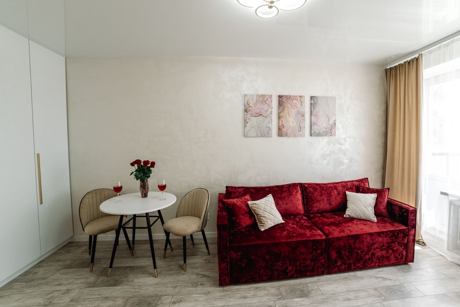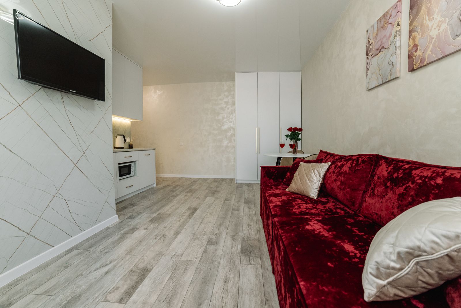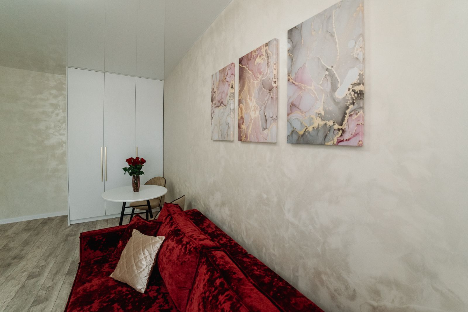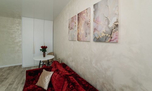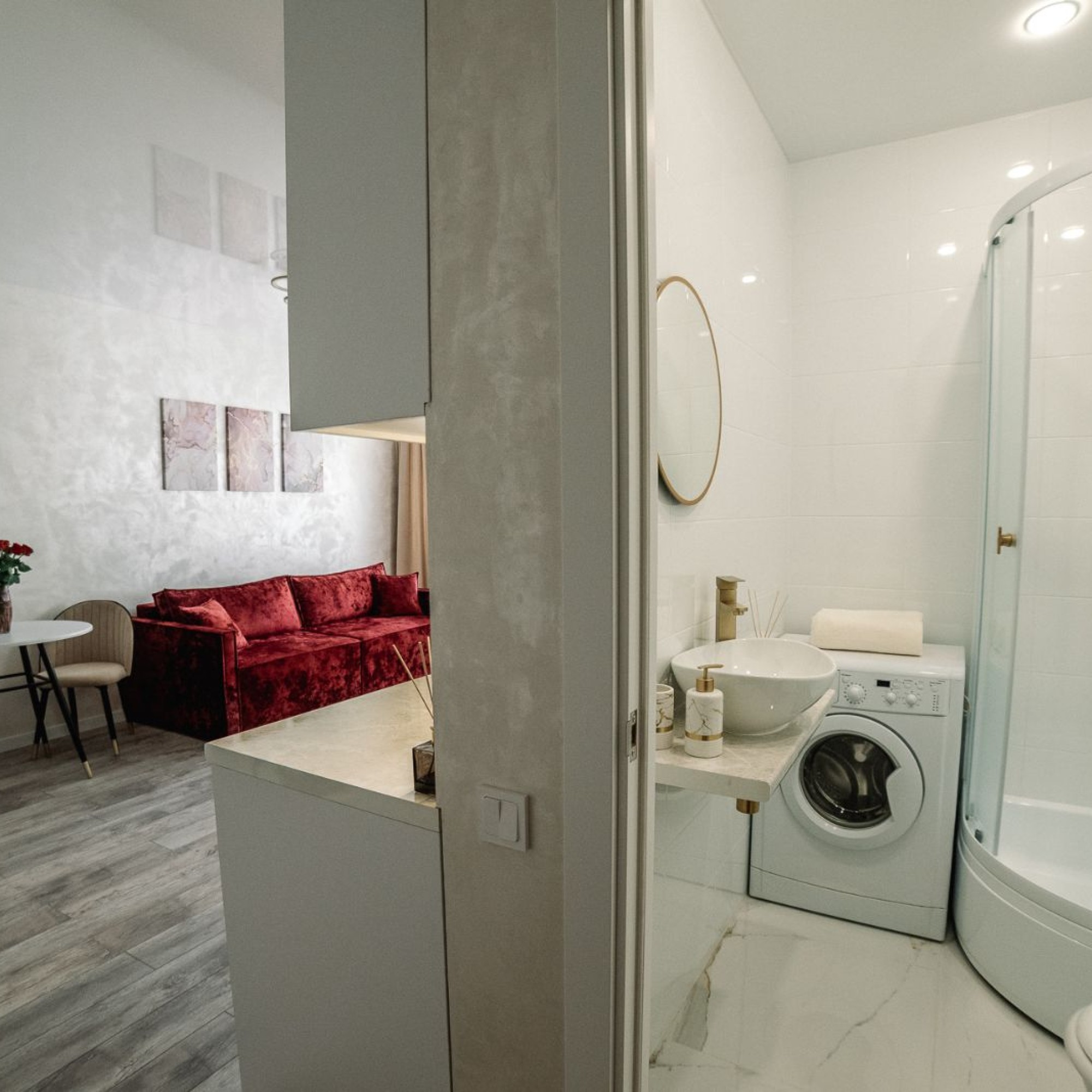 Квартира состоит из гостиной, совмещенной с кухонной зоной, небольшой изолированной спальни, совмещенного санузла.